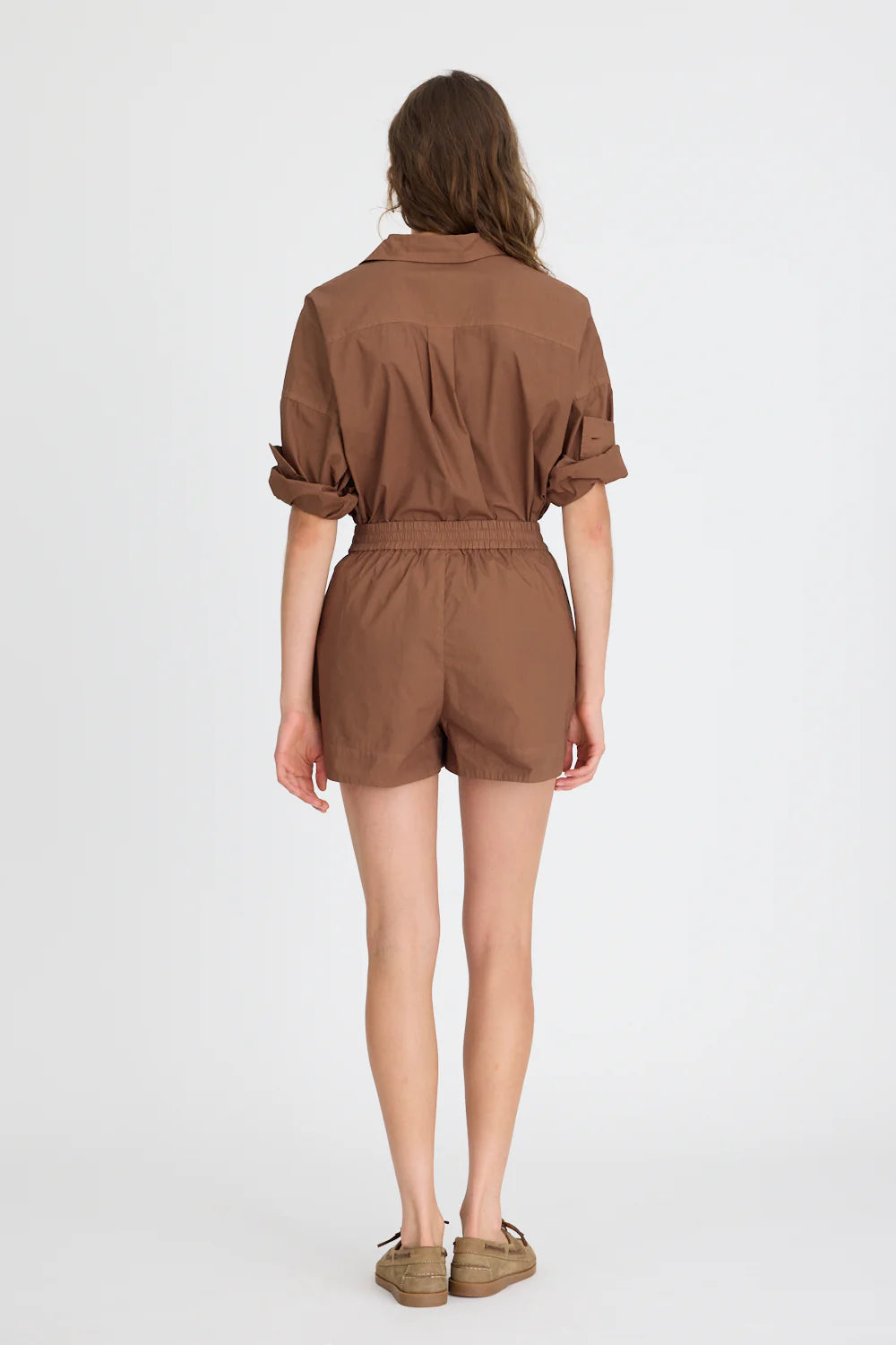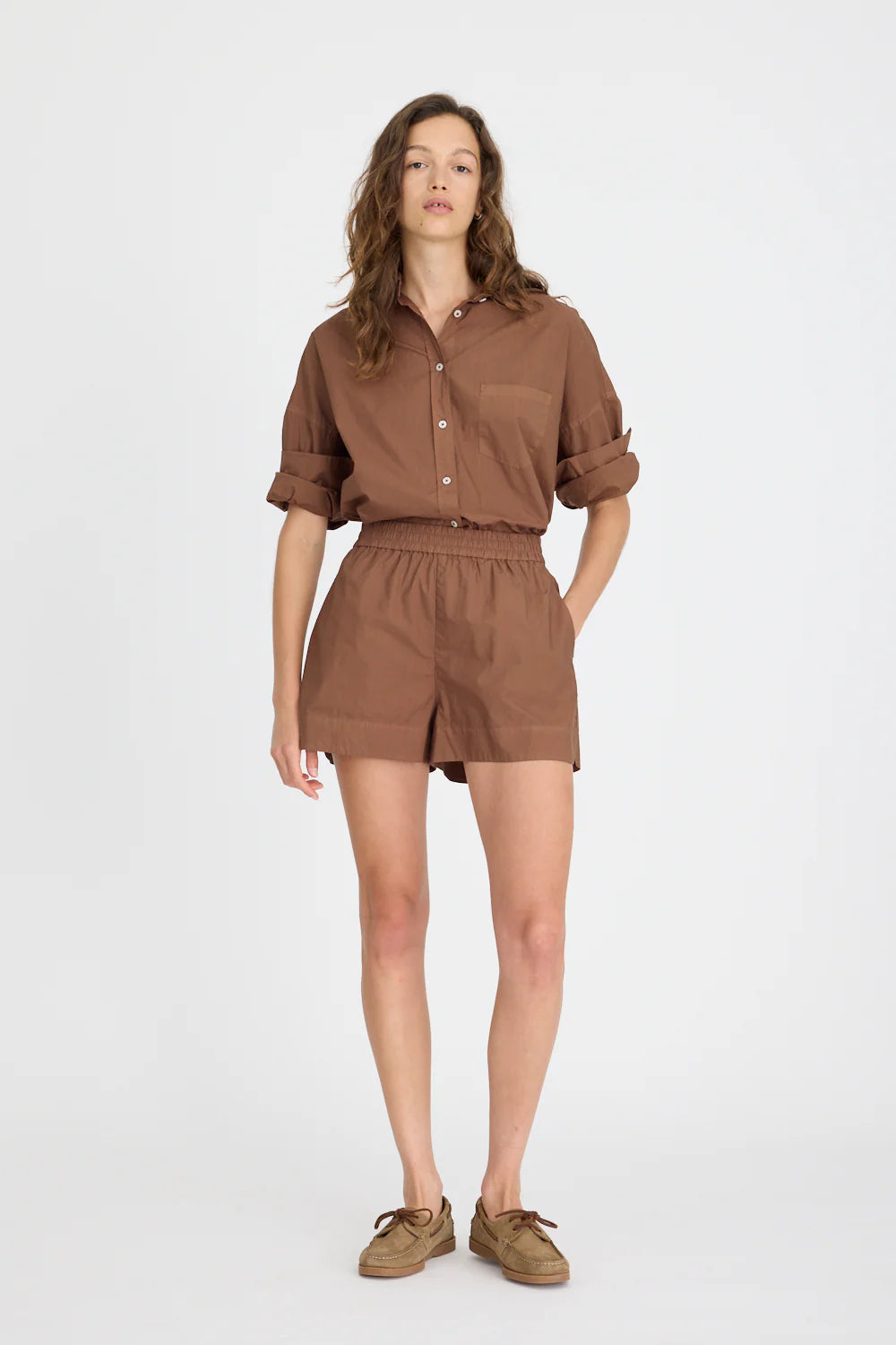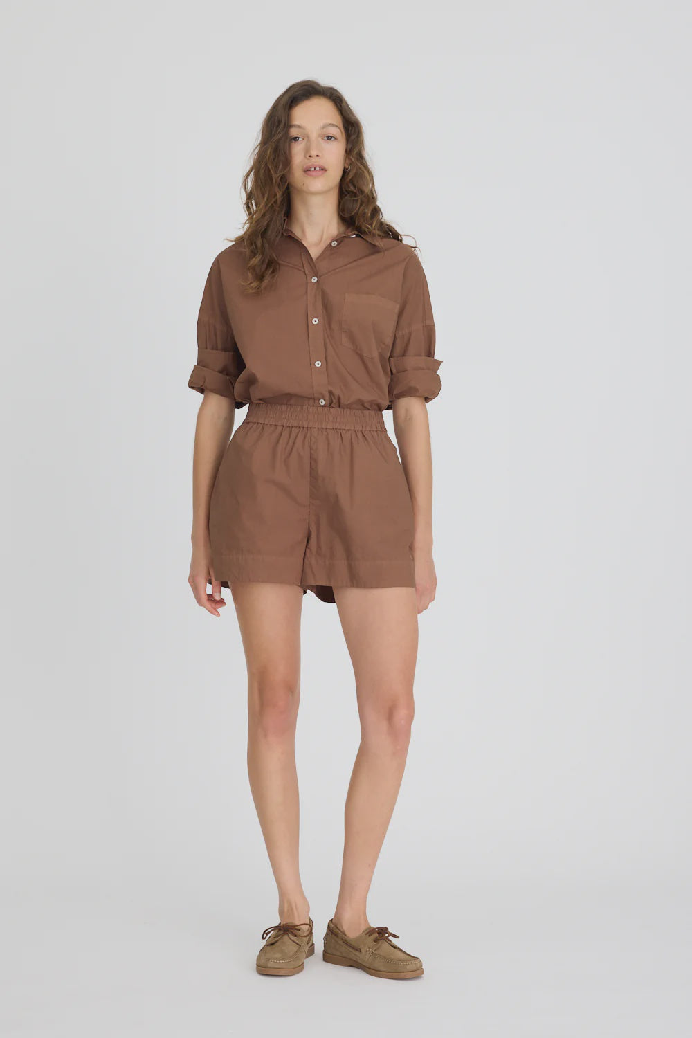 LMND Chiara Shorts in Macchiato. Upgrade your summer wardrobe with our Chiara Shorts. Made from premium 100% cotton poplin, these shorts offer a perfect blend of style and ease. The elasticated waistband ensures a comfortable fit, while the loose legs and side slip pockets provide a relaxed and casual feel.