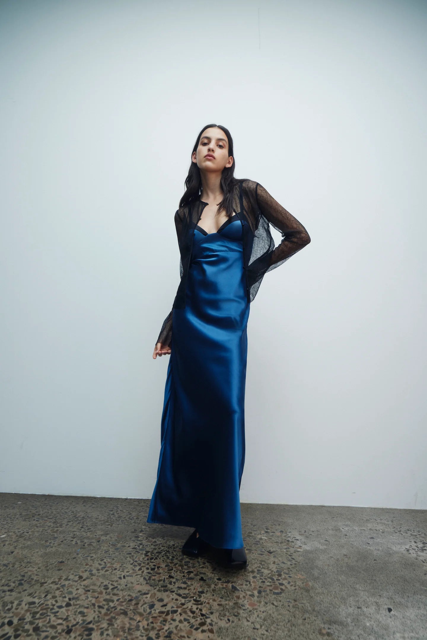 The Depeche Balconette Gown in Dark Blue is a bias cut occasion silhouette, crafted from a luxe silk fabrication with a satin finish. It features a structured bodice with an underbust seam detail, elasticated satin straps and contrast panelling for a statement finish. The back cut out is finished with a hook closure and gives way to a bias cut skirt that softly skims down the body to a full length hem.