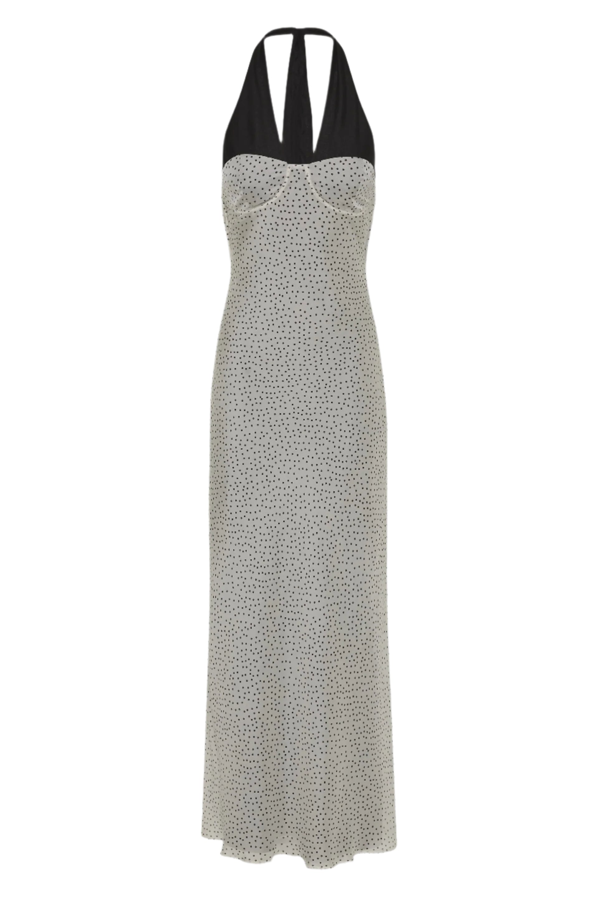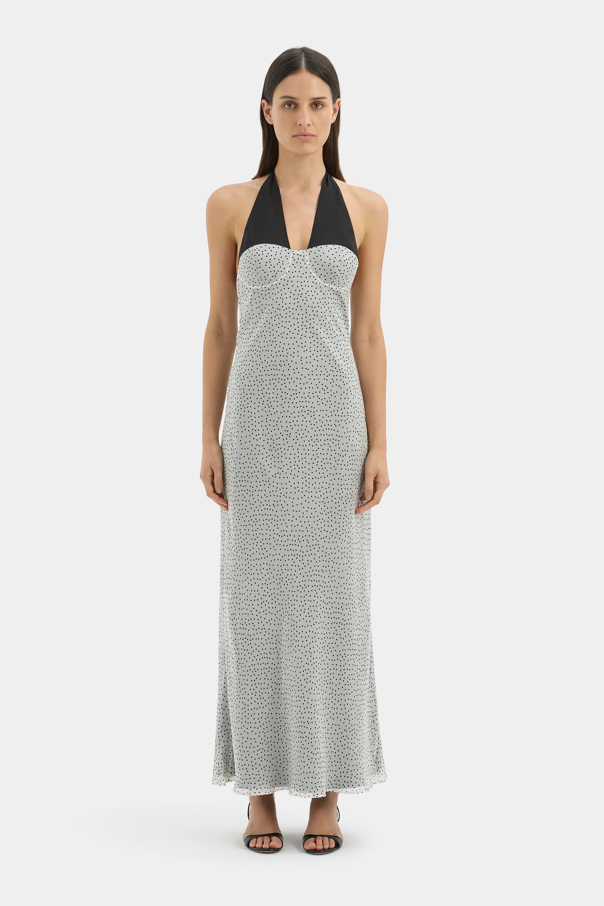 Sir Lisander Halter Midi Dress in Polka Dot Bianca. The Lisander Halter Midi Dress in Polka Dot Bianca is a feminine silhouette crafted from lightweight semi-sheer silk chiffon, fully lined throughout. Cut on the bias for a soft drape, it features an adjustable halter neck, cup design through the bust and a soft cowl back.