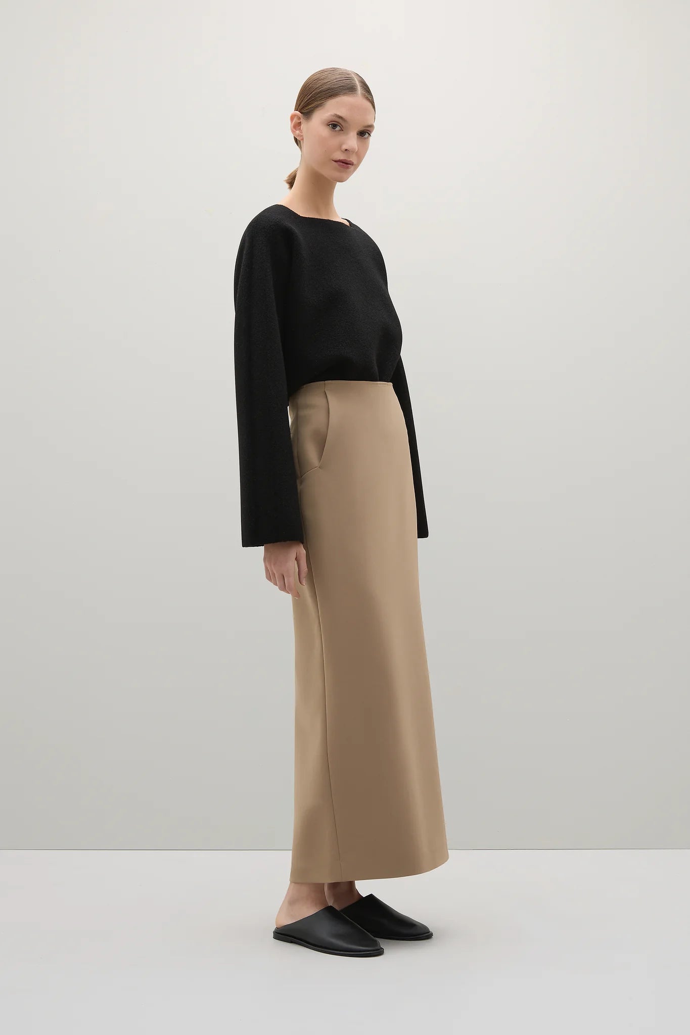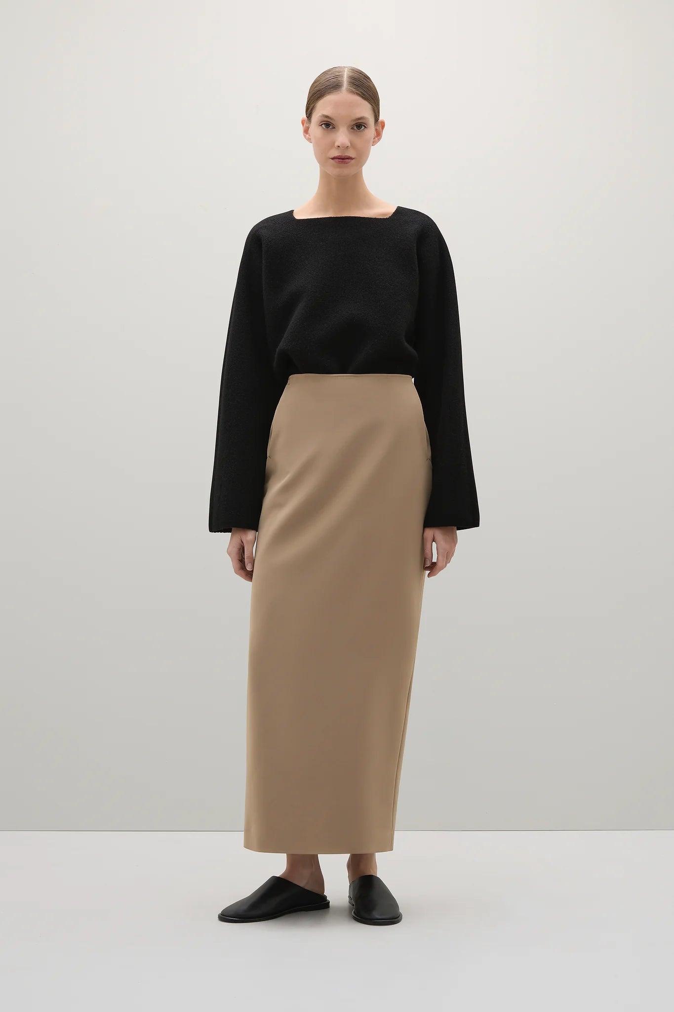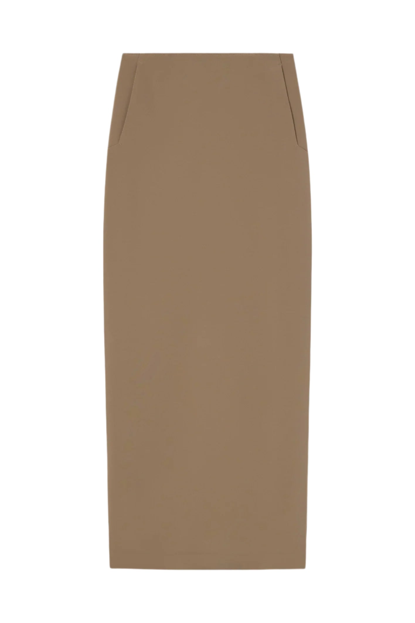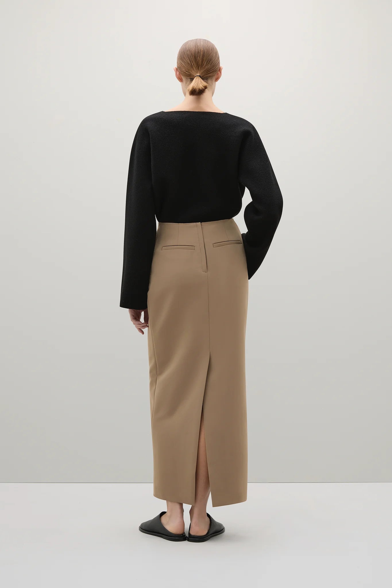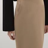 A Emery Innes Skirt in Fawn. The Innes Skirt is a classic pencil silhouette, designed with a stepped-in front pocket, two back welt pockets, and a centre back vent for ease of movement. Finished with a clean hidden zip closure.