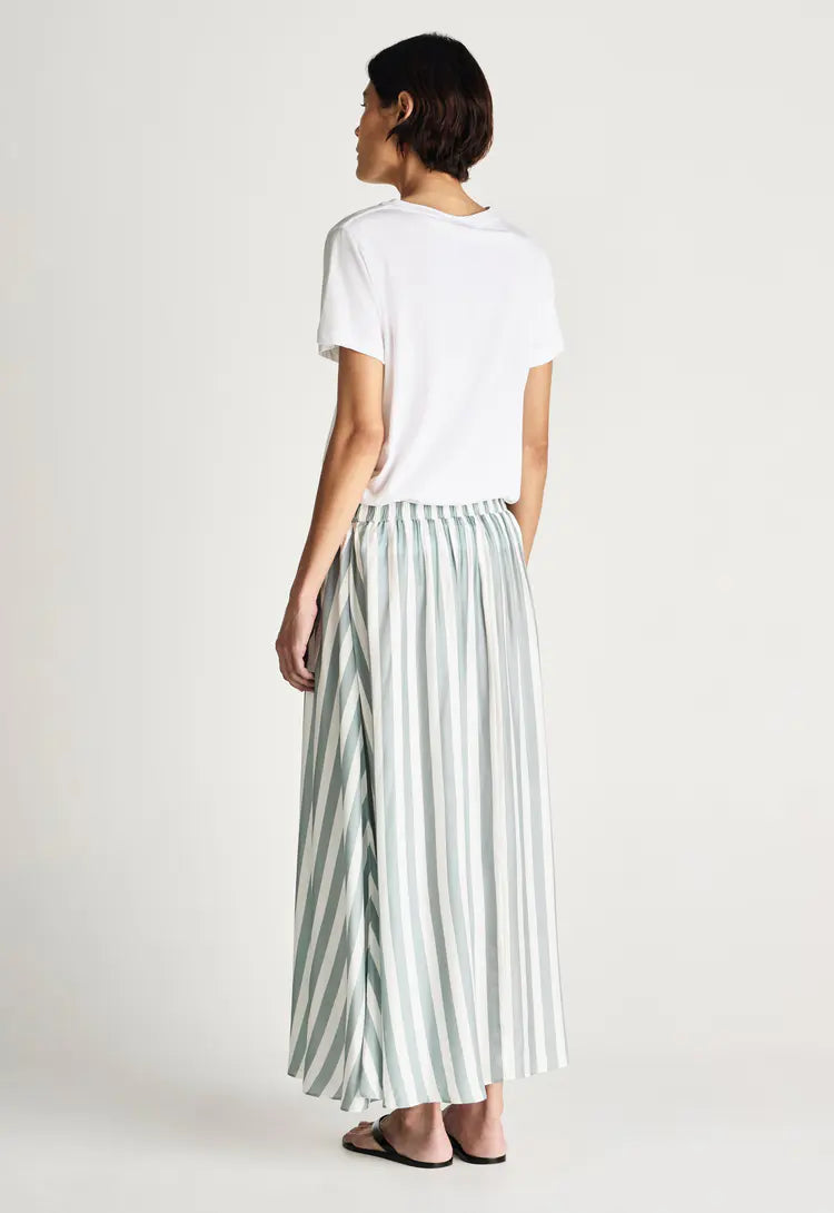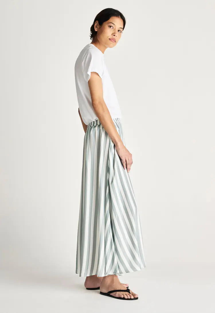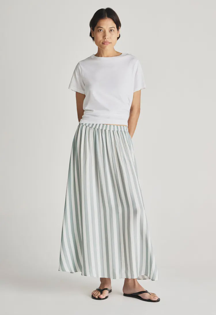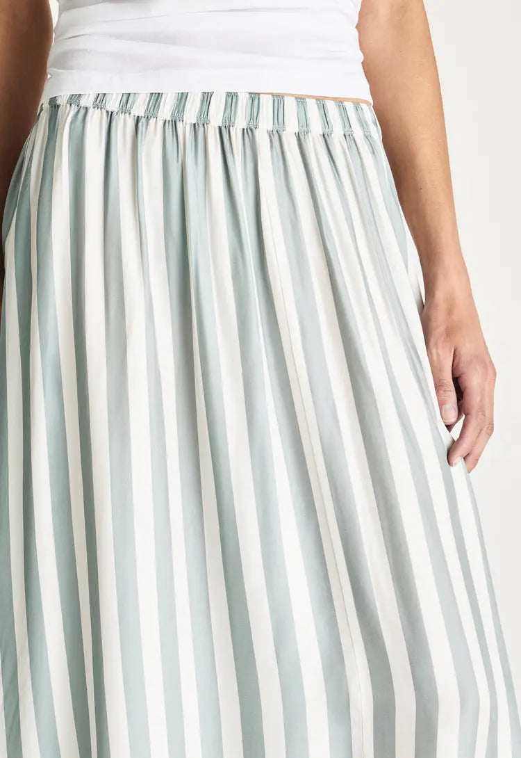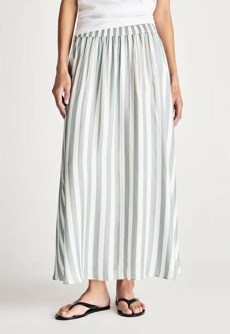 Jac and Jack Buoys Skirt in Fennel and Ecru. This silk-viscose skirt features a soft drape and subtle sheen, printed with Jac + Jack’s own custom stripe design in our own unique and nuanced colours. Light and fluid, it brings an elevated yet effortless feel, ideal for refined summer pieces with a touch of individuality.