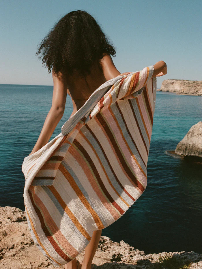 Featuring hand-drawn stripes in varying widths, ‘IRIS’ has a natural wobble that lends an earthy feel to its rainbow-hued palette. Named for the Greek goddess who bridged sky and land by way of the rainbow, this print captures that same spirit: organic in form, playful in colour, and softly irregular by design.