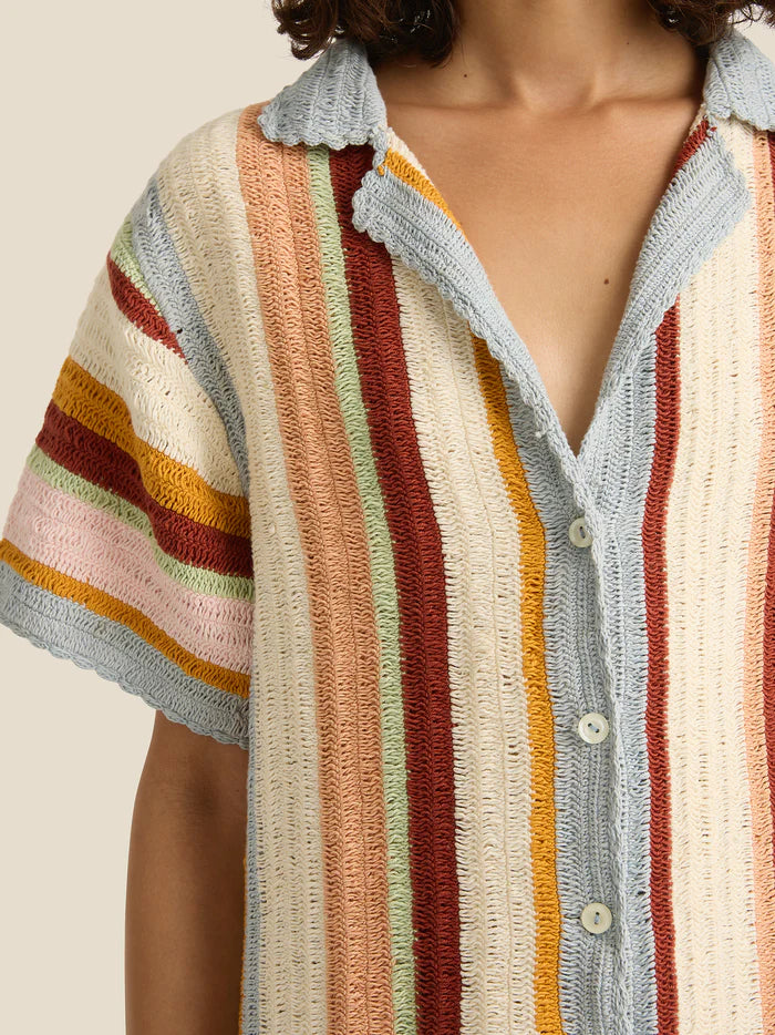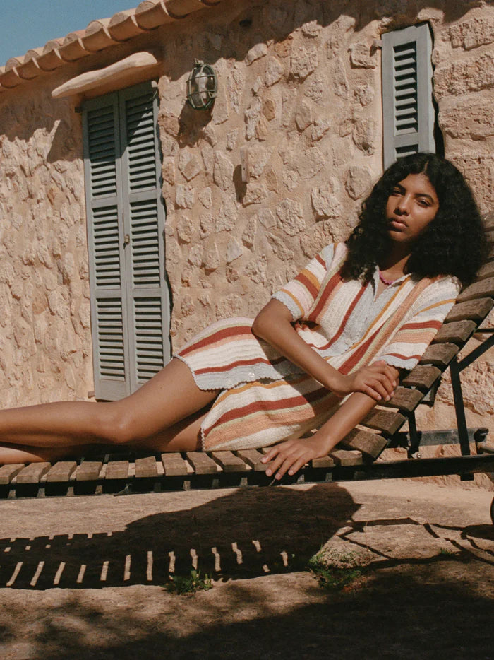 Soleil Soleil Jules Mini Dress in Iris Crochet. Our Jules Mini Dress is crafted from 100% cotton crochet and beautifully handmade in partnership with skilled artisans in India. Effortless by nature, Jules is detailed with relaxed sleeves, a button-up front, and an open collar.