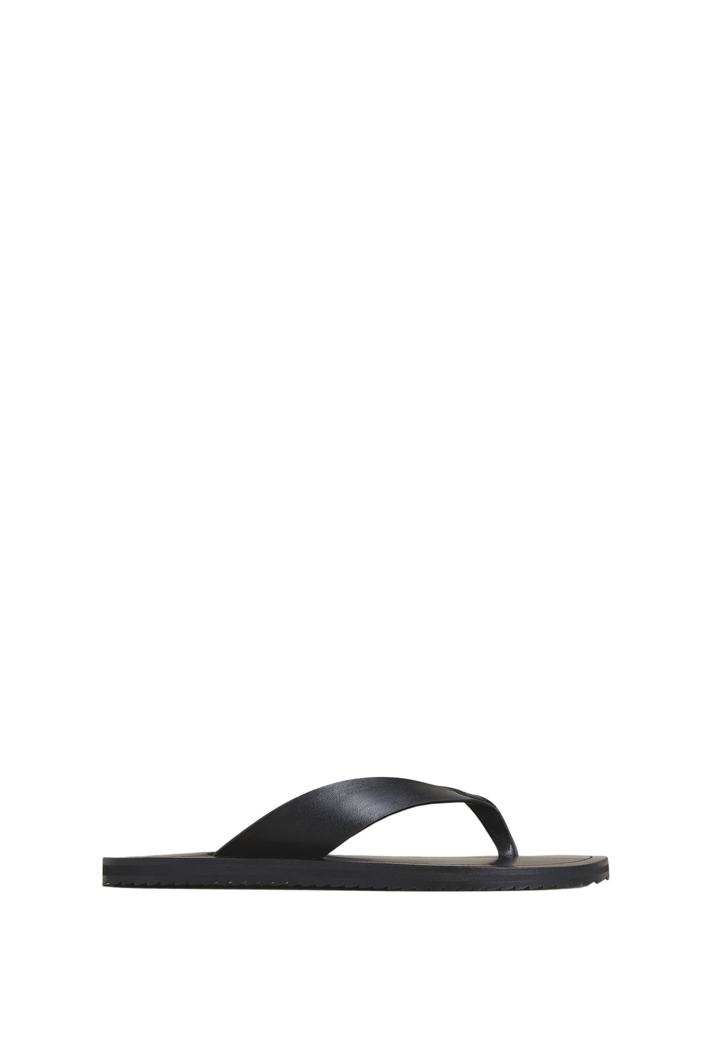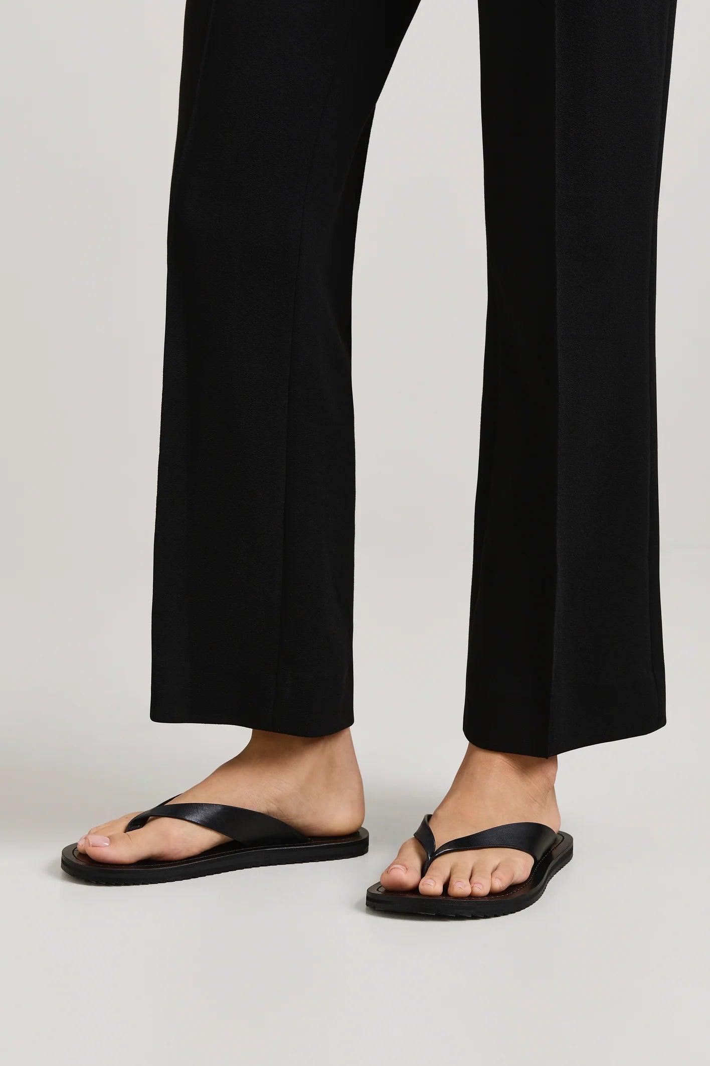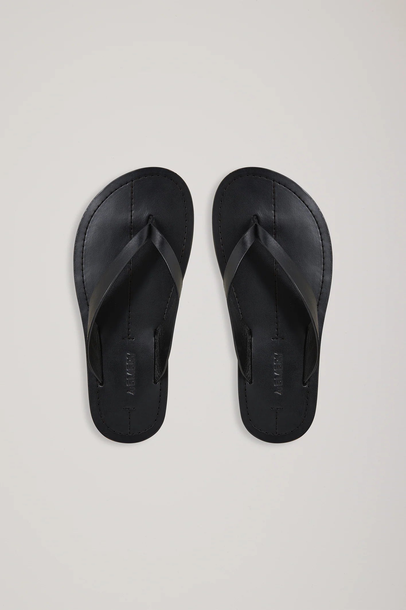 A Emery Flora Sandal in Black. The Flora Sandal is a contemporary flip flop with leather straps that sit atop our new leather footbed with contrast stitching and a rubber tread sole.
