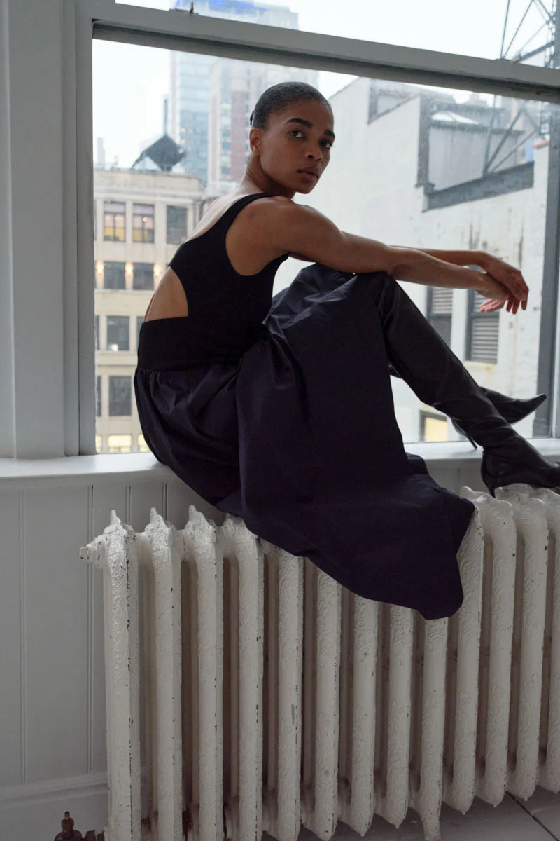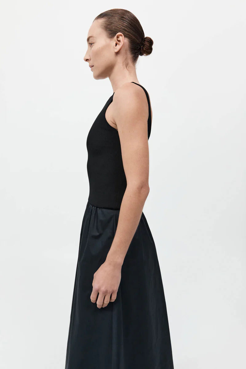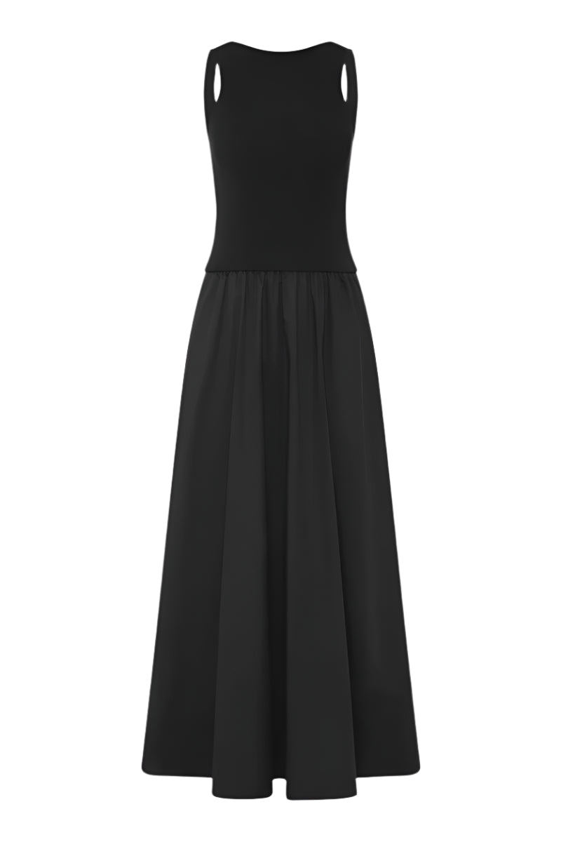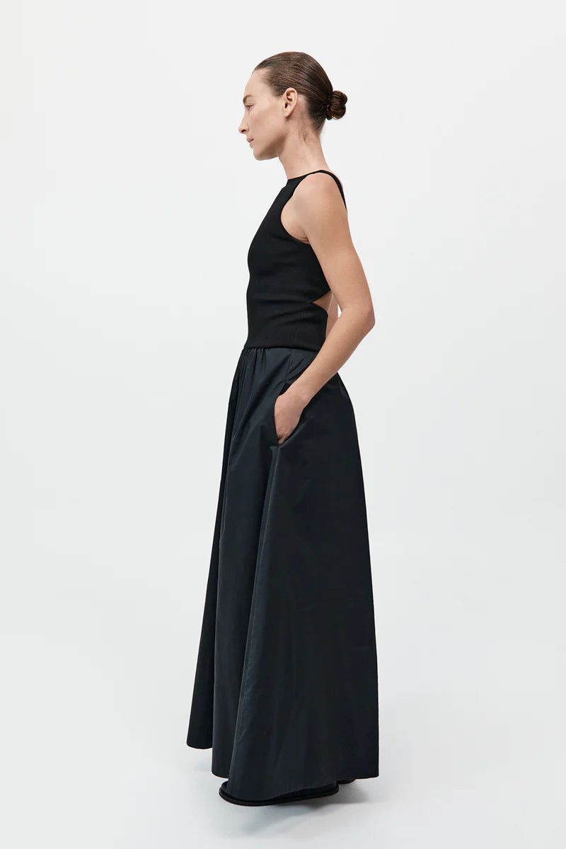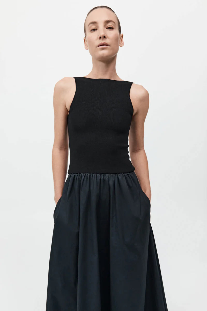 St Agni Bateau Cut Out Dress In Black. The Bateau Cut Out Dress offers a refined silhouette with subtle cut-out detailing. Featuring a fitted knit bodice that flows into a relaxed poplin skirt and maxi length. A versatile wardrobe essential, the Bateau Cut Out Dress transitions effortlessly from day to evening.