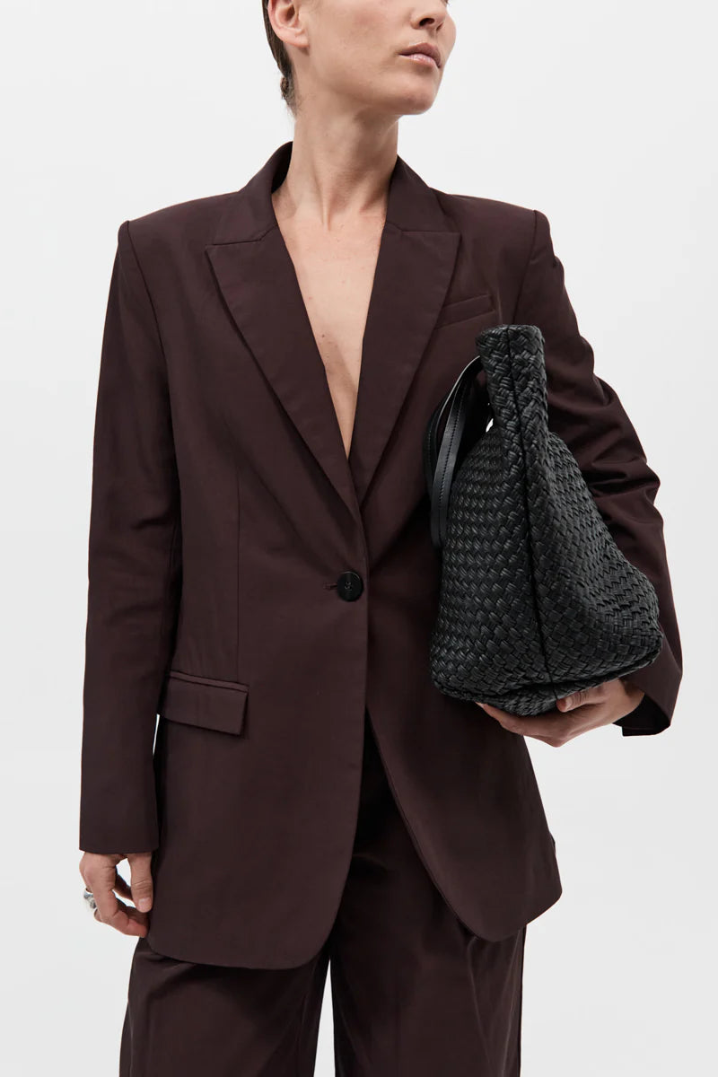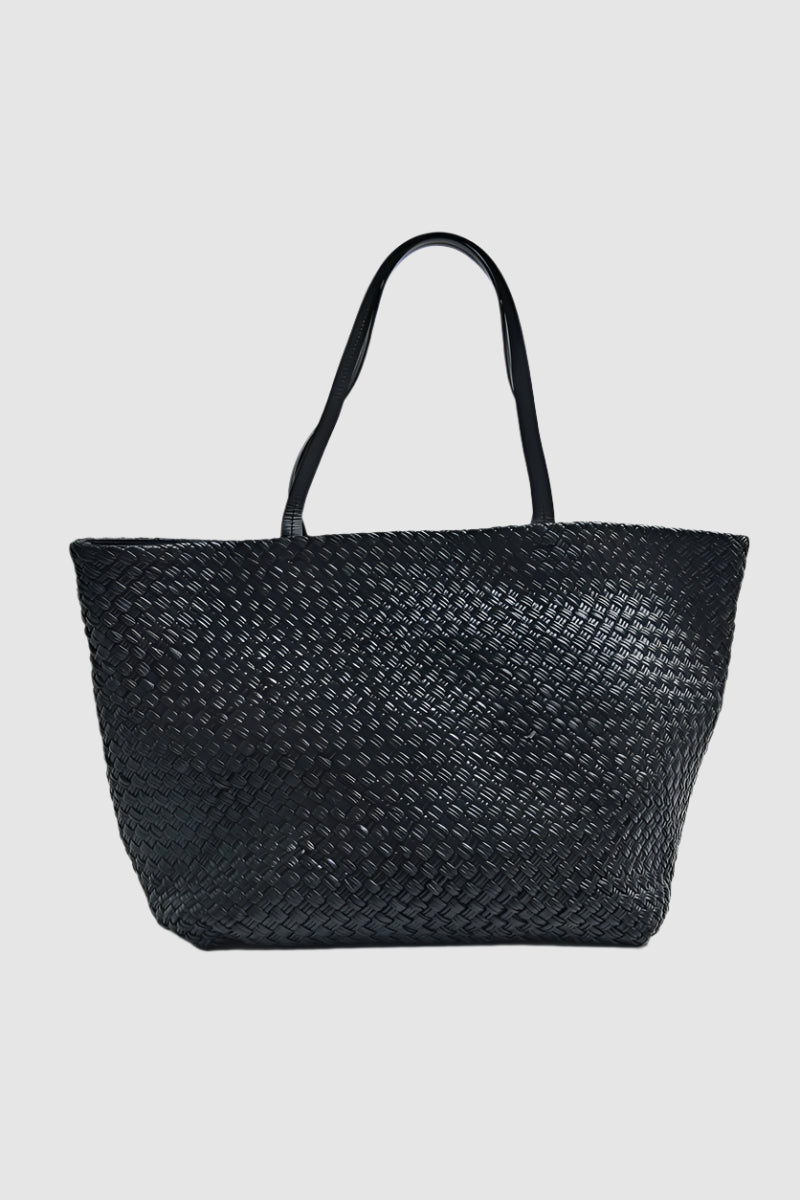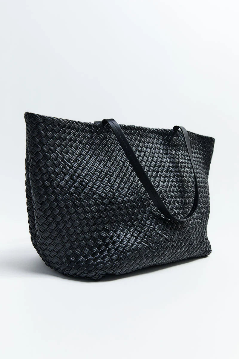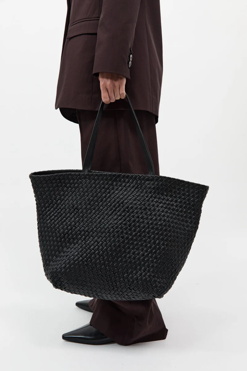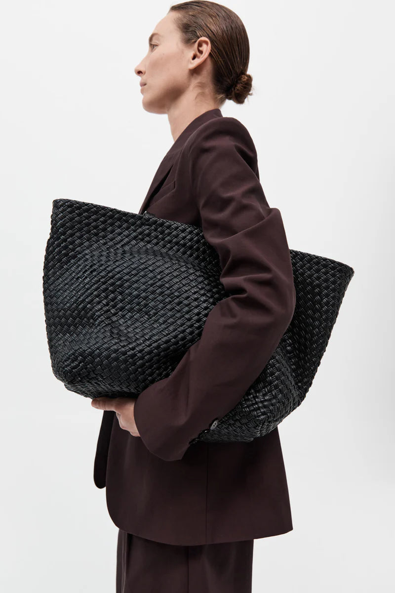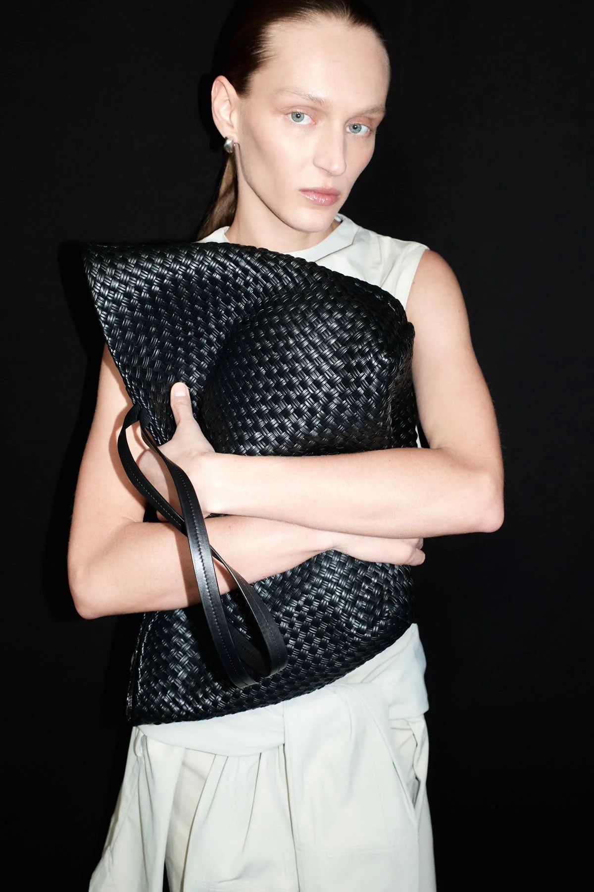 St Agni Large Woven Trapeze Bag in Black. The Large Woven Trapeze Bag embodies refined craftsmanship, featuring a distinctive trapezoid silhouette and intricately woven body. Designed with double straps, magnetic closure and an internal leather pouch, the Large Woven Trapeze Bag offers functionality and generous storage for the essentials.