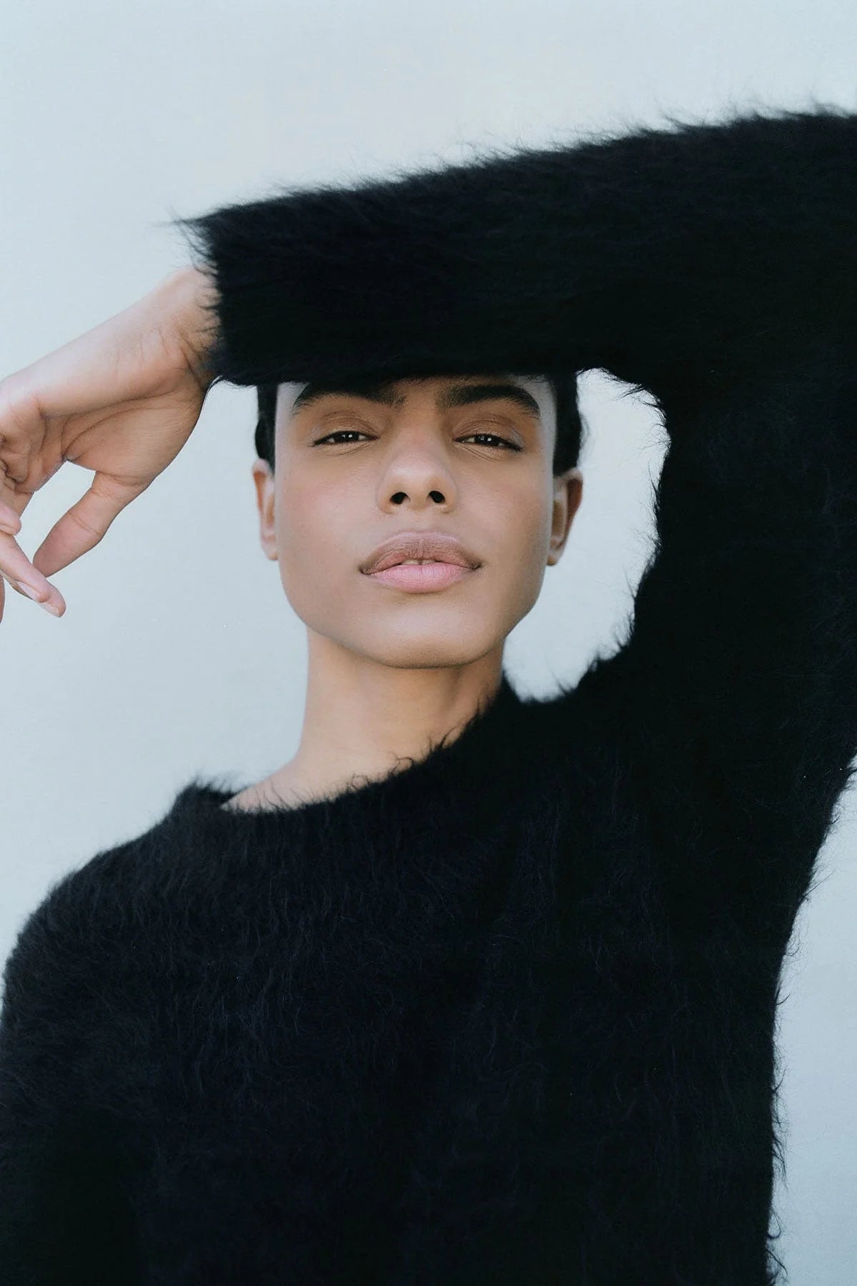 Plush knit, mock neck, longsleeve, slightly cropped, relaxed fit