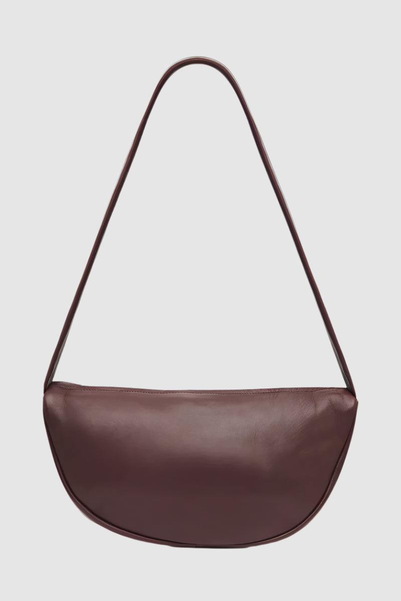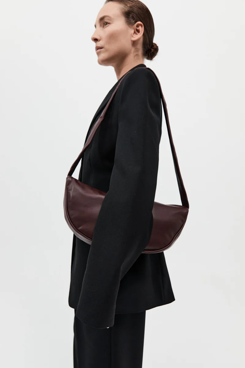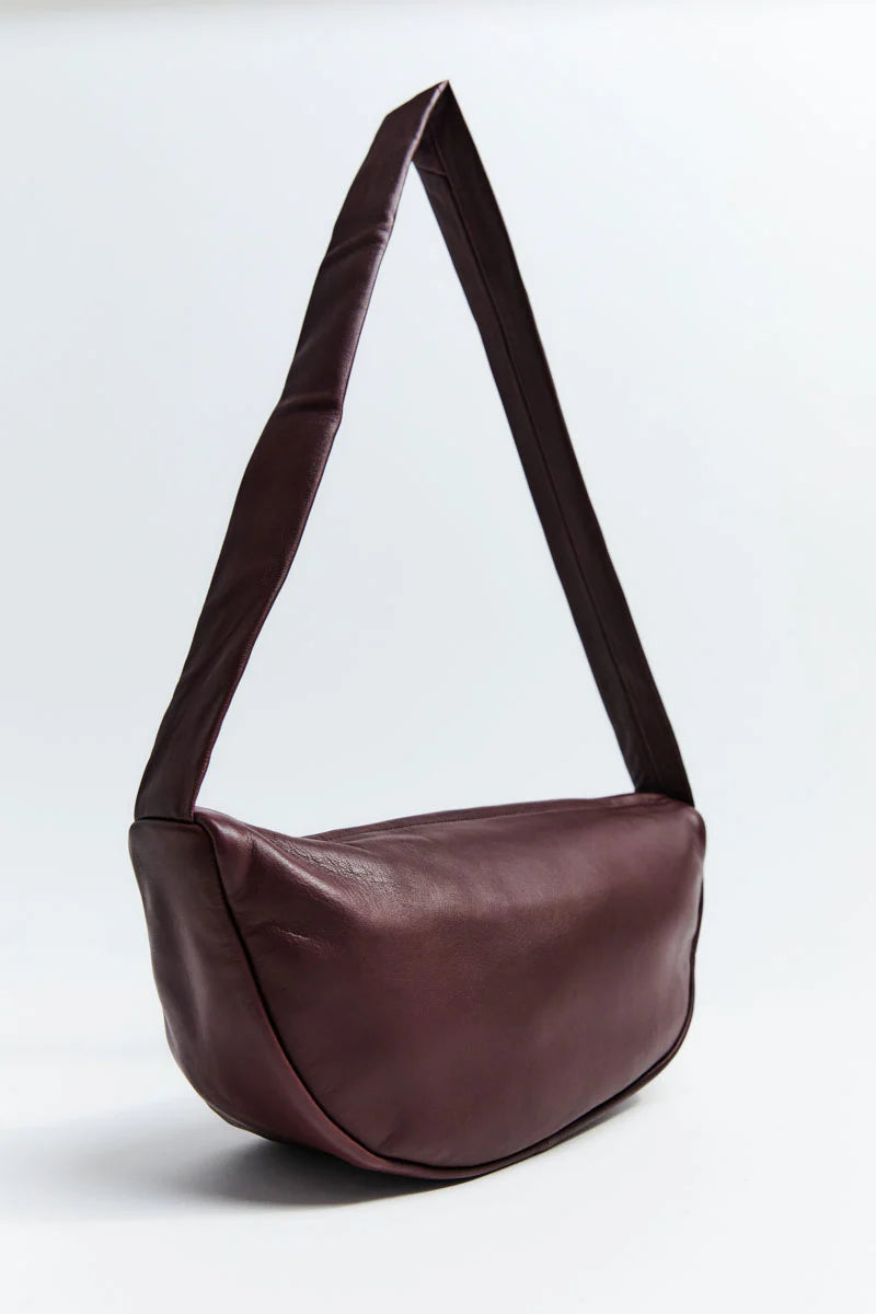 St Agni Soft Crescent Bag in Plum. The Soft Crescent Bag combines contemporary style with functionality. Featuring a sleek croissant shape and is crafted from 100% Lambskin. Designed for effortless wear, the Soft Crescent Bag makes an everyday accessory for the modernist on the move.