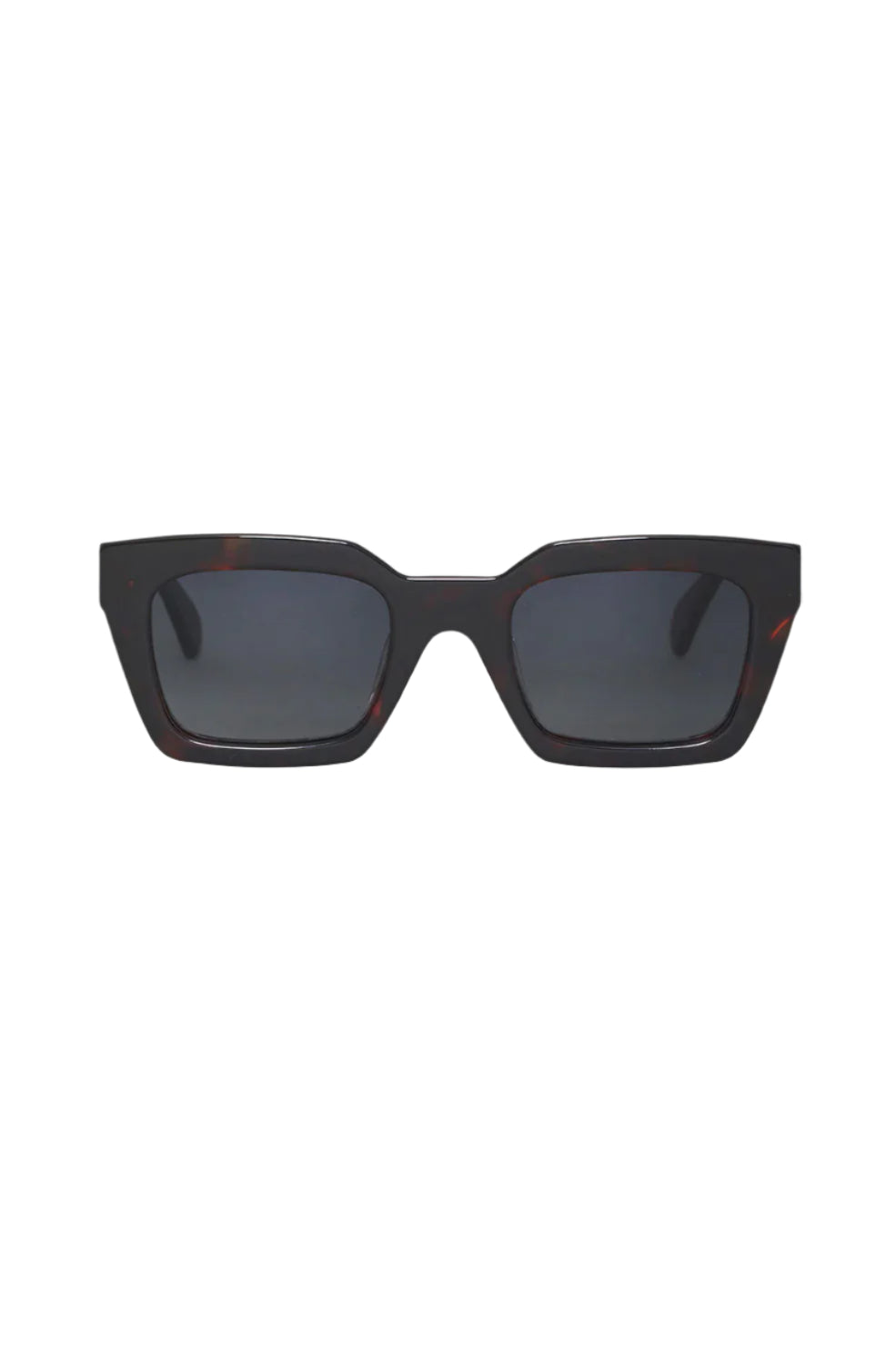 Anine Bing Indio Sunglasses in Dark Tortoise. The best-selling Indio Sunglasses feature oversized square frames accented with a gold-tone ANINE BING monogram at each temple. This pair is made from dark tortoise acetate fixed with black lenses. Polarized with UV400 protection.