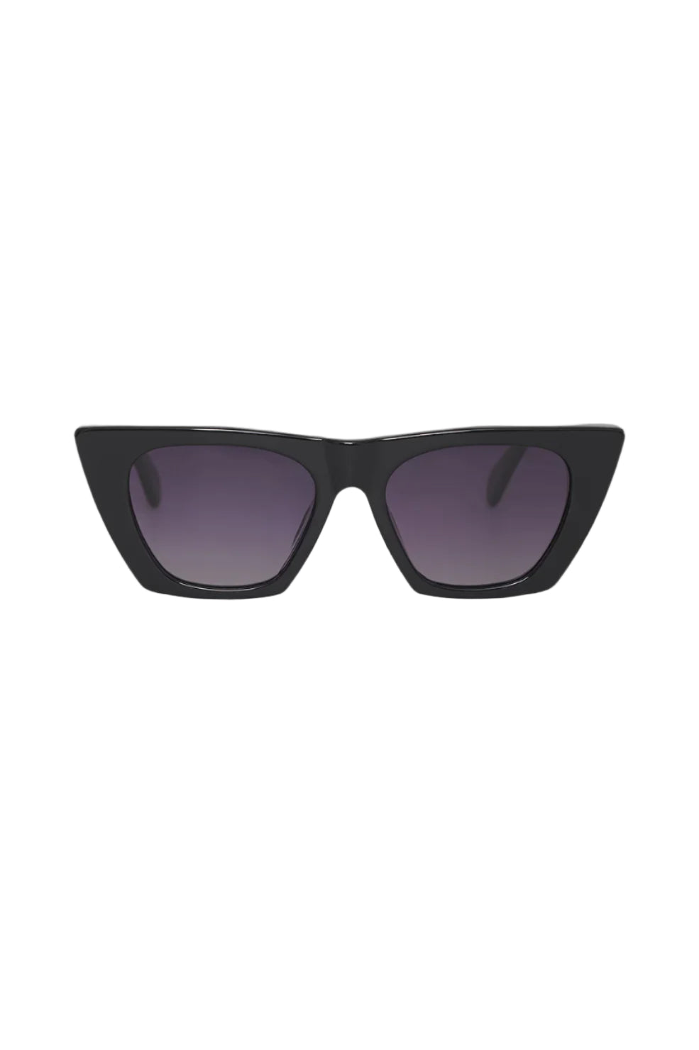 Anine Bing Paris Sunglasses in Black. The Paris Sunglasses feature an angular, sharp square shape with black acetate frames and black gradient lenses polarized with UV400 protection. Accented with gold-tone branding at the wearer's left arm.