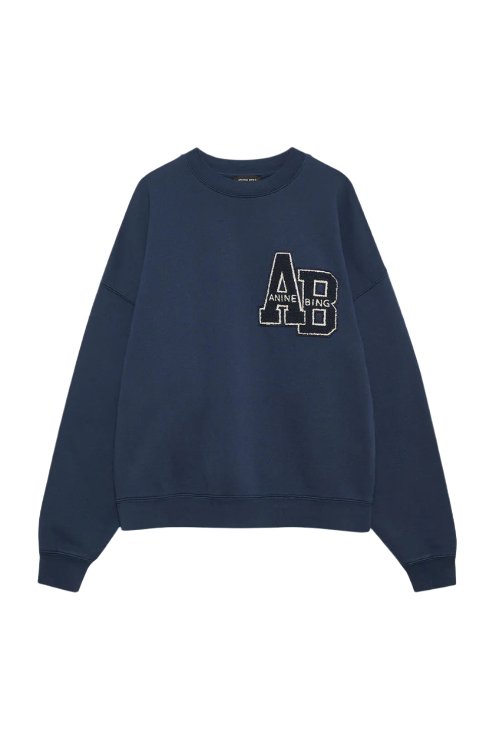 Anine Bing Miles Oversized Sweatshirt Letterman in Washed Navy. An oversized crewneck pullover made from midweight 100% cotton fleece in washed navy that's brushed on the inside.
