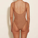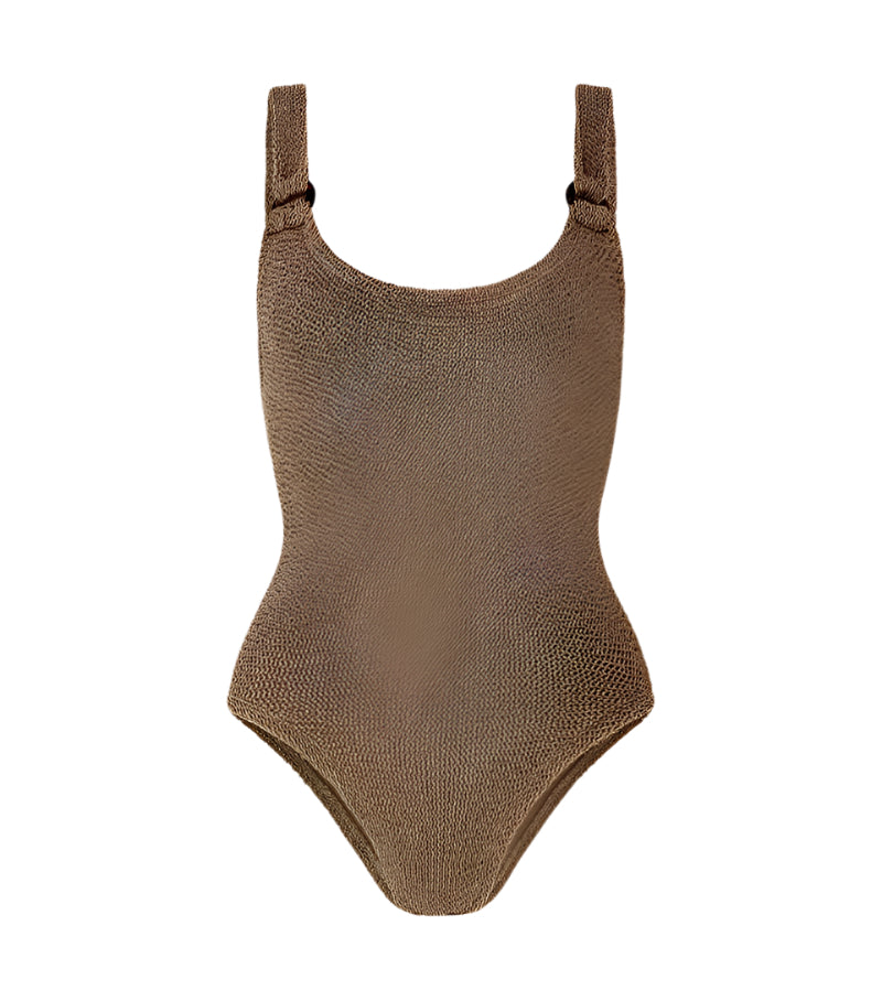 Hunza G Domino Swim in Metallic Cocoa. Our ingenious Original Crinkle™ fabric is designed to flex and sculpt to your body, which is why all Hunza G items are made in one size only.