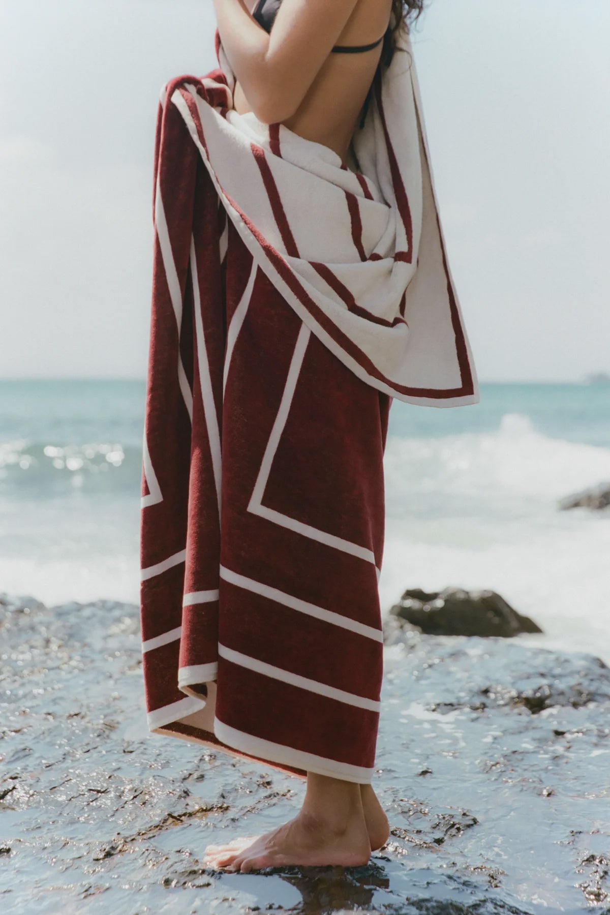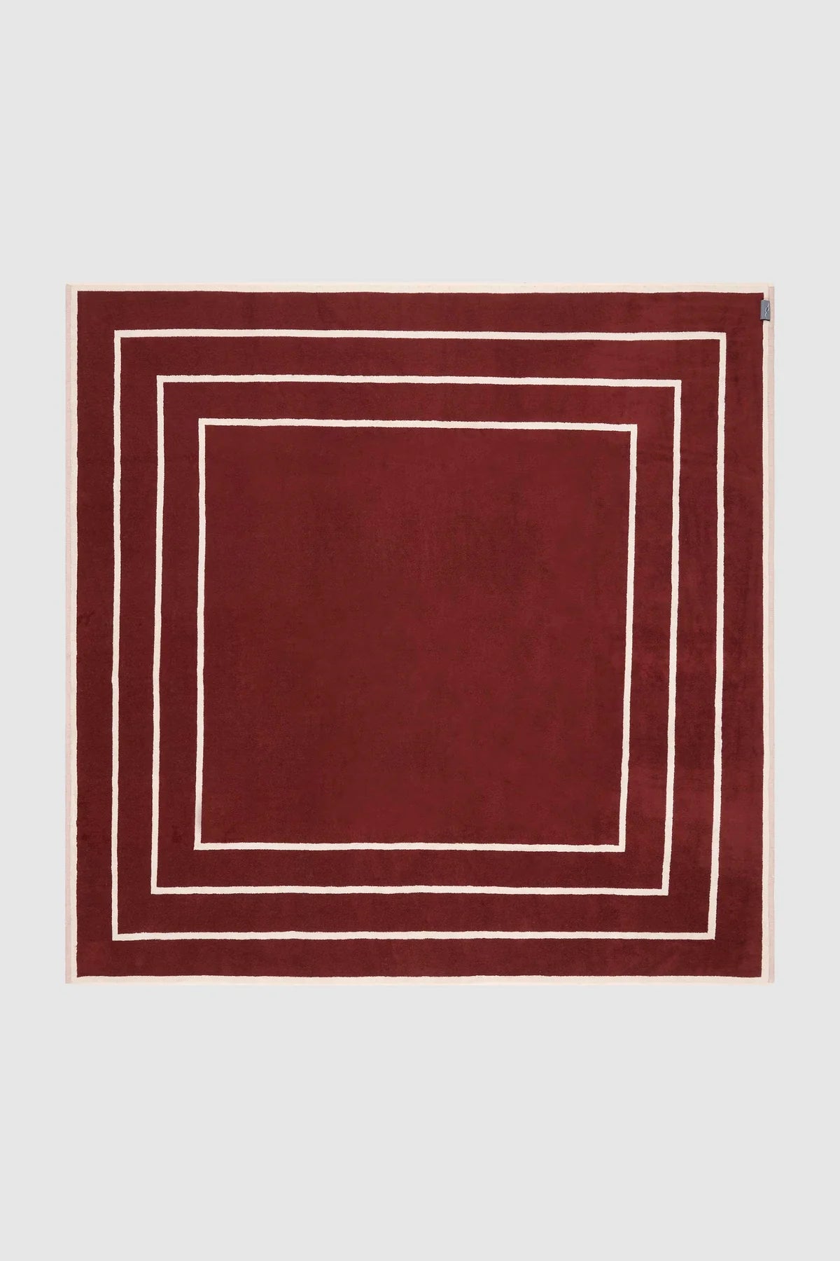 St Agni Pool Towel in Mahogany. Generously sized and luxuriously soft, the Pool Towel is crafted from 100% cotton. Featuring a square shape with a geometric border and contrast tone. The Pool Towel is ideal for sun-soaked days by the water.