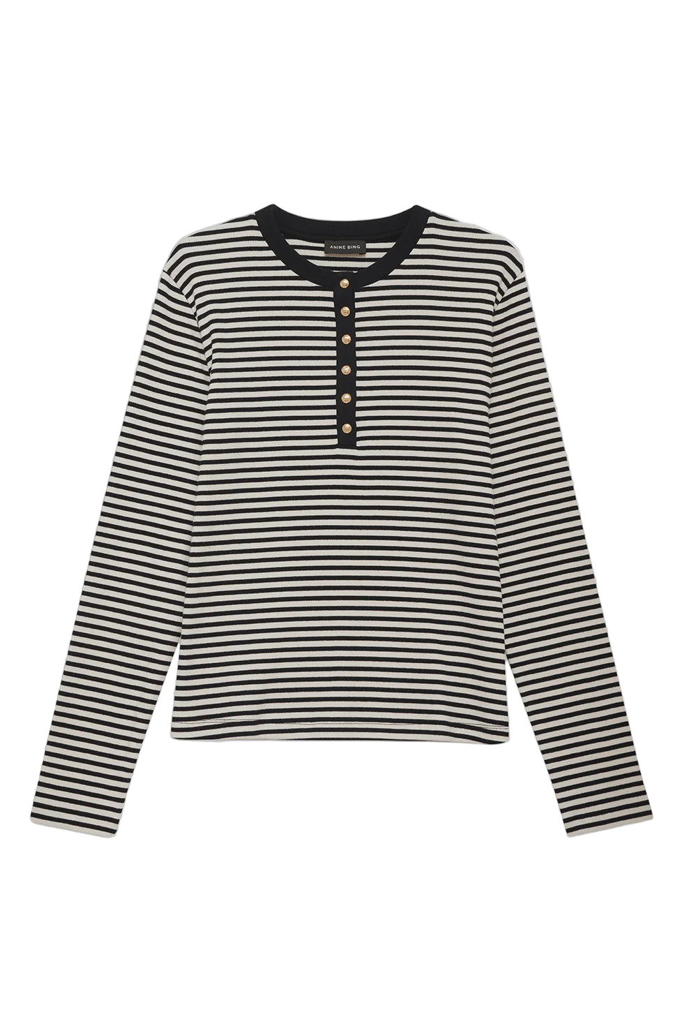 Anine Bing Alessia Long Sleeve Tee in Cream and Black Stripe. The Alessia Long Sleeve Tee is a modern Henley made from a dense cotton-spandex blend with an all-over ribbed texture and a soft hand. This elevated basic features a high crew neckline and gold monogram snap buttons along the front placket.