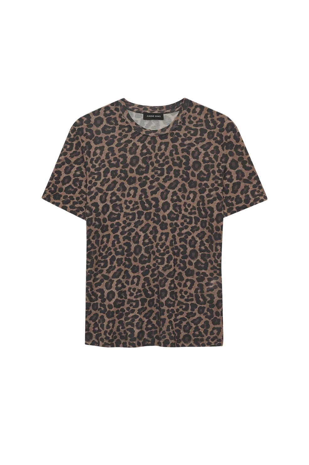 Anine Bing Sylvie Tee in Black and Brown Leopard. A short sleeve crewneck tee in a super fine, sheer jersey fabrication in a vintage-inspired leopard print.