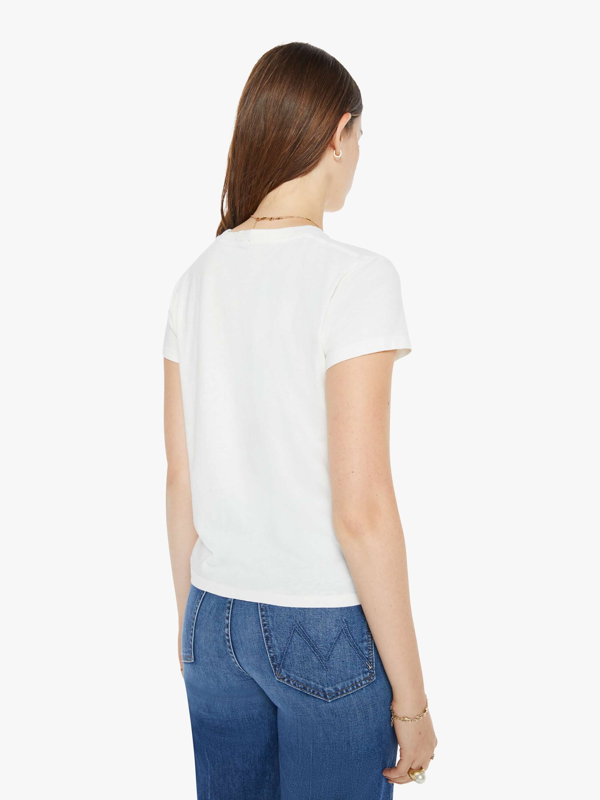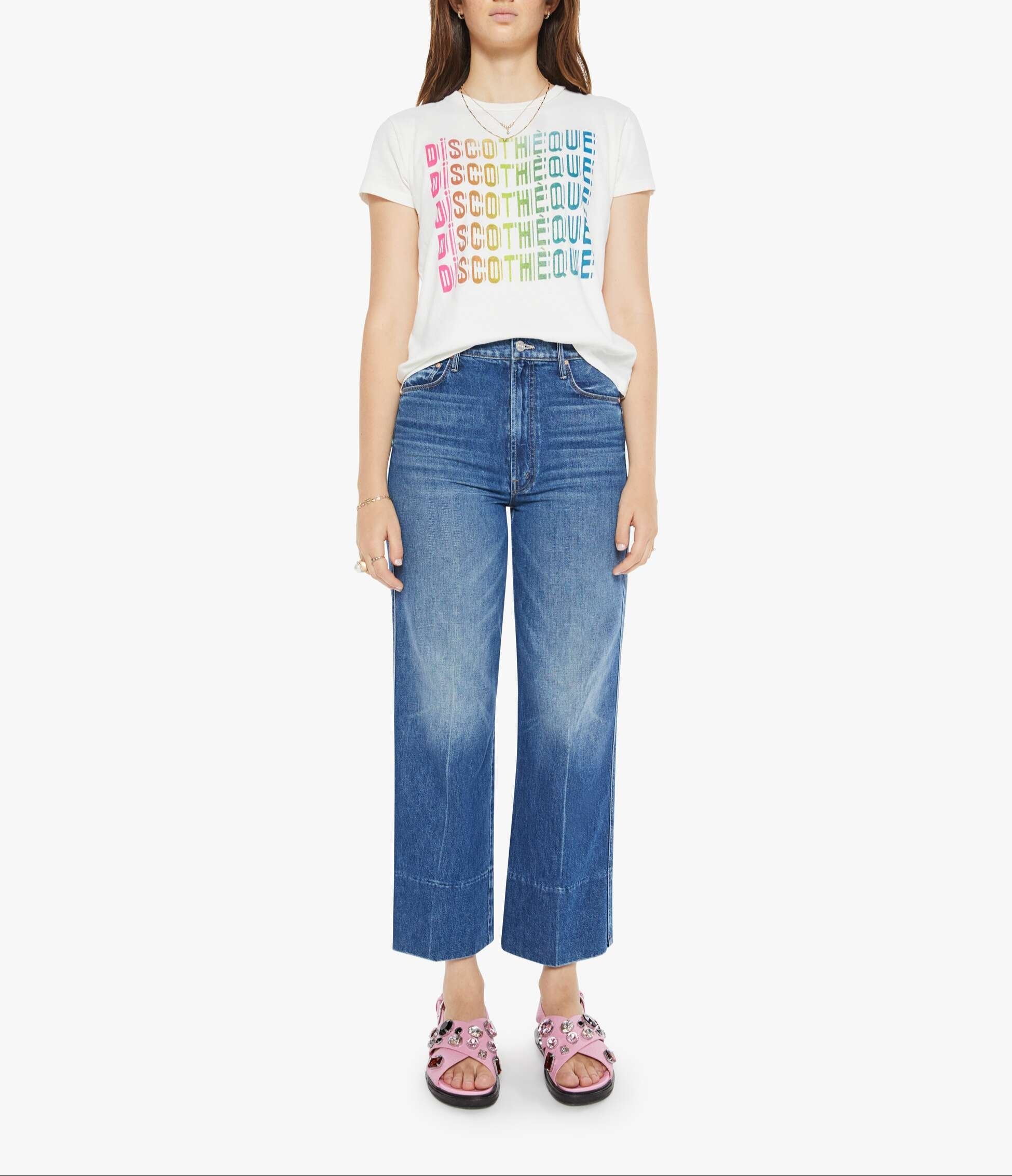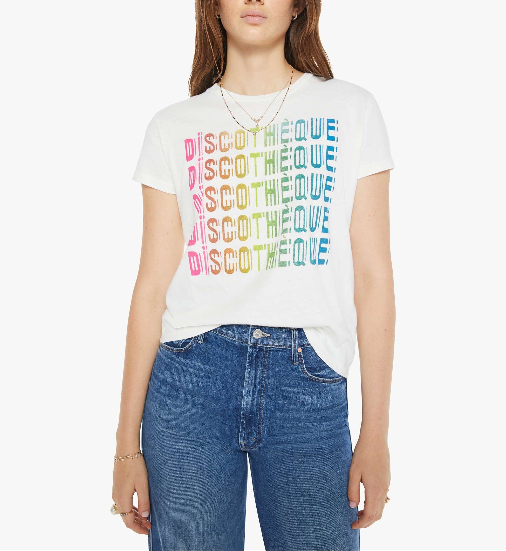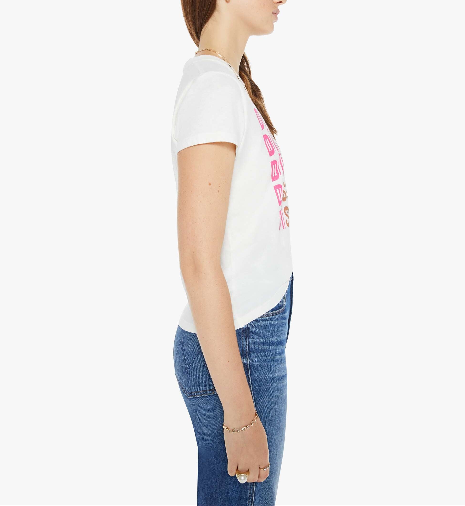 Mother The Boxy Goodie Goodie in Discotheque Fluff. Let's boogie. A soft crewneck with a slim fit for a vintage look and feel. Made from a recycled cotton blend in white, the tee features a rainbow text graphic.