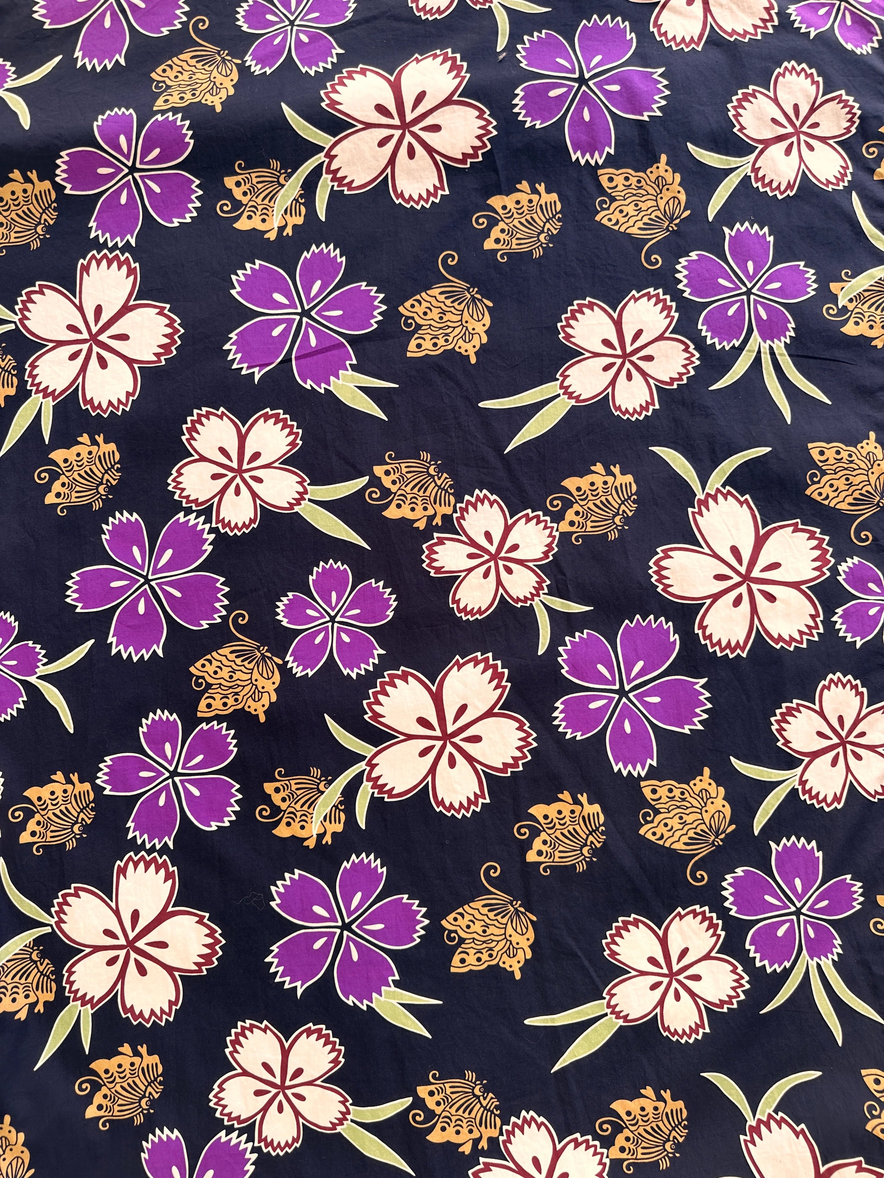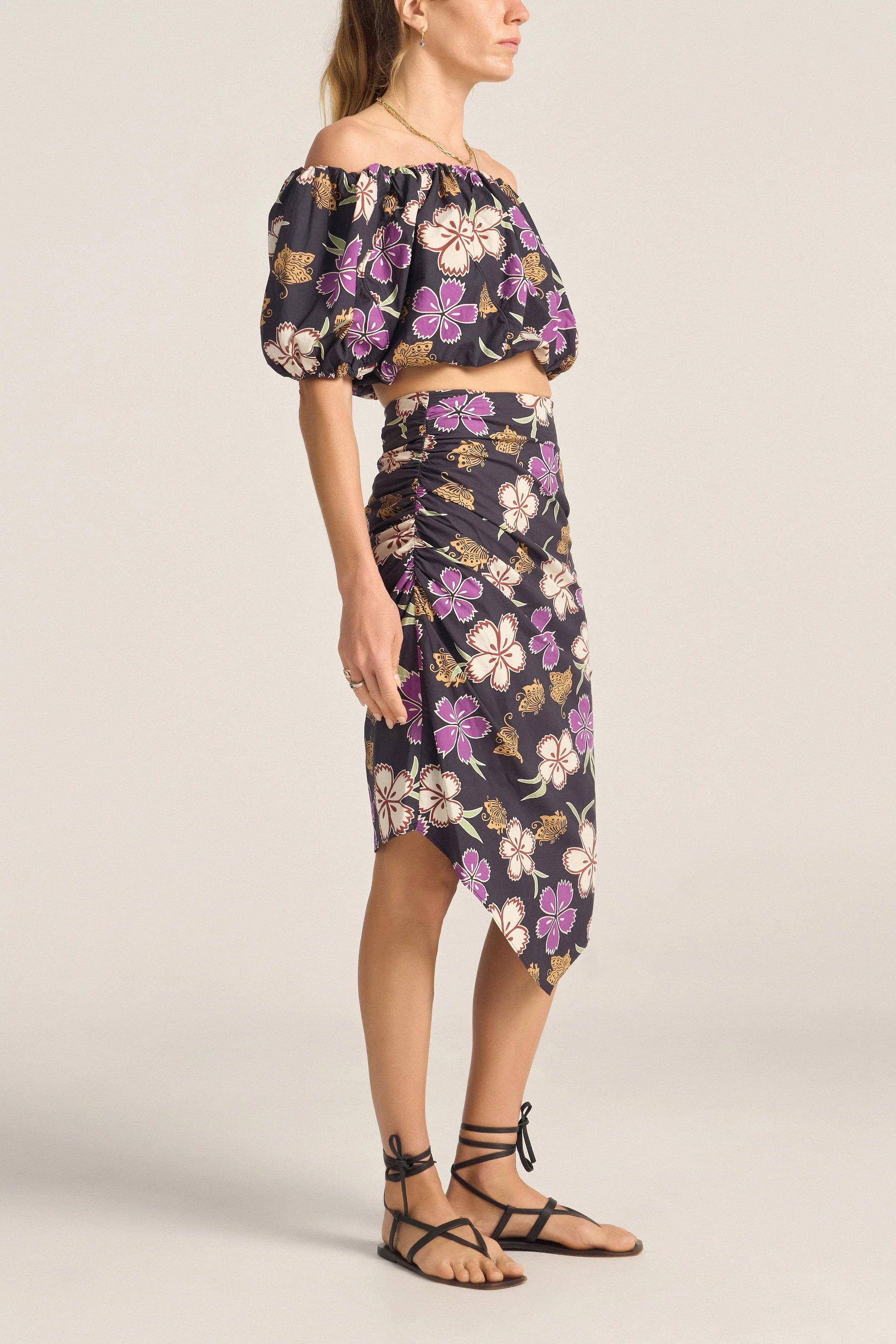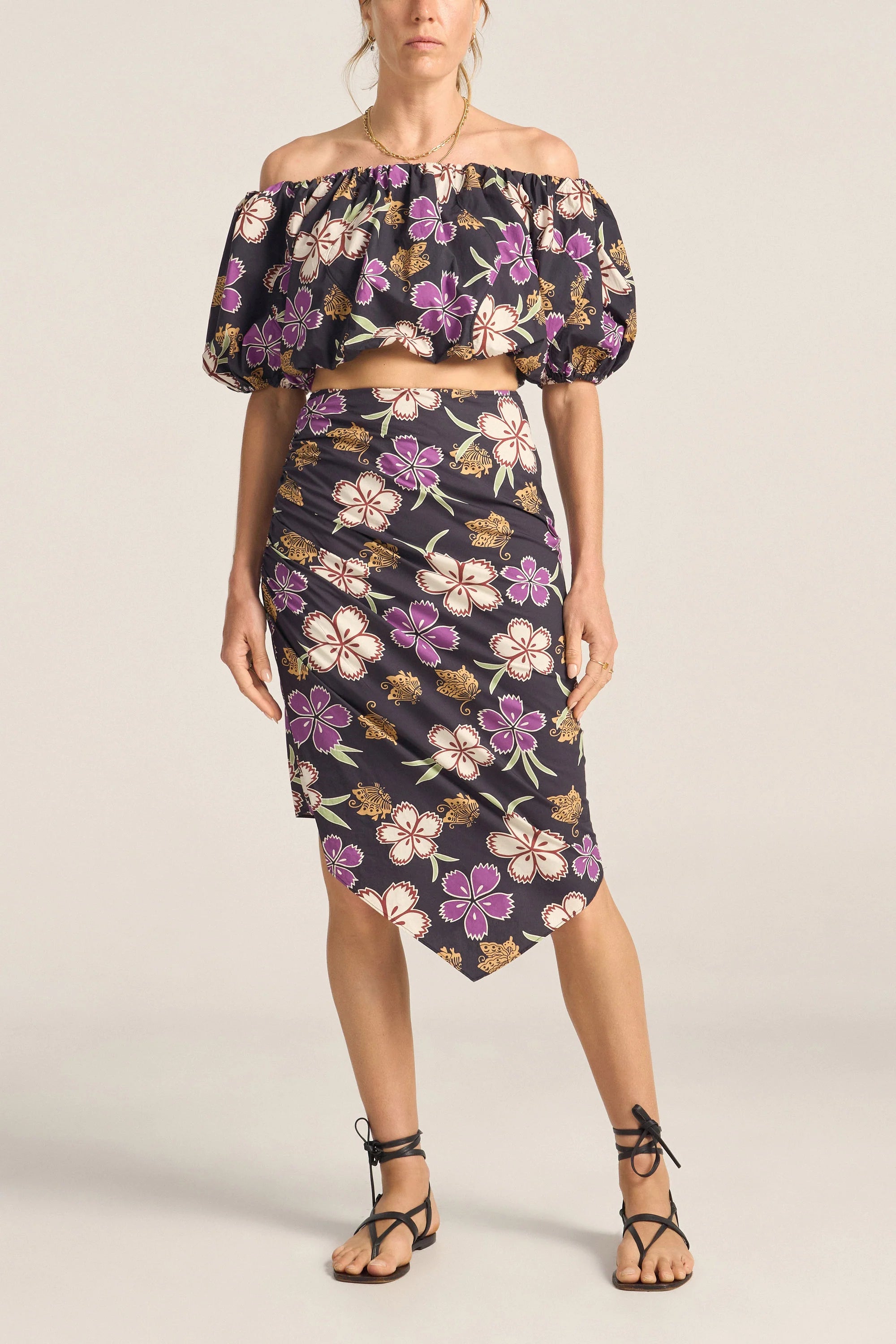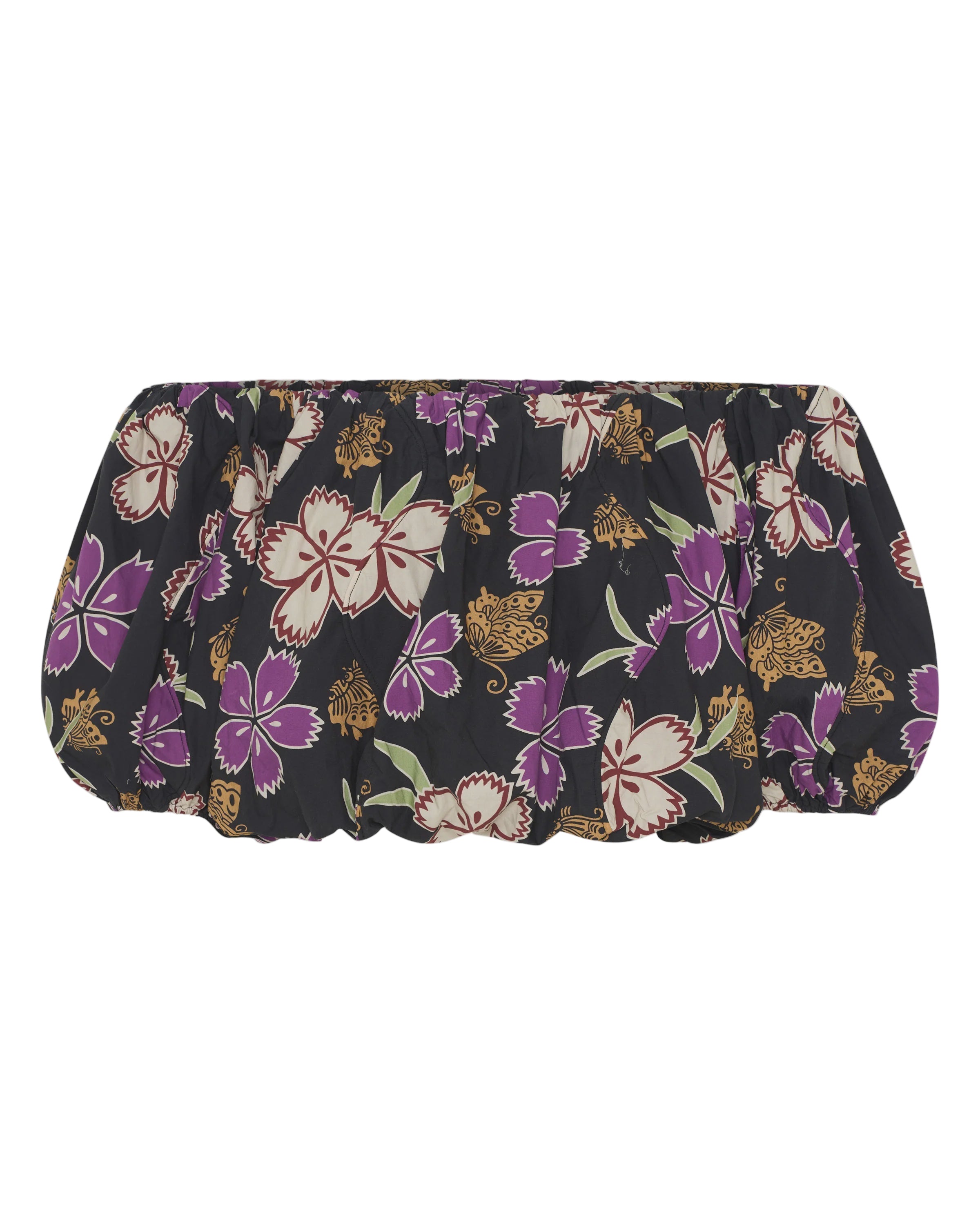 Ilio Nema Antiope Top in Hibiscus Print. The Antiope Top brings effortless elegance with a touch of tropical charm. Crafted from a dark hibiscus printed cotton poplin, featuring soft purple and cream flowers, this playful silhouette boasts voluminous bubble sleeves and a cropped shape for modern appeal. Lightweight and breathable, the Antiope Top pairs perfectly with the Aegis Skirt or jeans, adding a vibrant yet sophisticated note to your wardrobe.