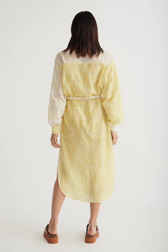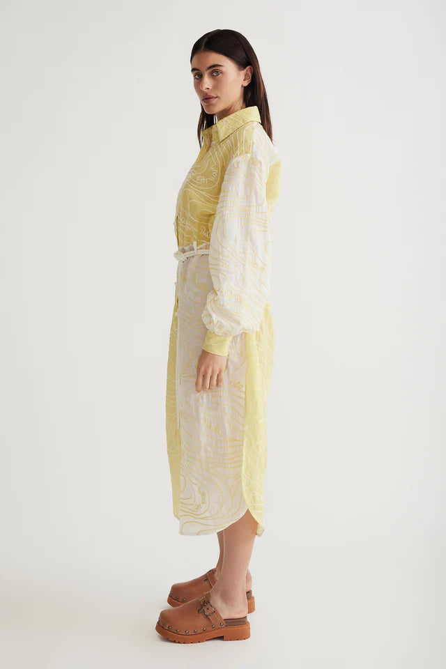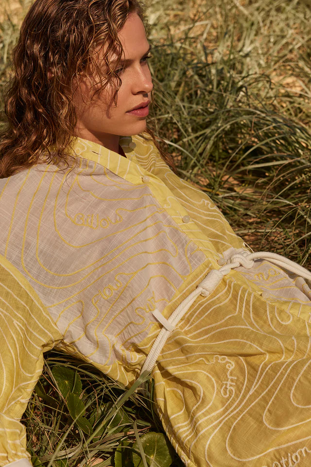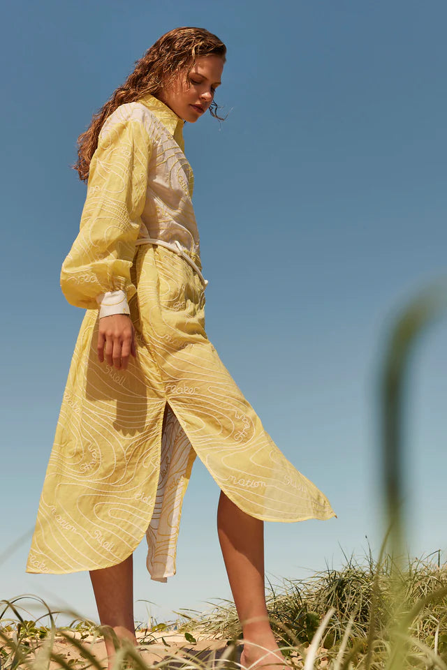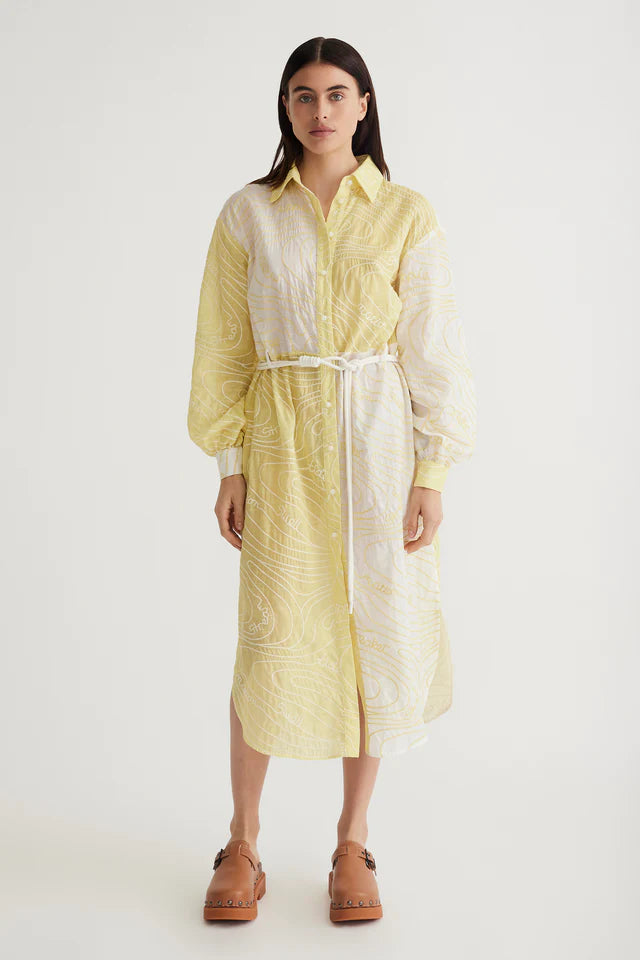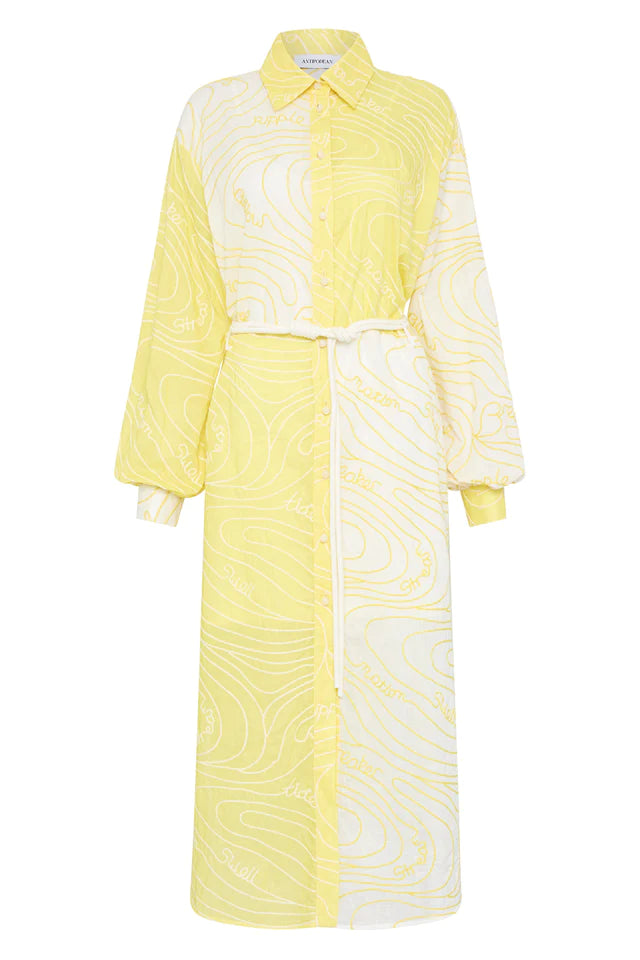 The Surge Belted Shirt Dress is made in a breezy cotton and is embroidered with hand-drawn motifs. Inspired by the movements of the ocean, this zesty yellow and crisp white design is made for days in the sunshine. The dreamy silhouette features a hand-knotted belt, voluminous balloon sleeves, and marbled beading buttons.