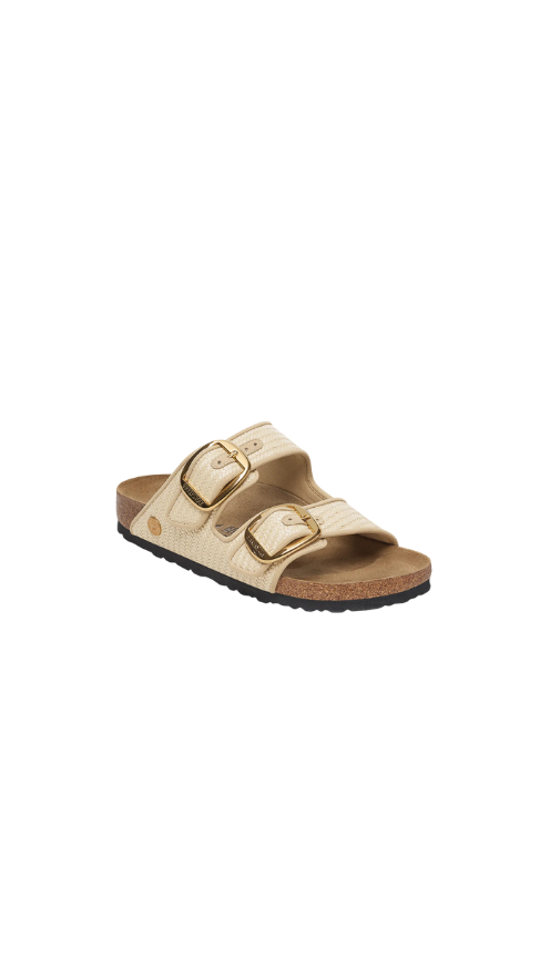 Birkenstock Big Buckle Raffia in Natural. The Birkenstock Arizona is a genuine classic that has been delighting wearers for decades. The Big Buckle version features a large, elegant pin buckle – a fantastic, striking detail on this otherwise understated sandal. The upper is made from raffia textile.