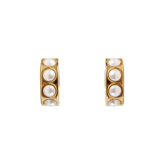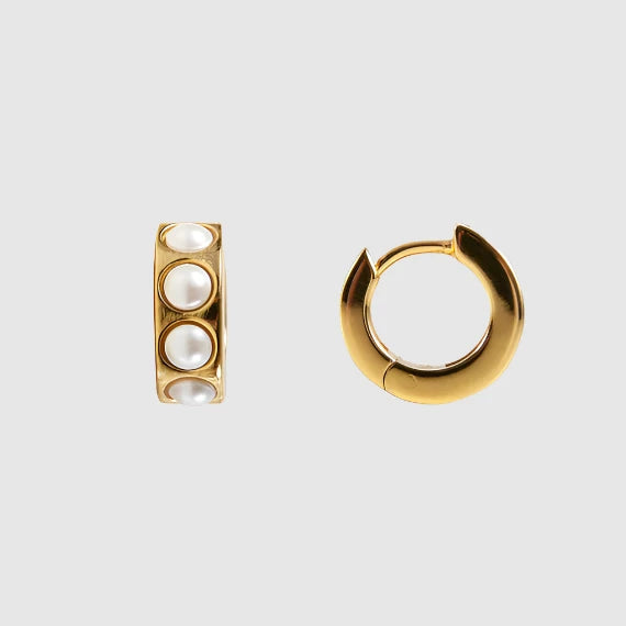 These stunning best-selling earrings comprise 5 milky white cabochon crystal pearls encrusted in an 18k gold plated sterling silver hoop. An elegant everyday extremely light weight huggie that can be stacked with other huggies, hoops and studs.