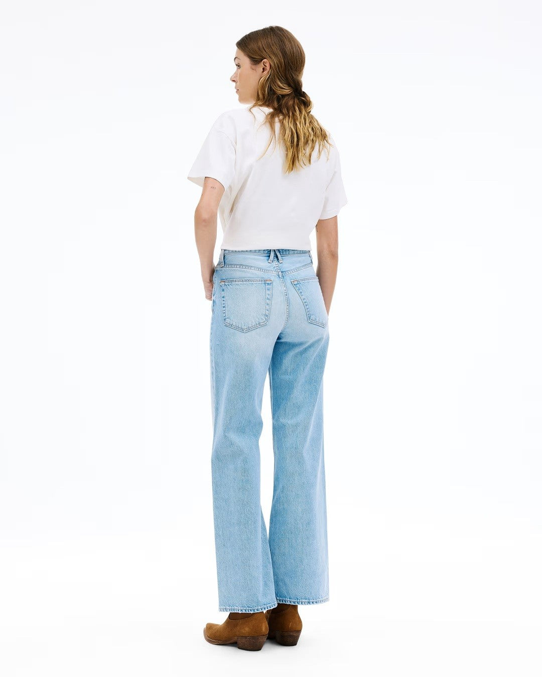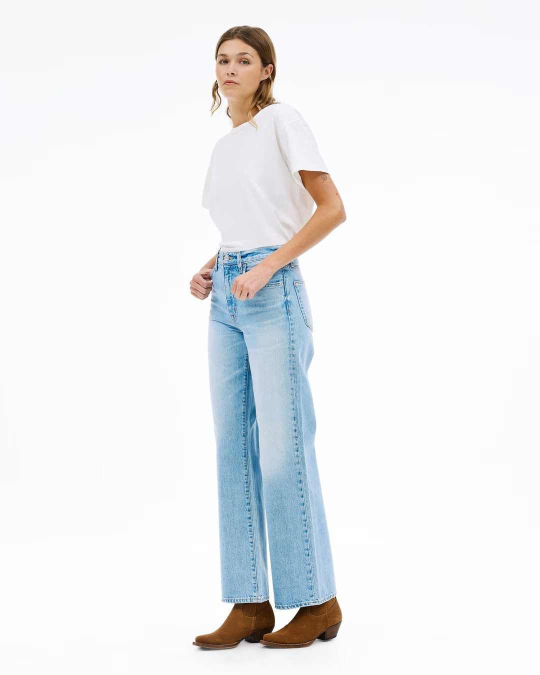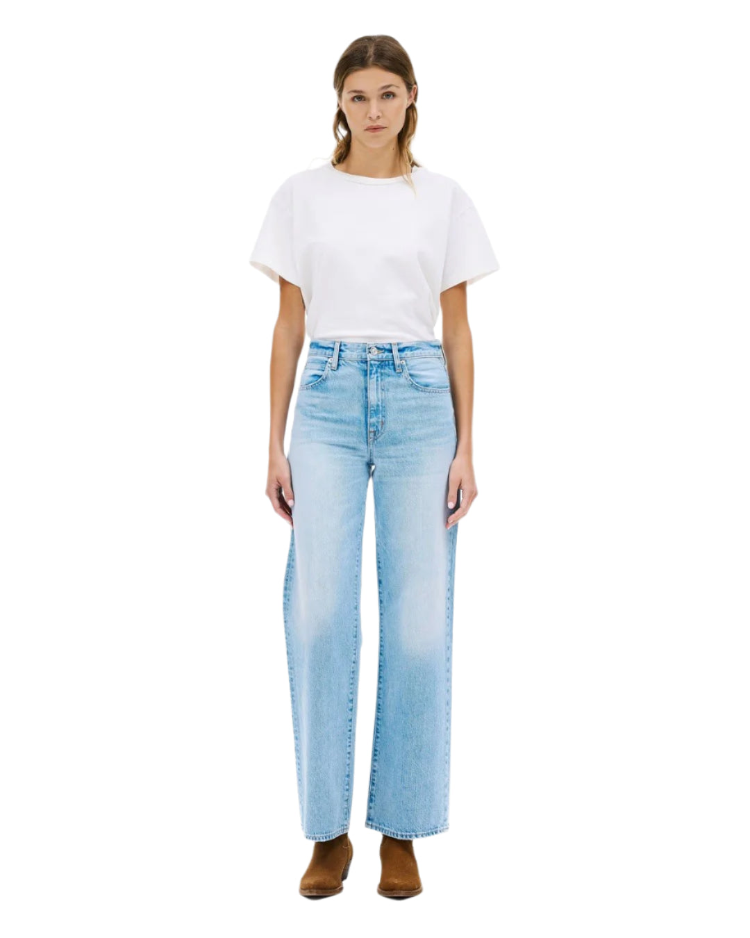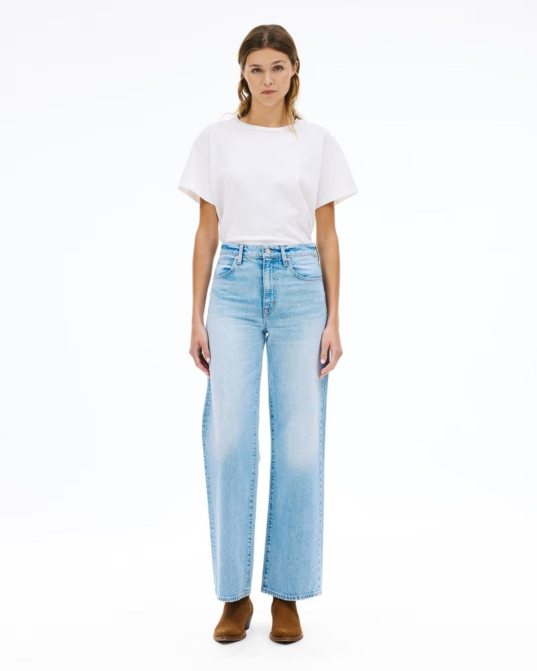 Slvrlake Grace Jean in Country Skies. Grace is a signature style designed to elongate the leg with a high-rise waist and a playful wide-leg silhouette. Country Skies is crafted from 100% Regenerative Cotton and featured in a classic light stone wash with hand-detailed subtle whiskering for a vintage inspired finish.