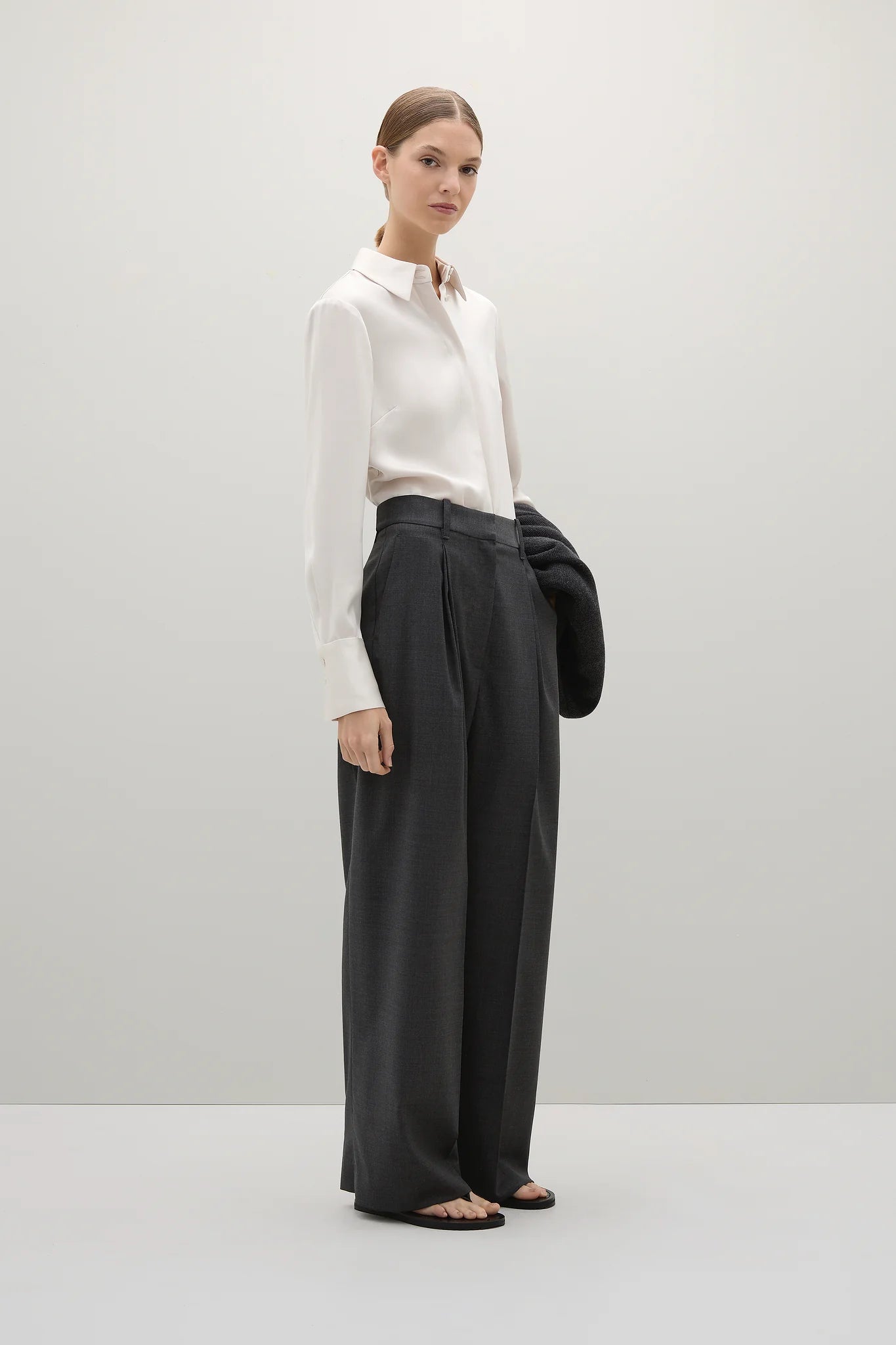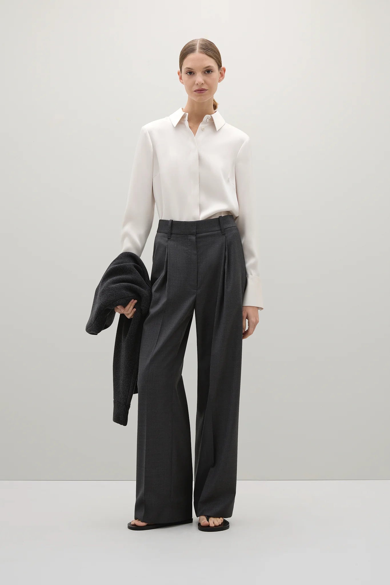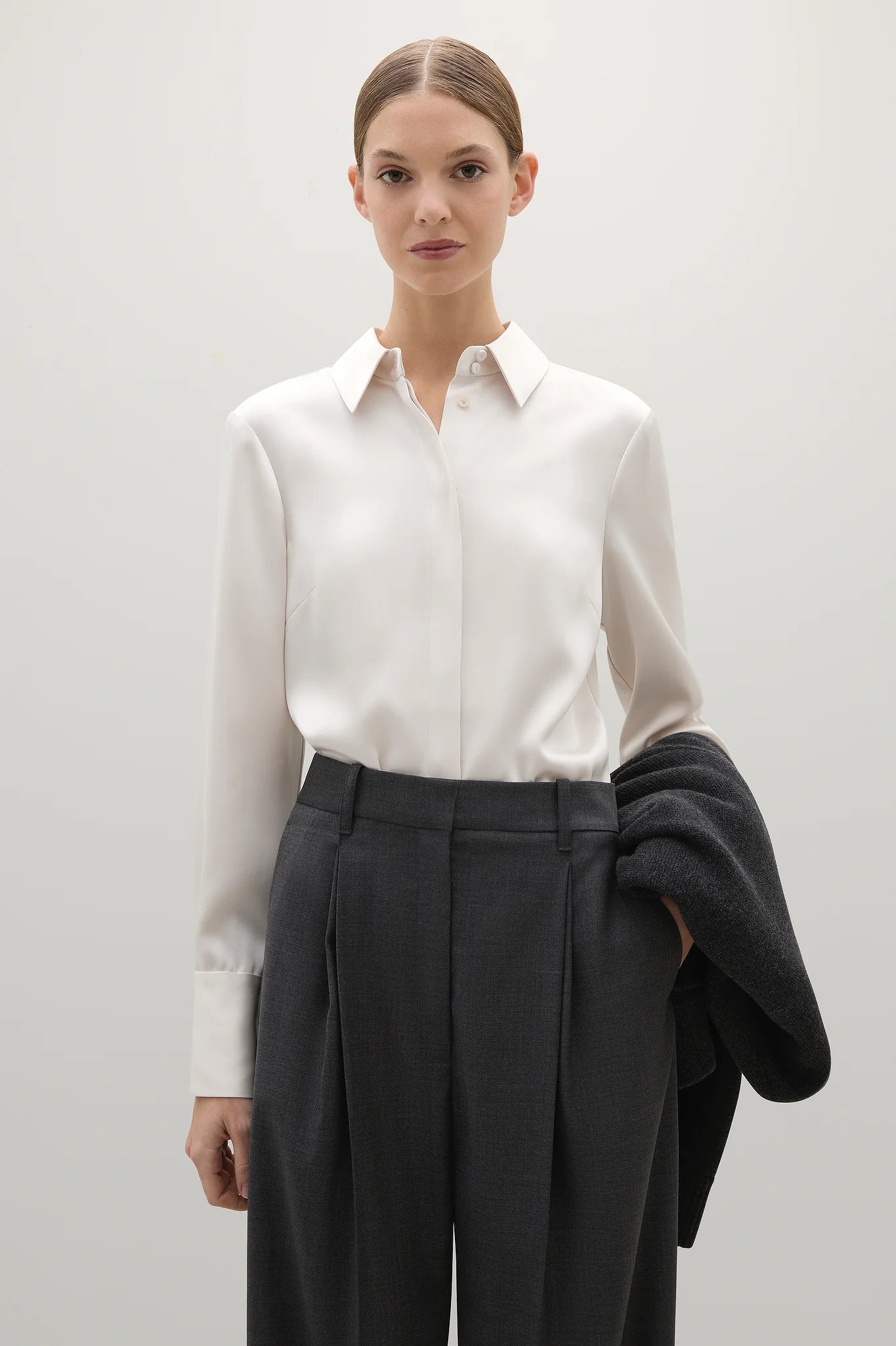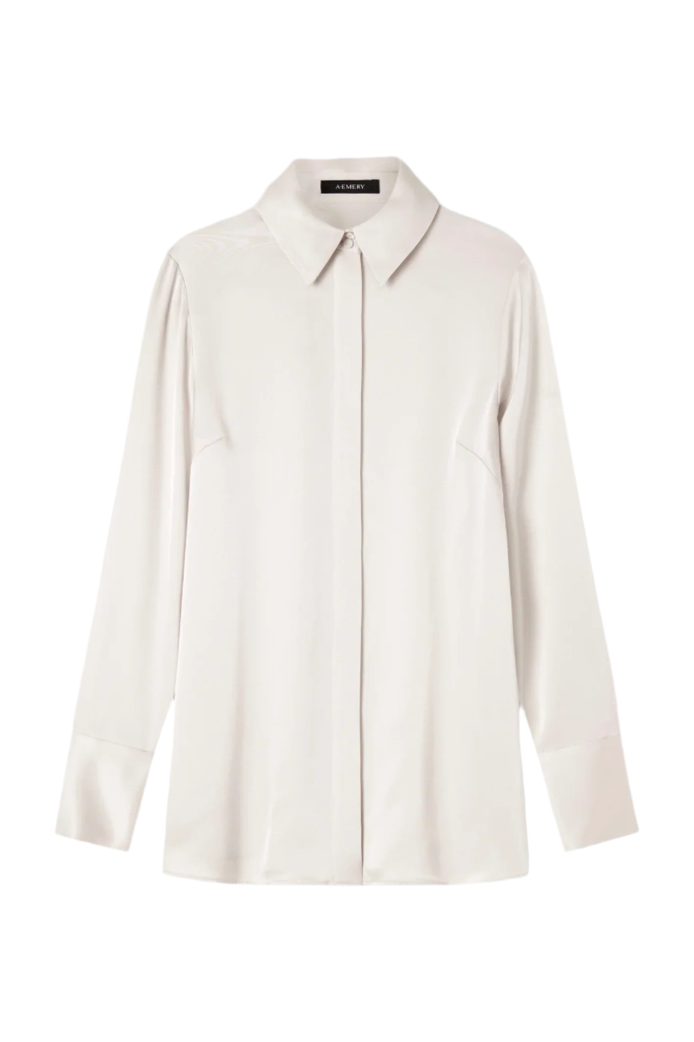 A Emery Philippa Shirt in Oyster. The Philippa Shirt is a modern take on a classic shirt, crafted from Japanese triacetate for a fluid fit on the body. This style features wide cuffs and a hidden button placket.