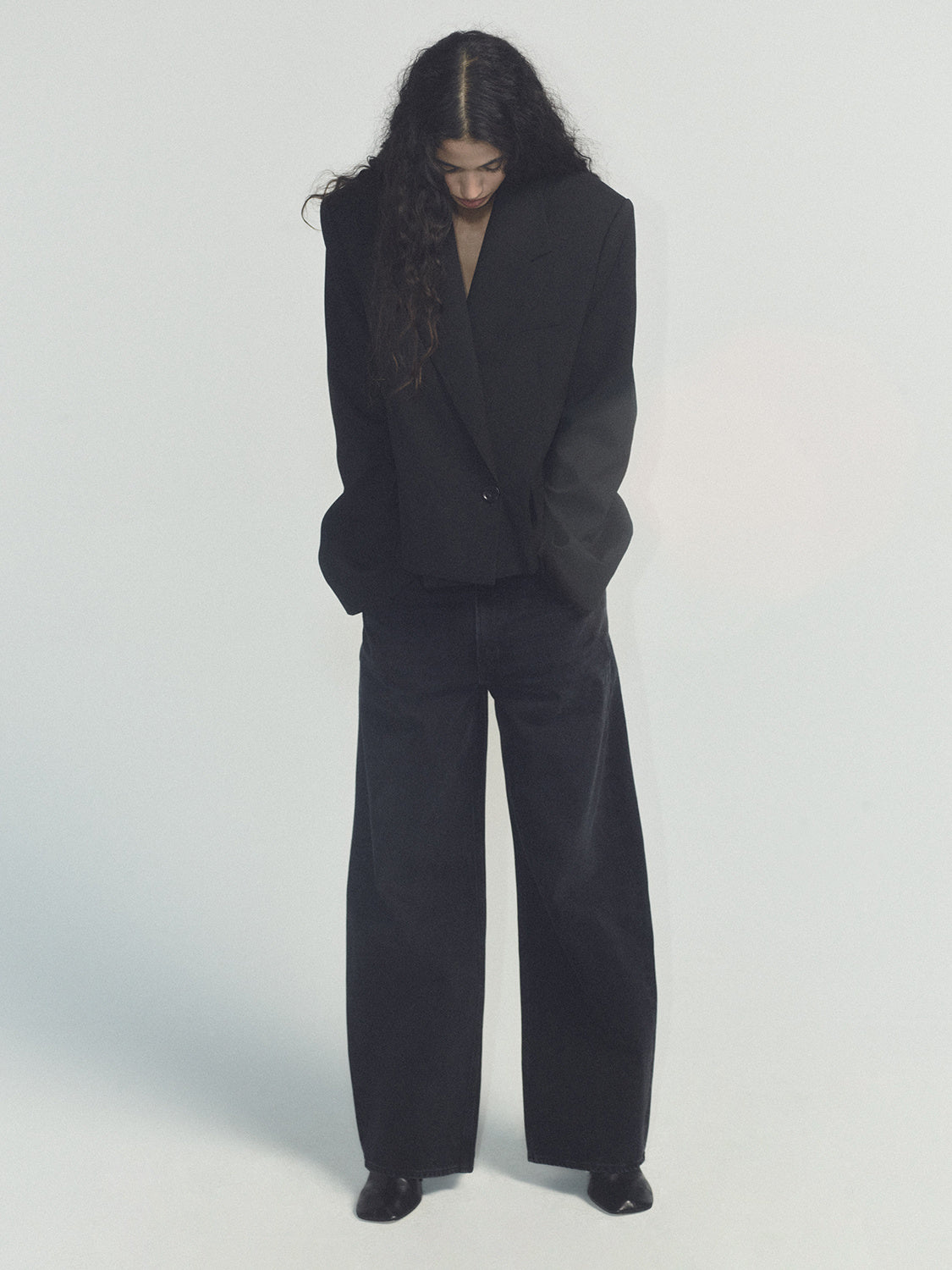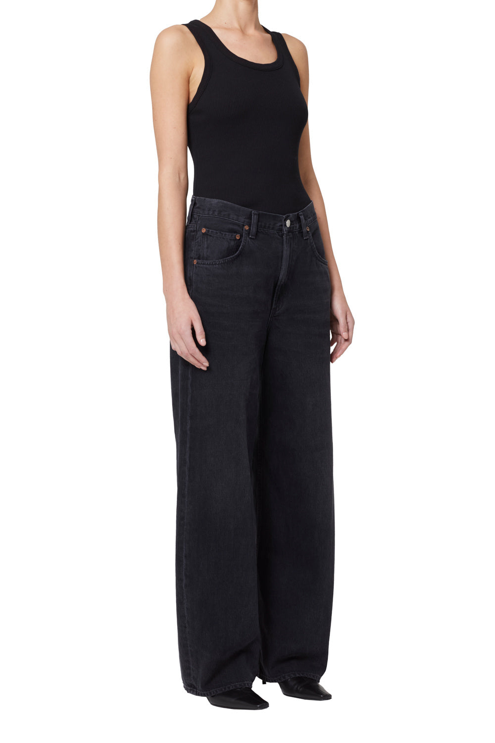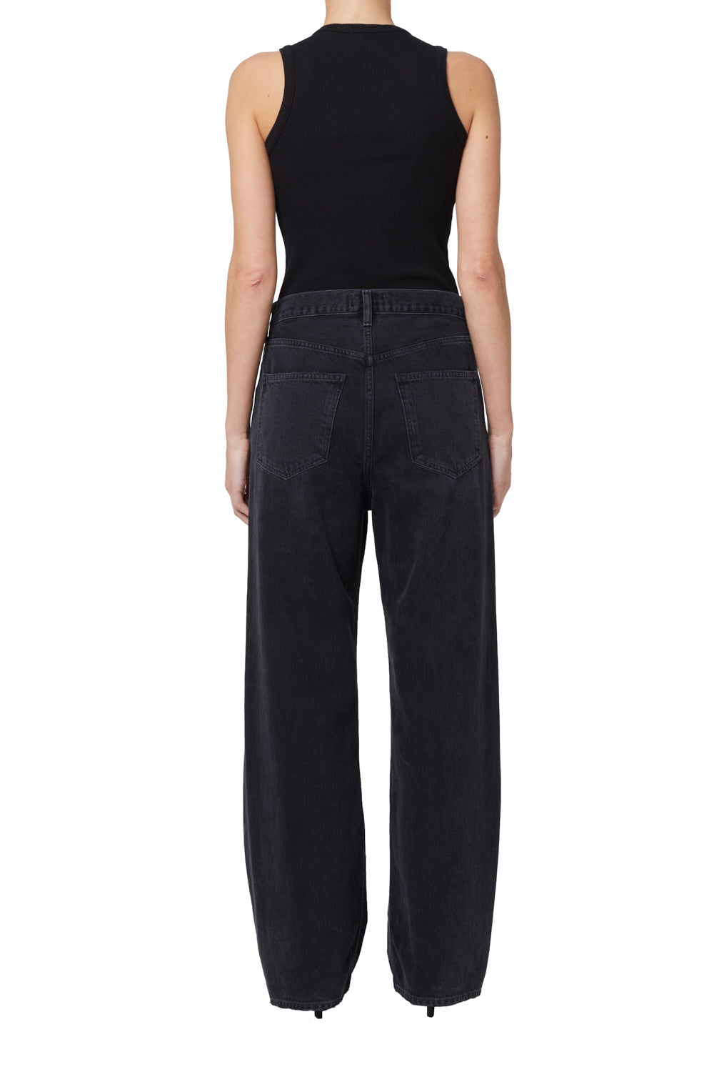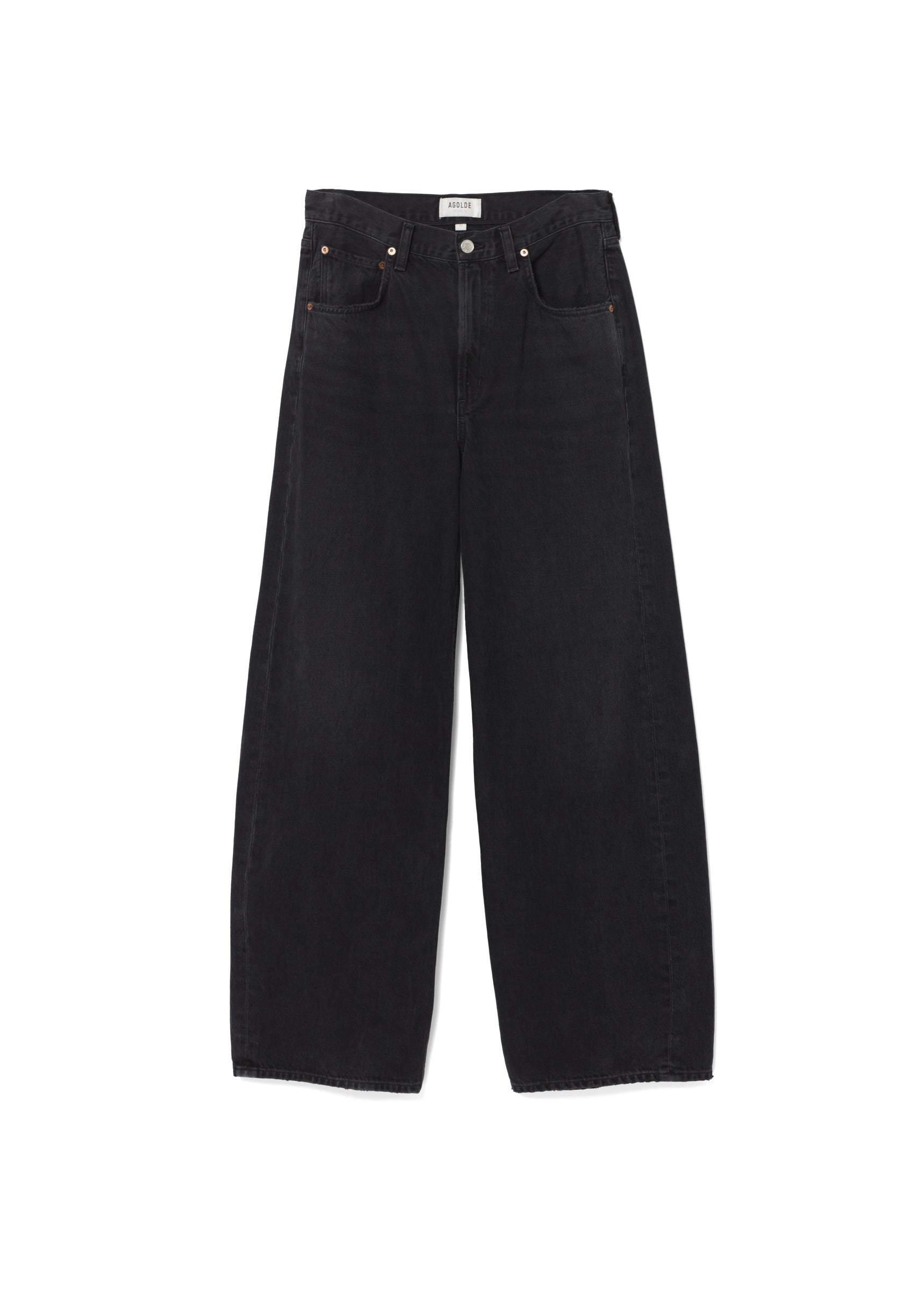 Agolde Low Curve Jean in Black Tar. AGOLDE's Ren jeans from the Weightless Collection offer the perfect blend of comfort and style. Made from regenerative cotton, they feature a high-rise waist and cropped wide legs for a relaxed yet flattering silhouette. The lightweight fabric ensures all-day comfort, making them ideal for casual wear. Pair them with a half-tucked tee for a cool, effortless look.