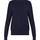 Bassike Oversized Crew Neck Knit In Ink. A foundational wardrobe essential, the Oversized Crew Neck Knit is designed with a relaxed silhouette and slouchy fit. Crafted from a premium wool-cashmere blend for a luxurious handfeel and lasting durability. Features a classic crew neckline and ribbed detailing at the neck, sleeves, and hem. Finished with Bassike’s signature contrast chainstitch at the centre back.