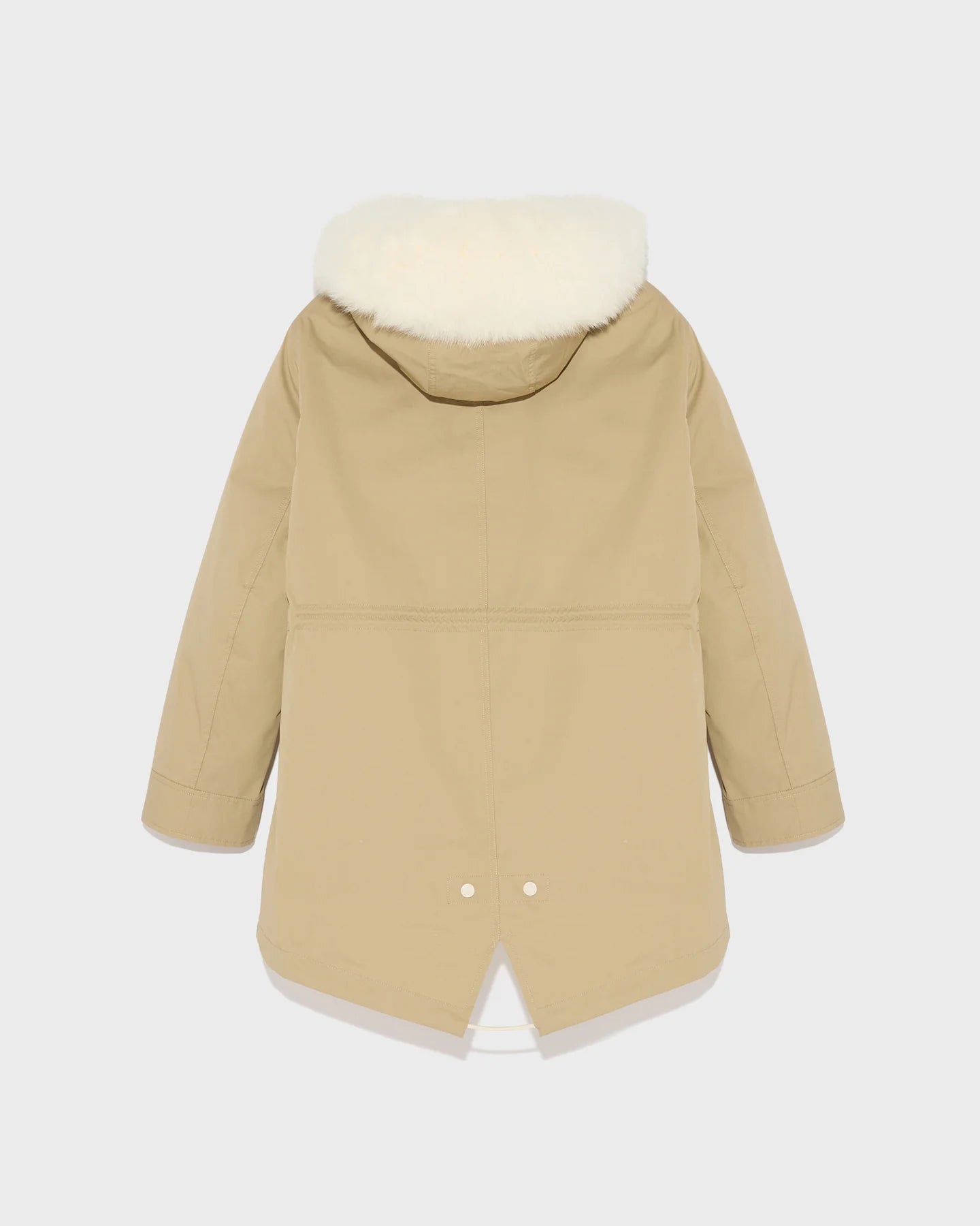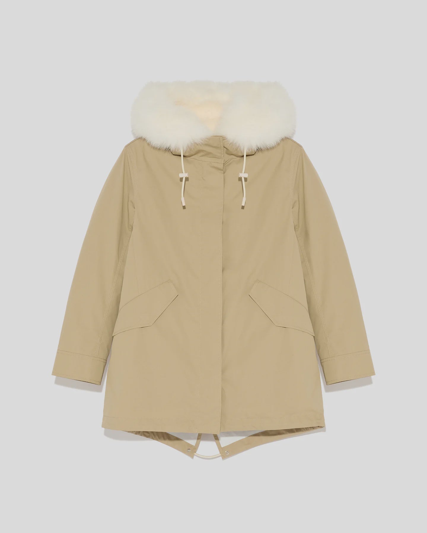 Yves Salomon Parka 72cm in Sable and Ivory. Crafted from a weather-resistant cotton blend, this warm and enveloping parka has a flared cut and a pared back silhouette. Design details include a concealed zip and button fastening, two flap pockets, an inside pocket and a fishtail finish in the back. Drawstrings at the waist and bottom allow the fit to be adjusted for a more feminine and contemporary look. Featuring a detachable hood trim, it has a removable lining with padded sleeves filled with high-quality down to guarantee comfort, warmth and breathability. Functional and timeless, this parka is versatile to match the season.