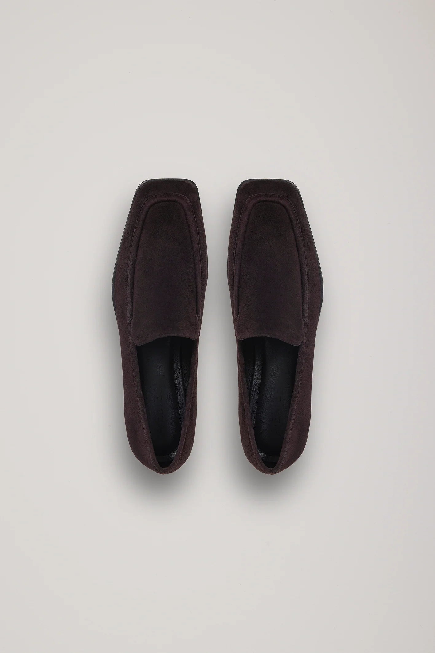 The A Emery Lane Loafer in Black Berry Suede. The Lane Loafer is an elegant square-toed loafer with a subtle piping detail and a simple, squared off tongue. Crafted from premium suede this style sits atop a low block heel for ultimate comfort and ease of wear.
