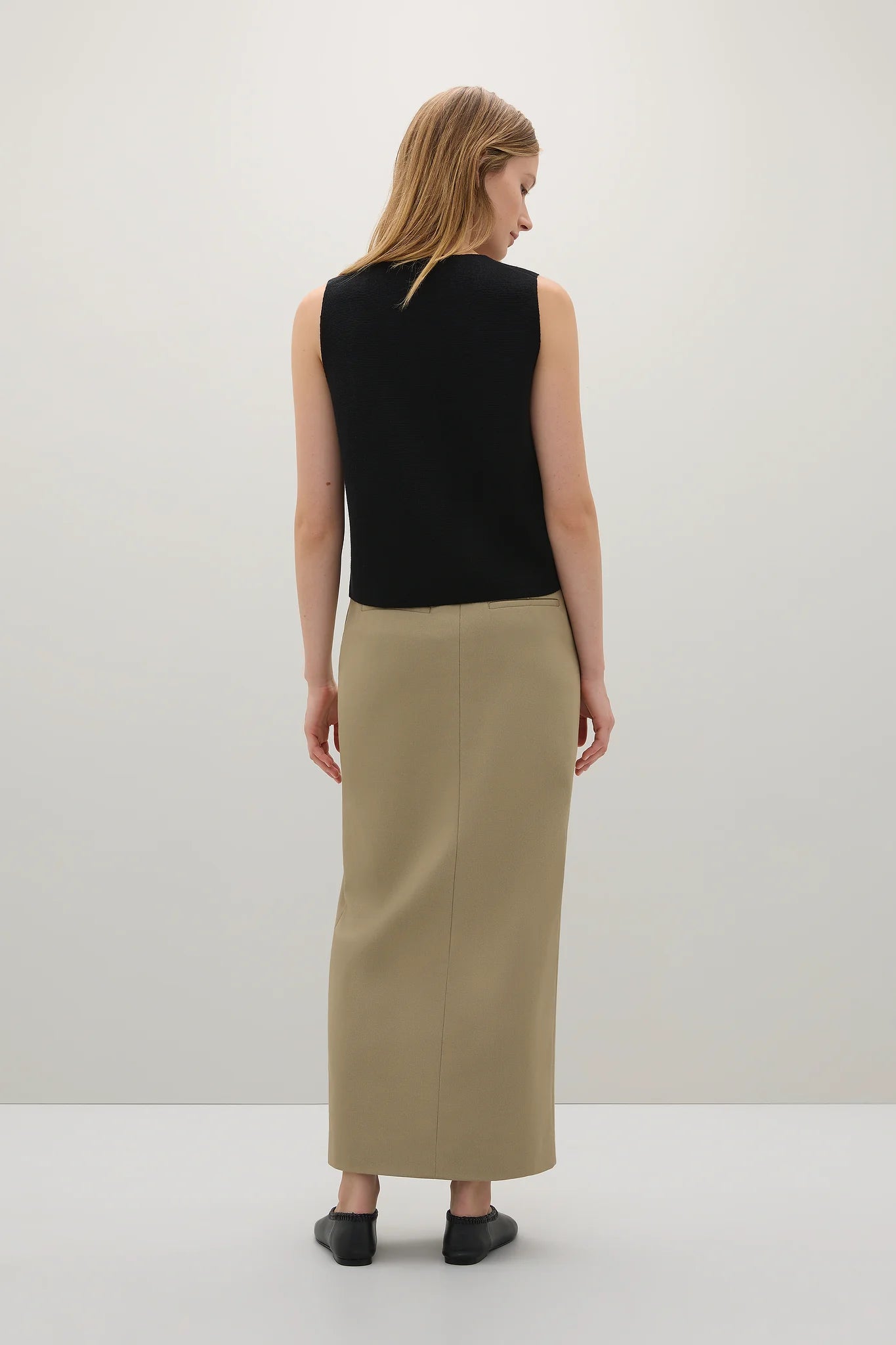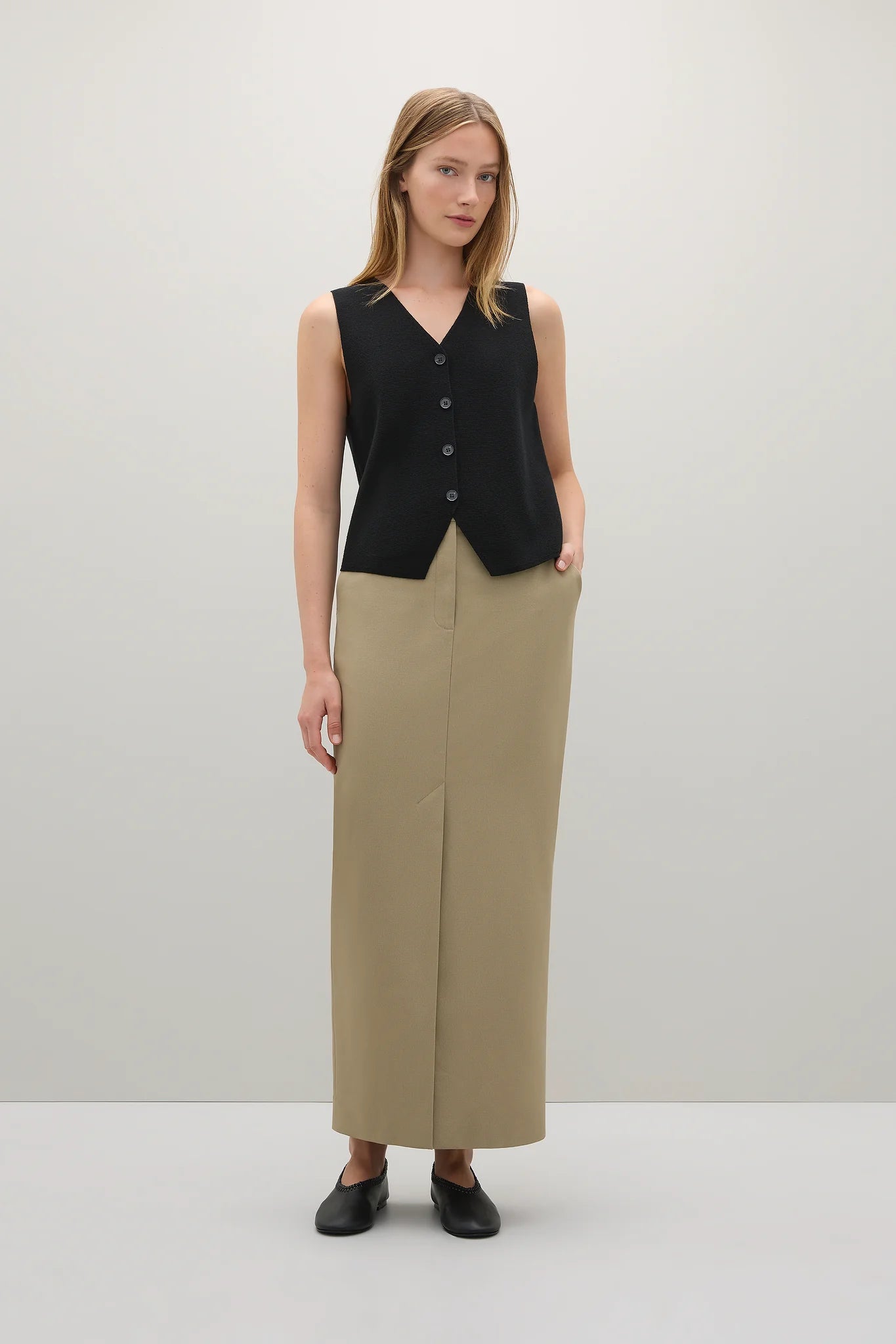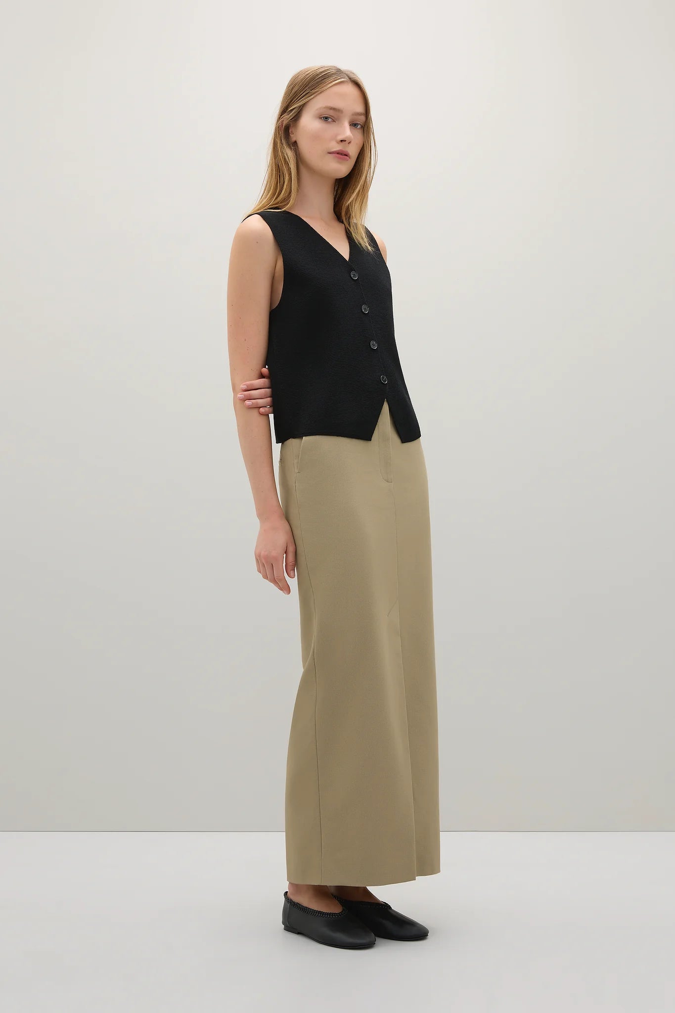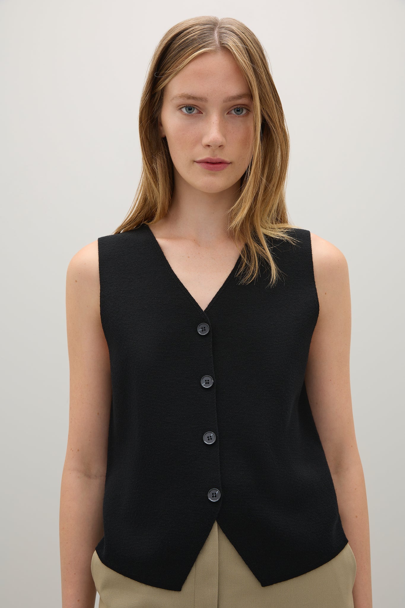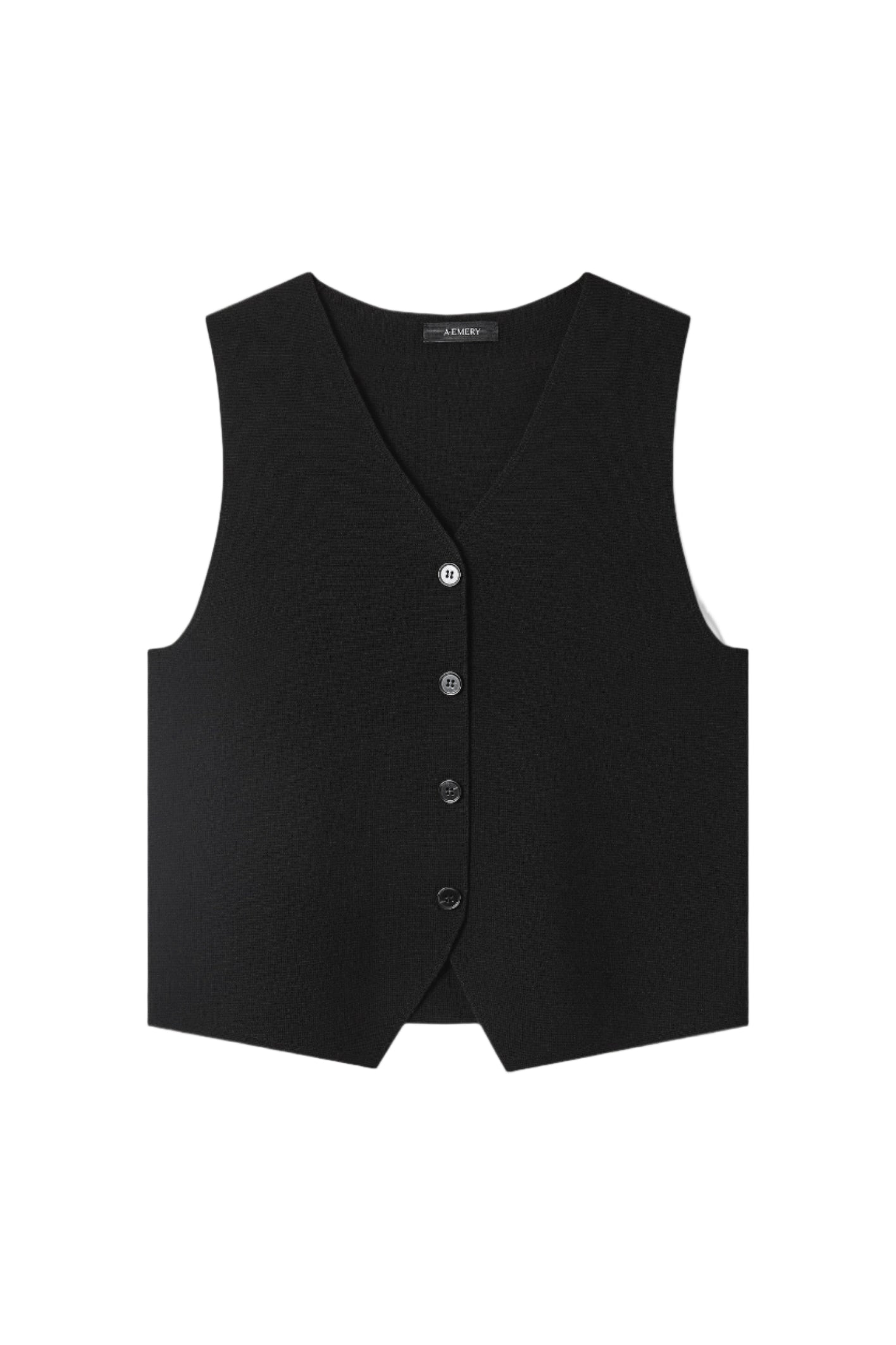 A Emery Nelson Vest in Black. The Nelson Vest offers an understated elegance, crafted from 100% extra fine merino wool. Details include a timeless v-neckline and centre front closure with contrast buttons.