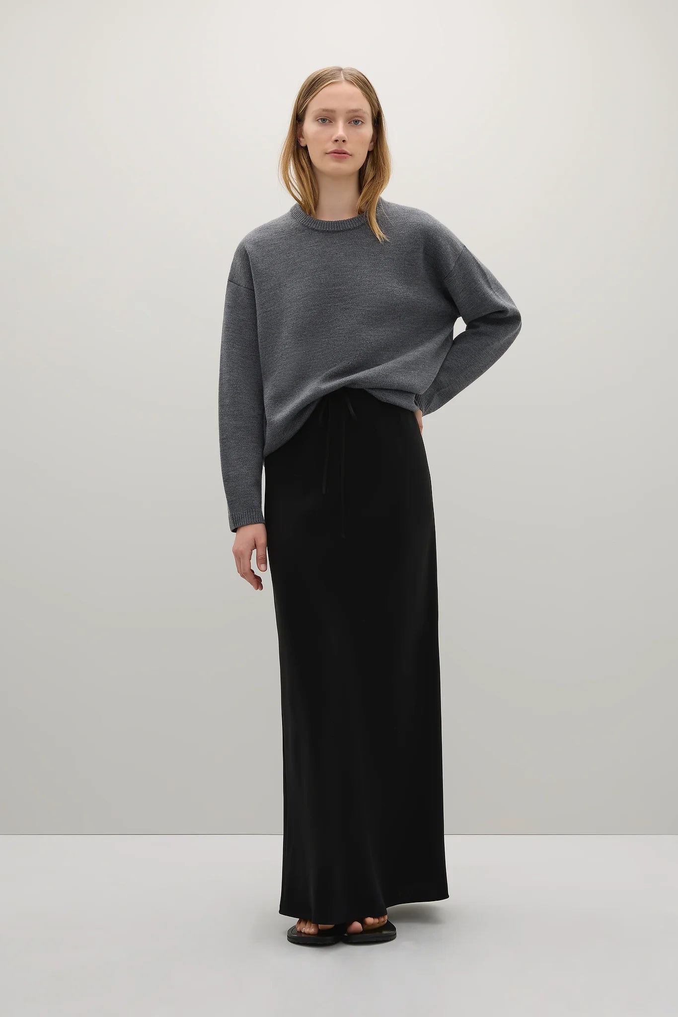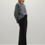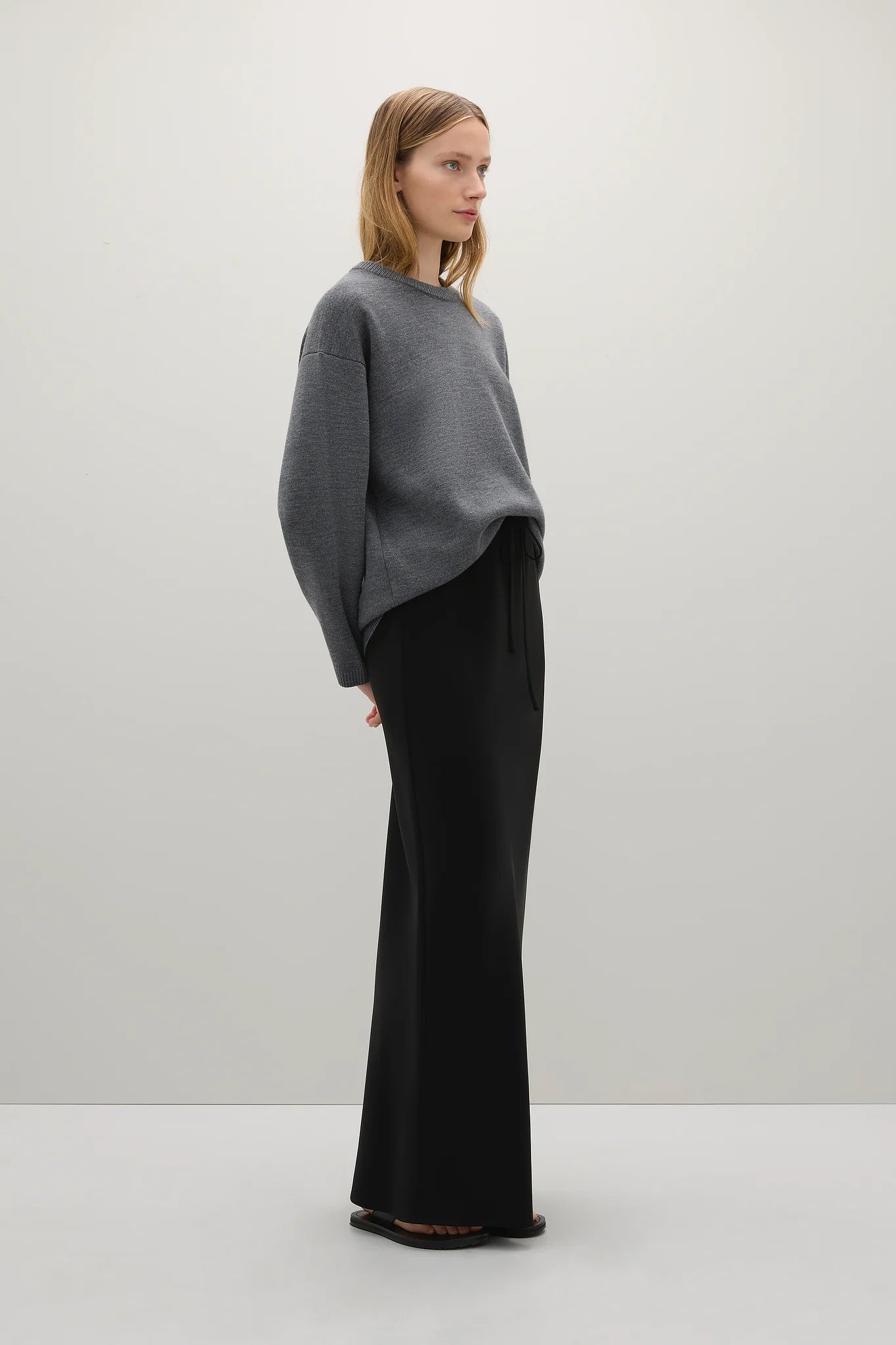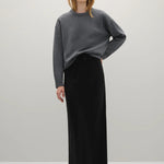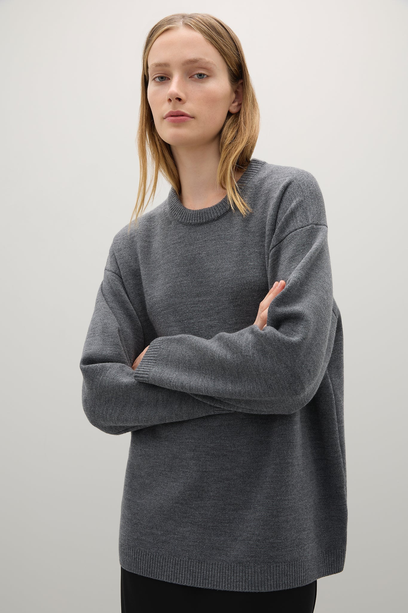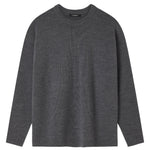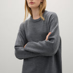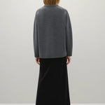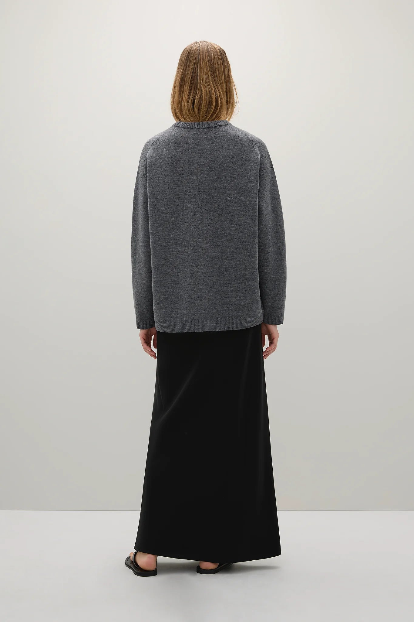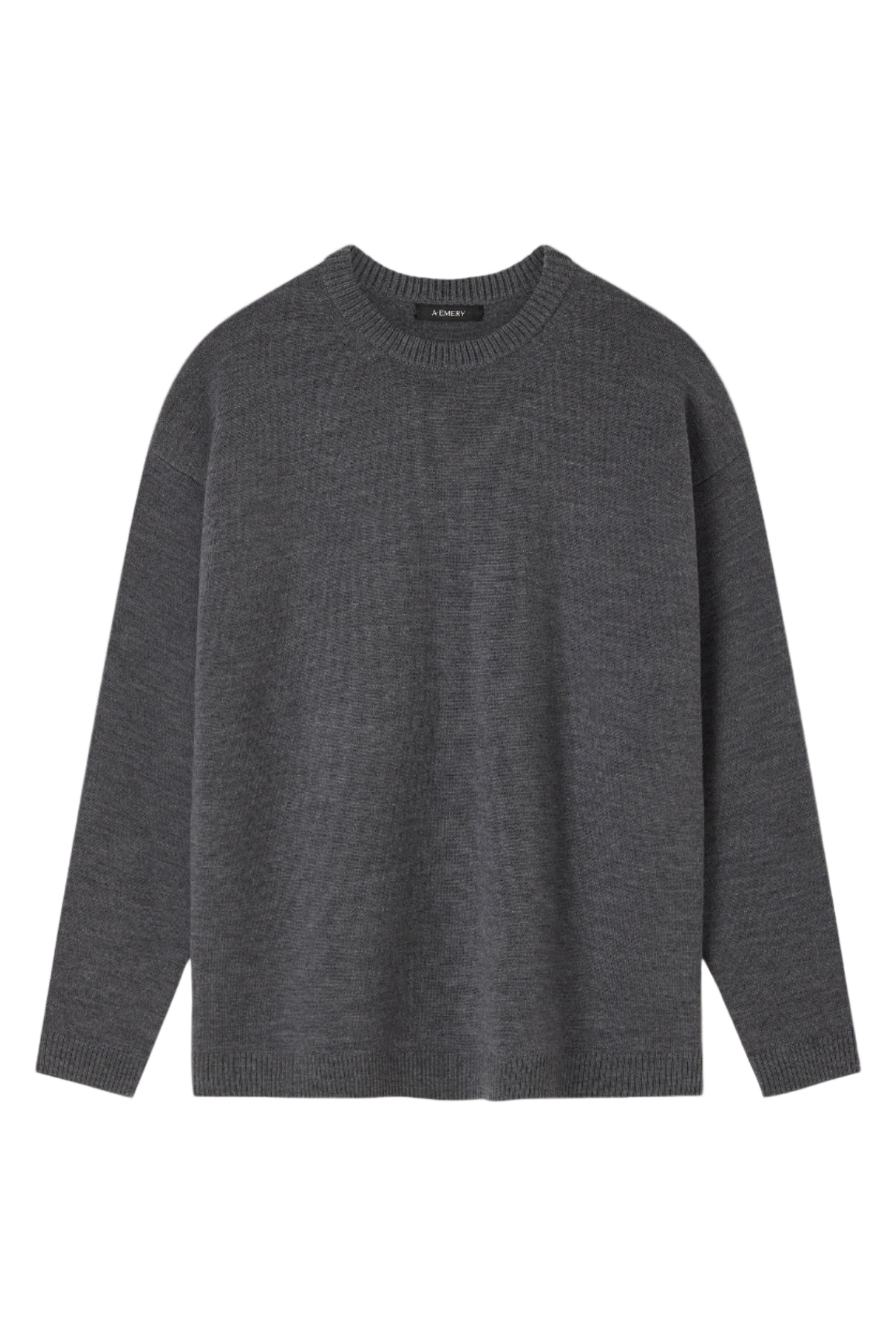 A Emery Reid Crew Knit in Mid Grey Melange. The Reid Crew Knit is a generously cut crewneck knit crafted from a luxurious merino wool blend.