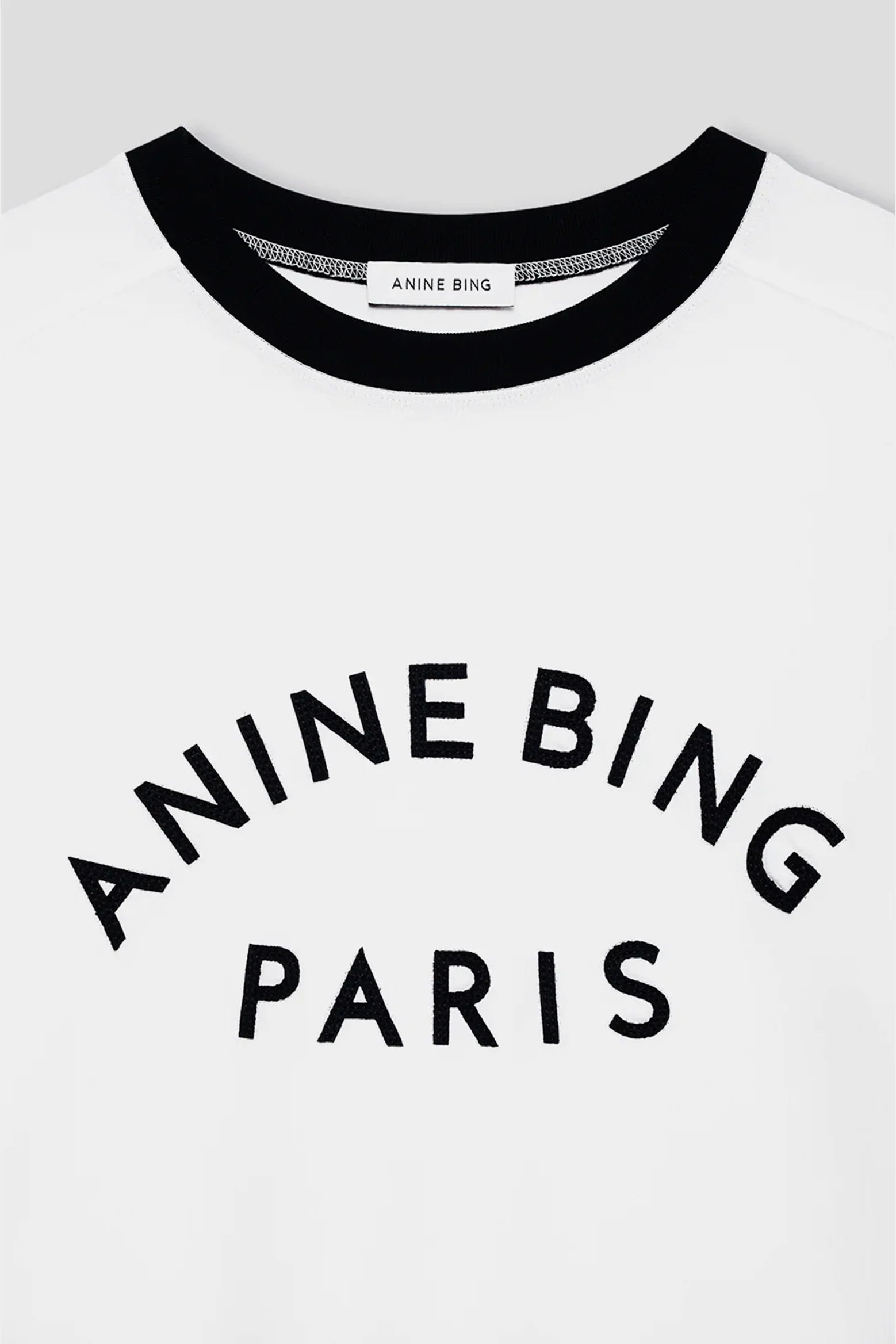 Anine Bing Jaylin Tee Paris in Ivory. The Jaylin Tee Monogram is a branded essential made from heavyweight cotton jersey in ivory. Its retro-inspired silhouette features raglan sleeves with flatlock stitch detailing and a ribbed cuff.