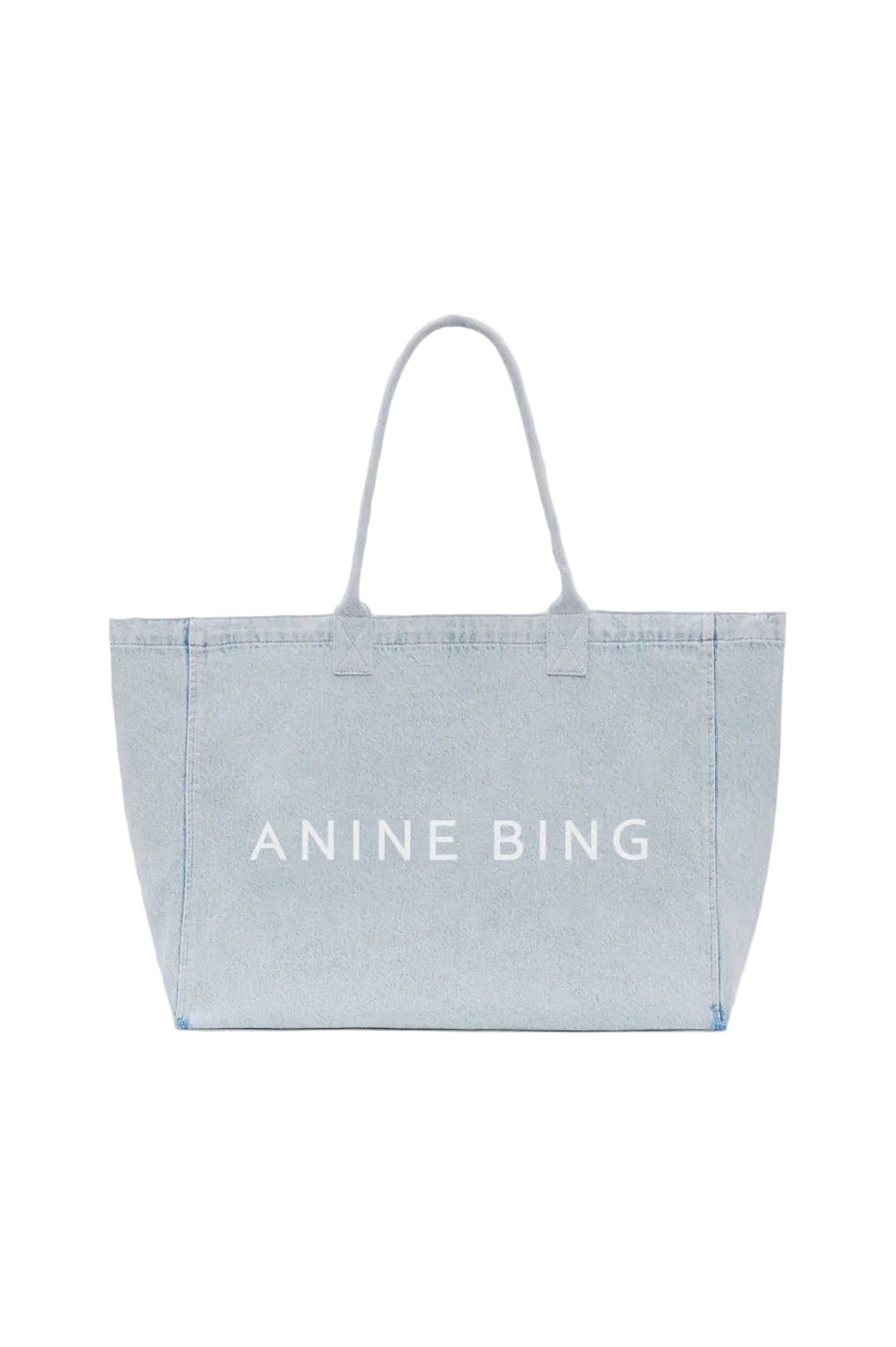Anine Bing Leo Denim Tote in Lucid Blue. An unlined canvas tote bag in a denim fabrication and screen-printed ANINE BING branding.