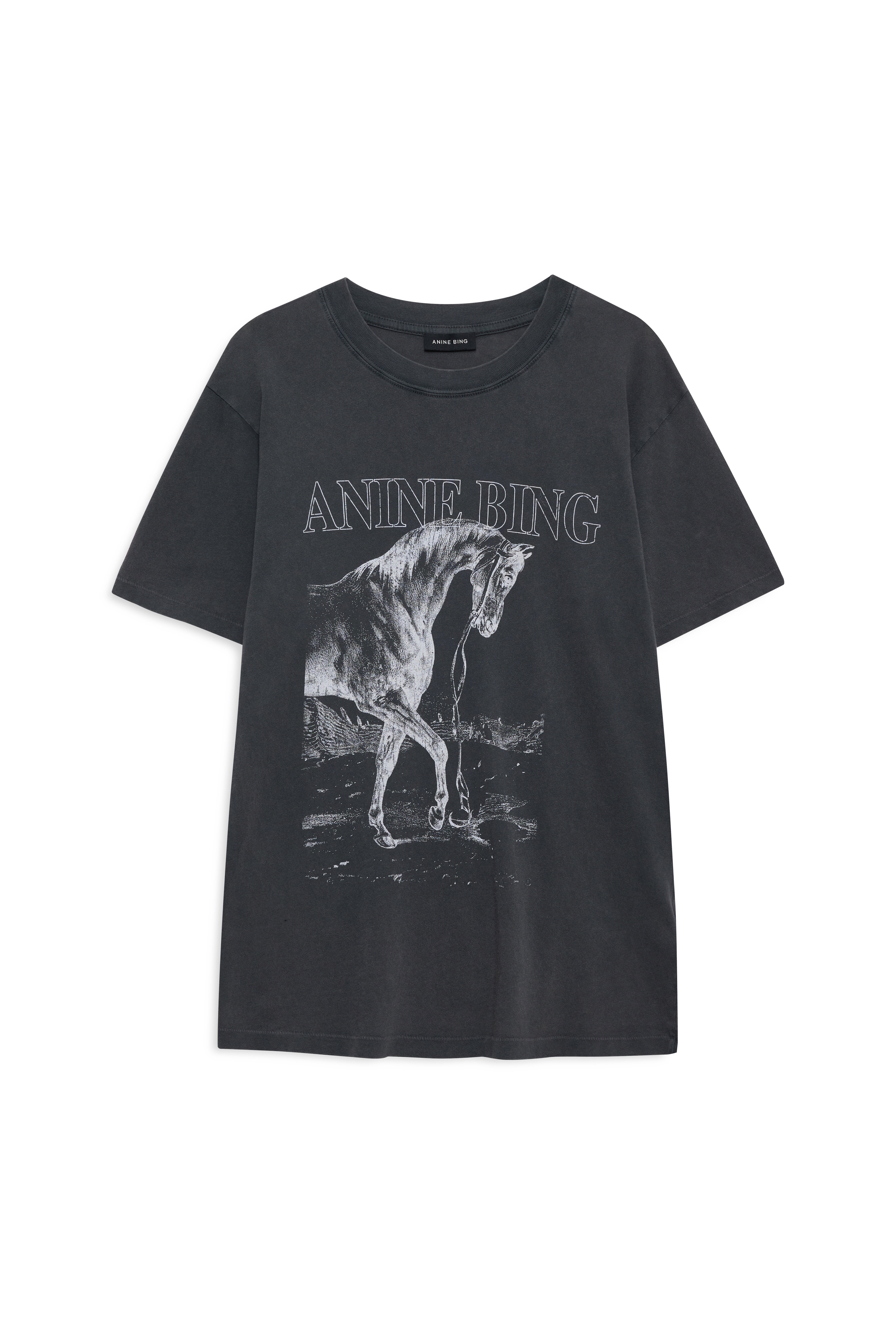 Anine Bing Lili Tee Horse in Washed Black. A go-to essential crafted from soft 100% cotton jersey, featuring a boxy fit and bold printed graphic.