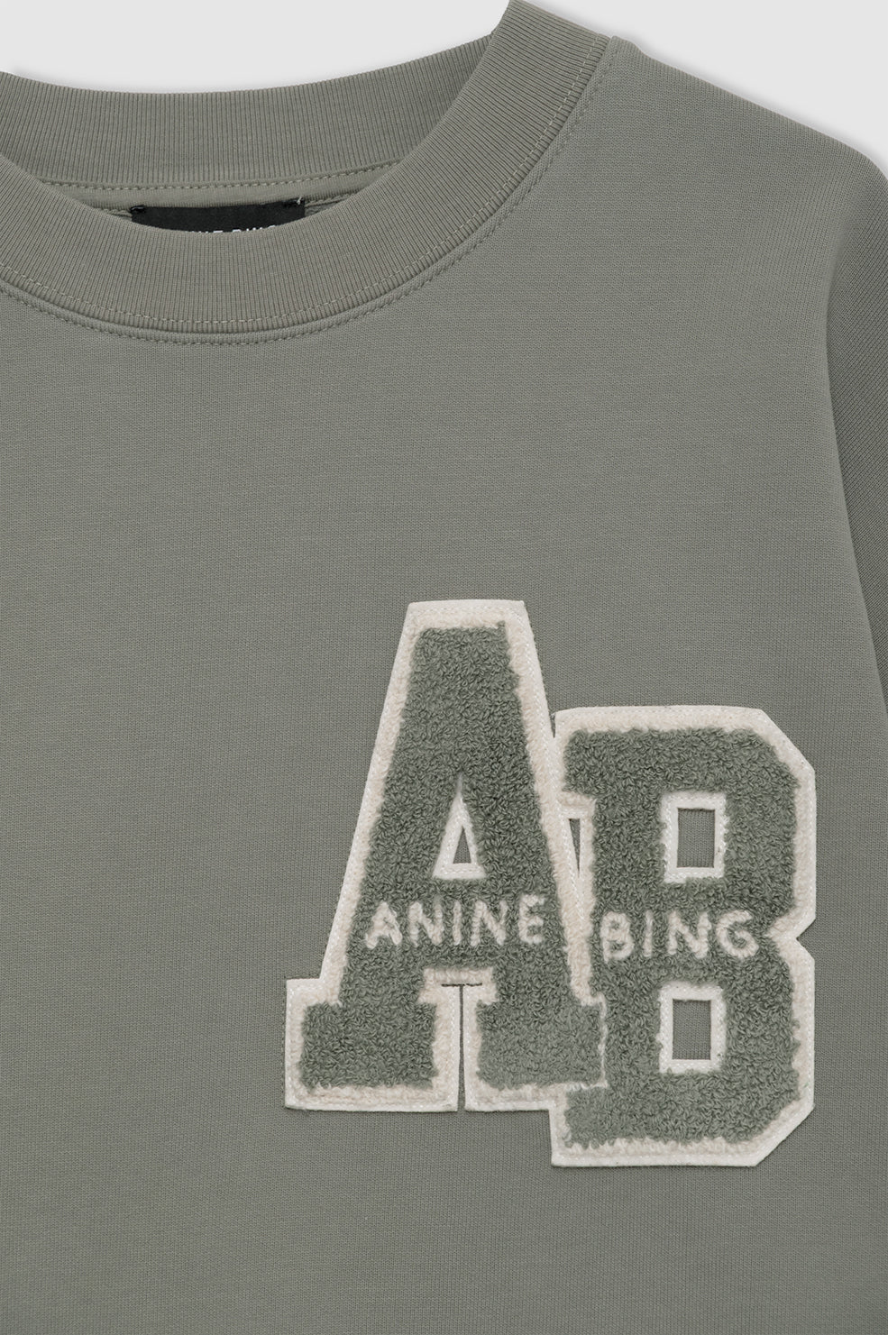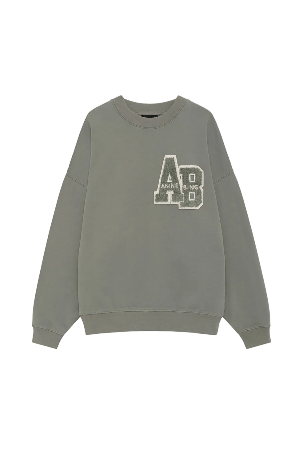 The Anine Bing Miles Sweatshirt Letterman in Sage. The Miles Oversized Sweatshirt Letterman is an oversized crewneck pullover made from midweight 100% organic cotton fleece in Sage. This relaxed casual features a custom ANINE BING letterman chenille patch graphic at the chest in Sage.