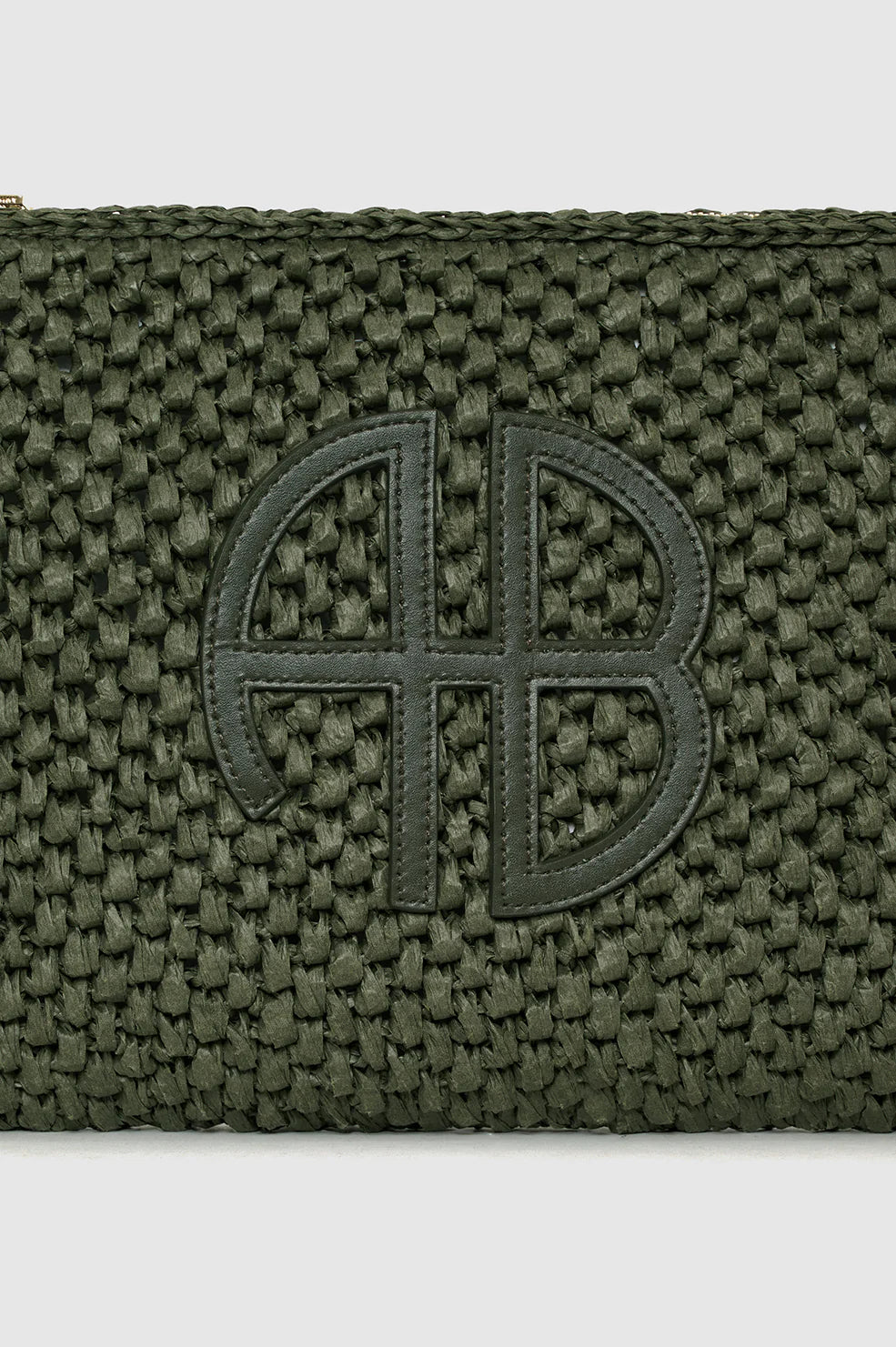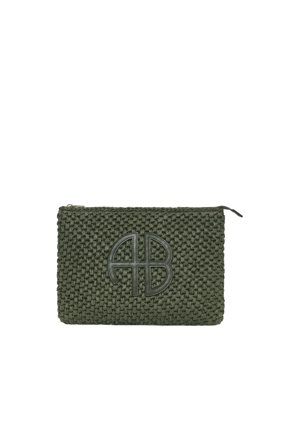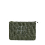 Anine Bing Rio Pouch in Olive. A travel essential crafted from a woven olive green seagrass material with tonal leather ANINE BING monogram at the center front.