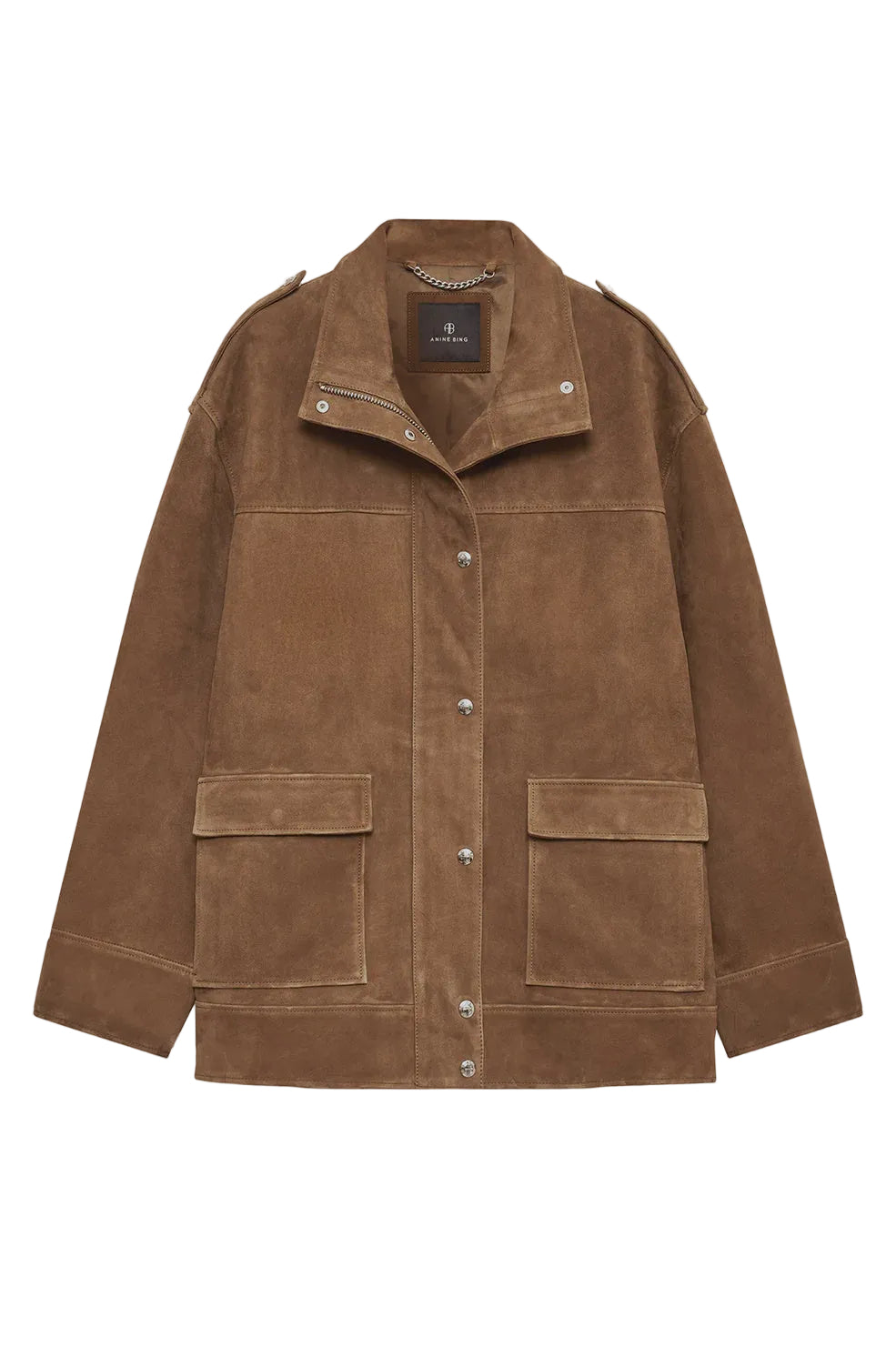 The Anine Bing Roux Jacket in Tobacco. Is a fashion streamlined, high-neck jacket in tobacco suede featuring two large front patch pockets. Finished with a zippered button closure.