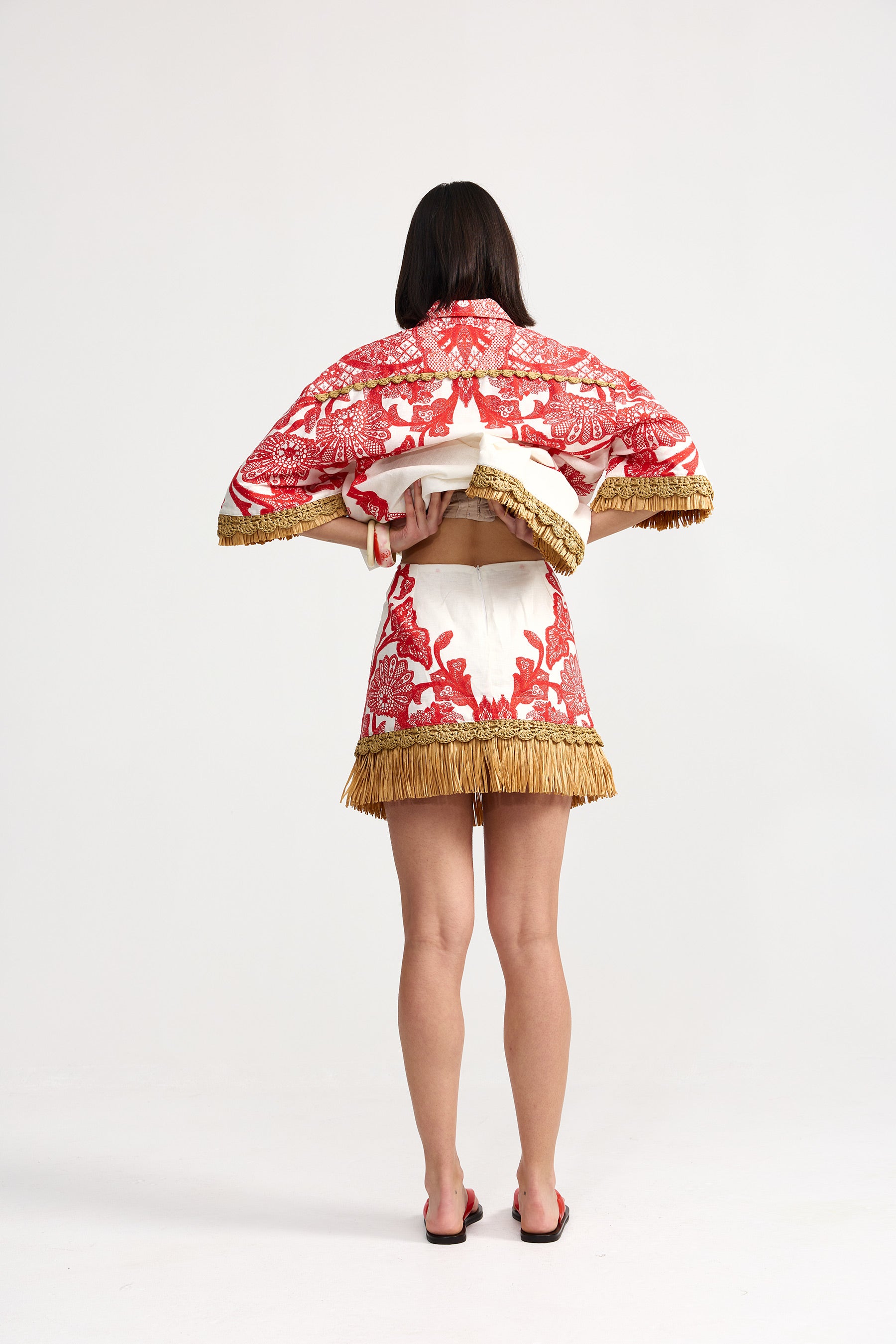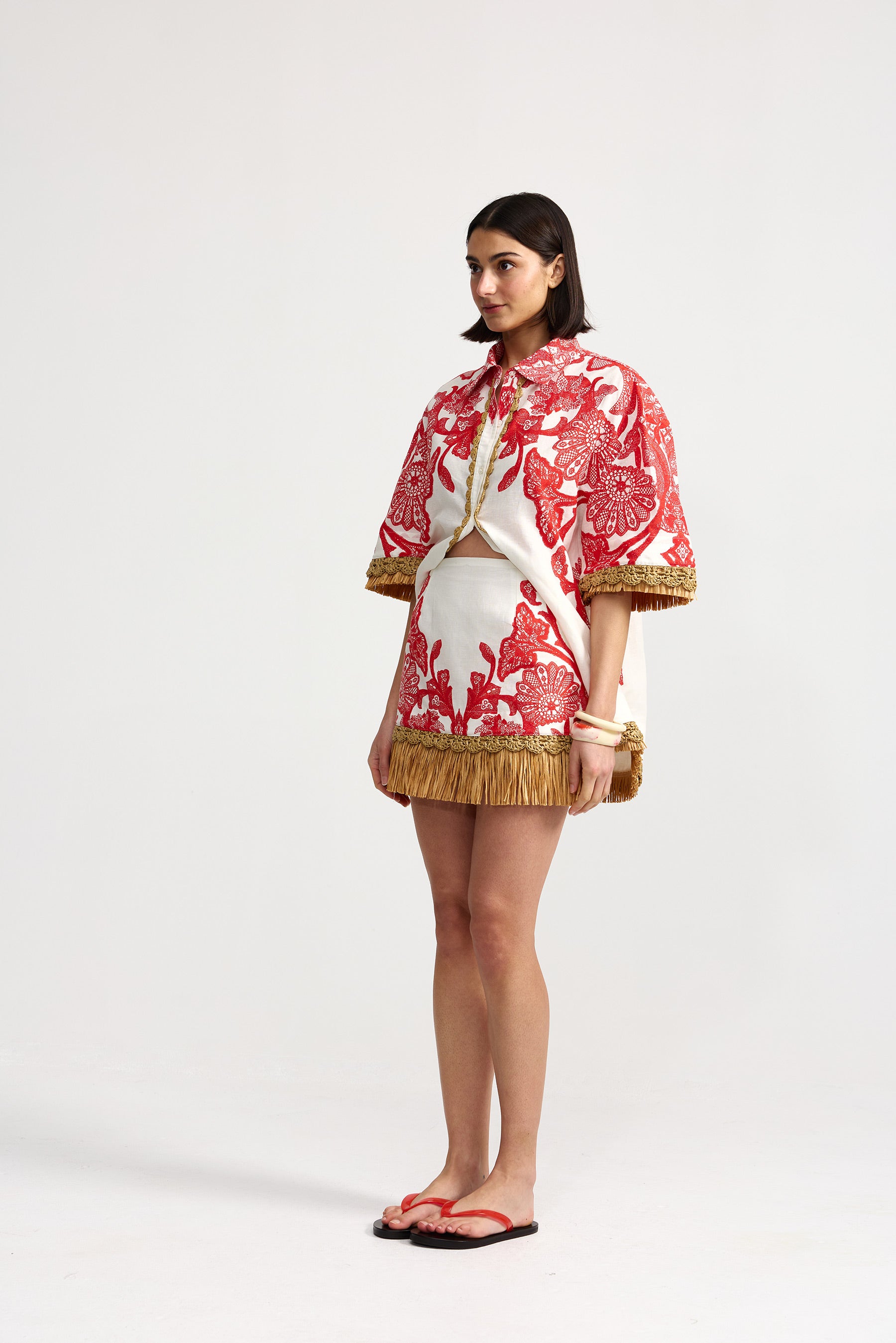 Aston Studio Amity Skirt in Ruby Antique. Turn heads wherever you go in the Amity Skirt Ruby Antique. The considered ruby lace placement print and raffia-trimmed hem make it a piece that turns heads. Wear it with a simple top to let the skirt shine, or style boldly with the matching Remy Shirt.