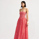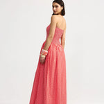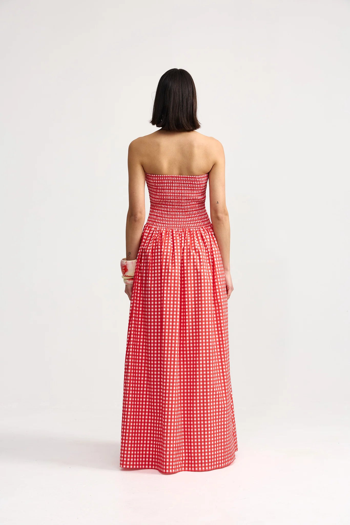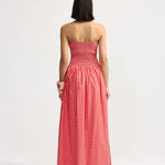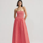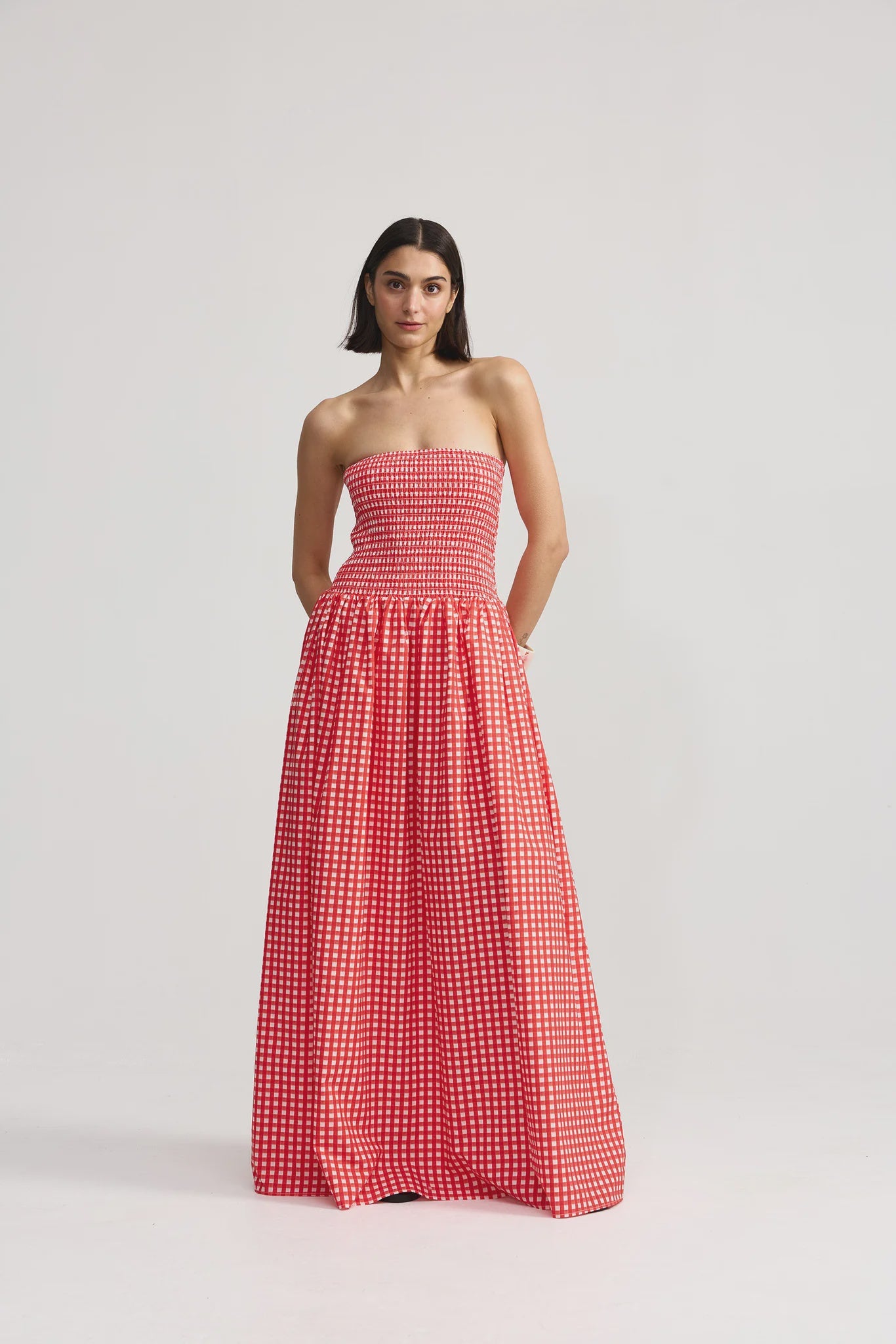 Aston Studio Layla Dress in Ruby Gingham. The Layla Dress Ruby Gingham features a shirred bodice and full skirt offering a form fitting silhouette and a flowing body for effortless movement. This cotton dress is perfect for daytime events, garden parties, or casual chic styling.