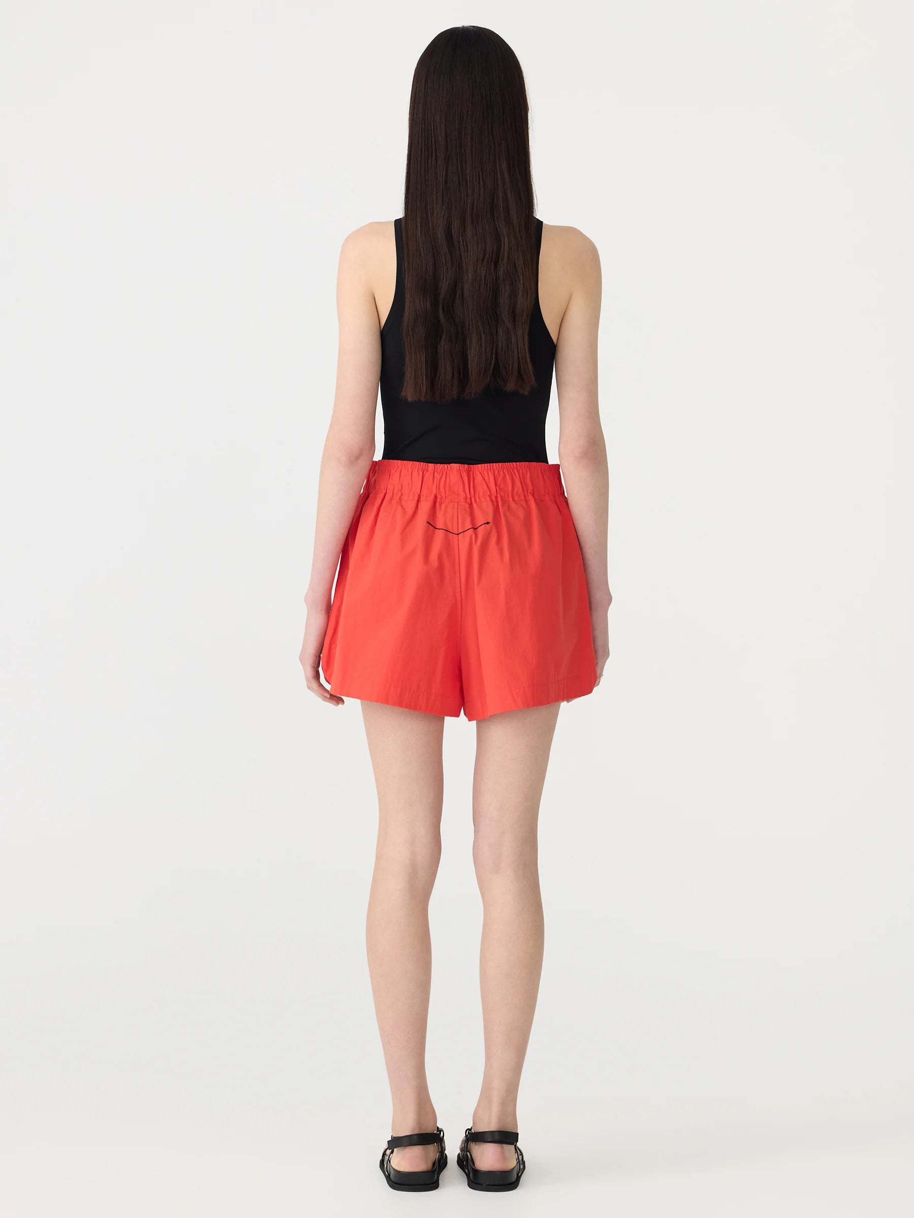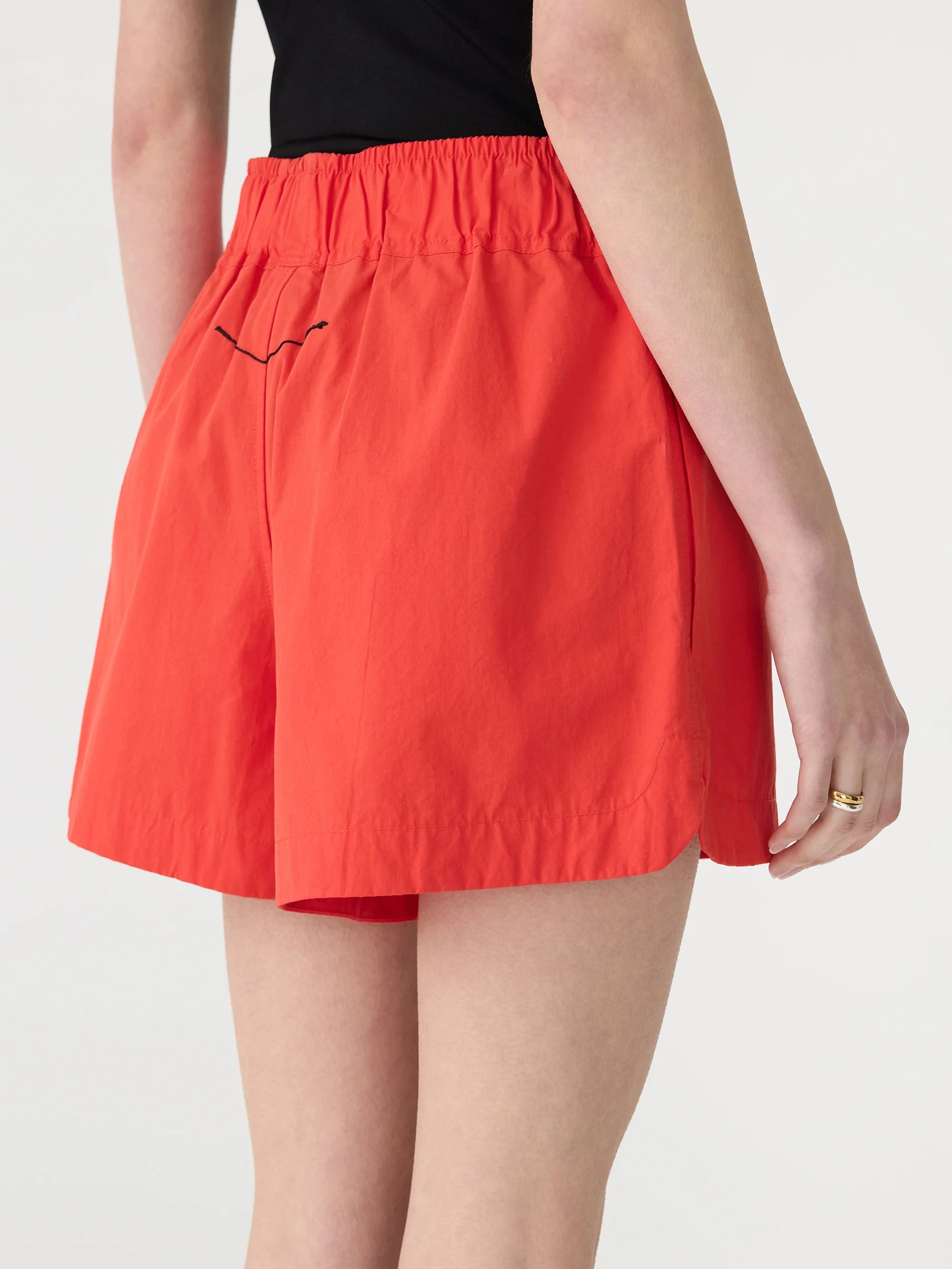 Bassike Crushed Cotton Tennis Short in Red. Crafted from lightweight compact cotton with a natural crushed texture, the Crushed Cotton Tennis Short is designed with a wide elasticated waistband for ease and comfort. Featuring side entry pockets, curved hem side splits and finished with signature Bassike branded topstitching at the back.