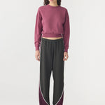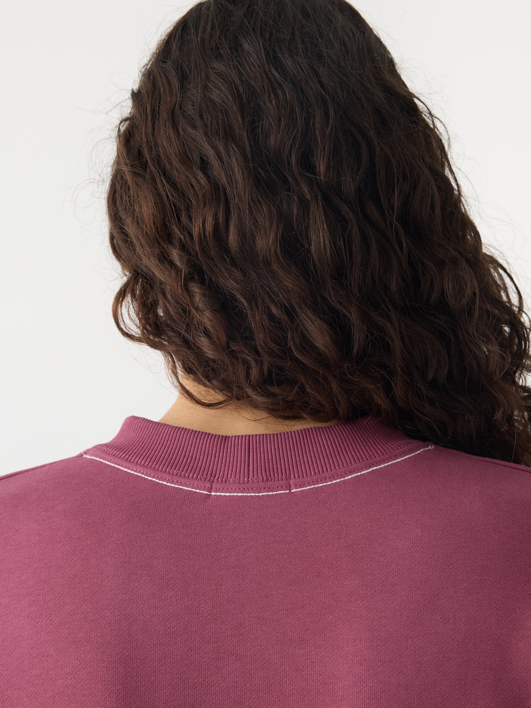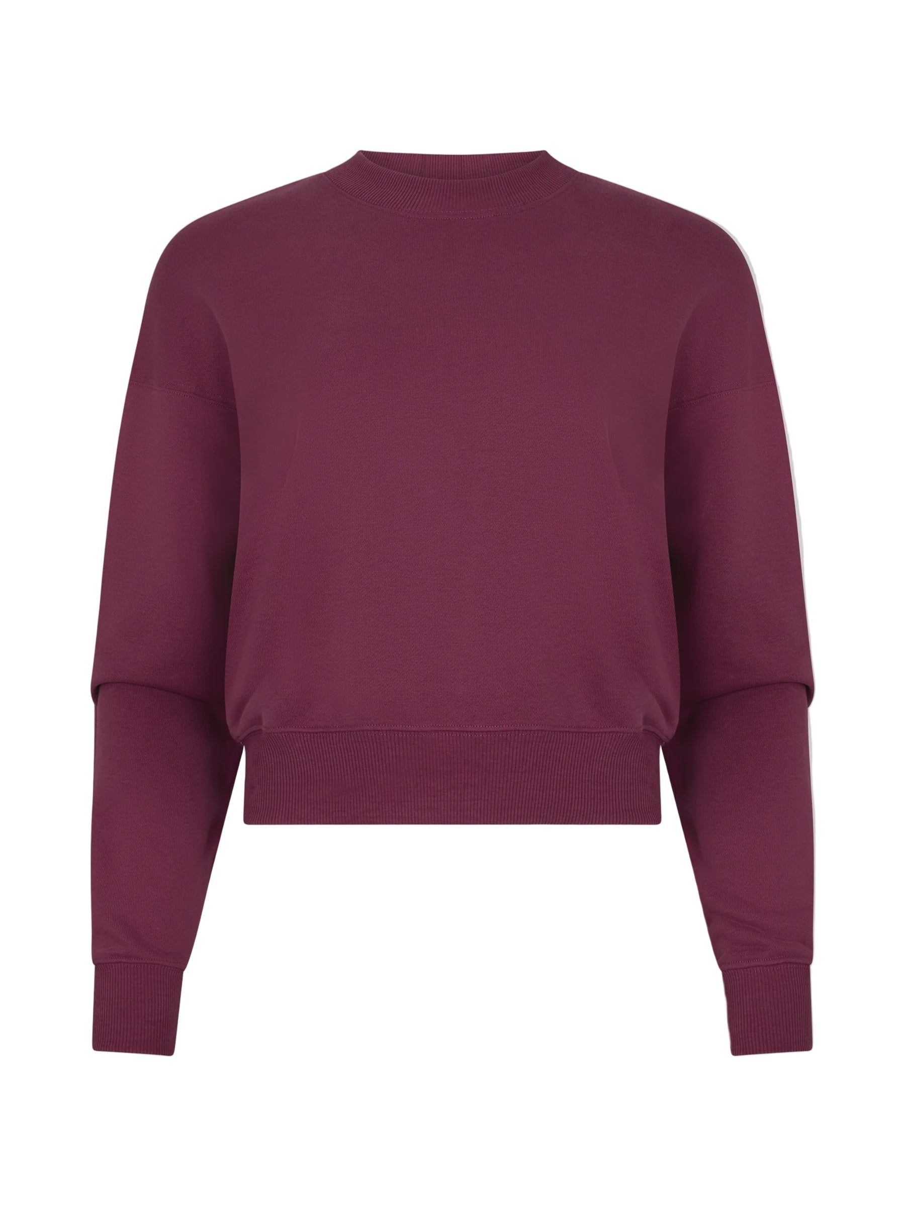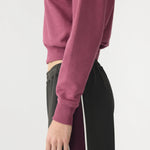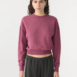 Bassike Fleece Baby Sweat in Faded Plum. A wardrobe essential, the Fleece Baby Sweat is designed for a slim fit with a cropped silhouette. Crafted from lightweight unbrushed cotton fleece, it features rib finishes at the cuffs, hem and neckline. Finished with straddle stitch detailing, a single-layered back yoke and Bassike’s signature contrast chainstitch at the back neck.