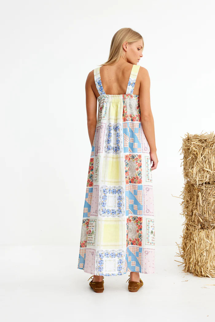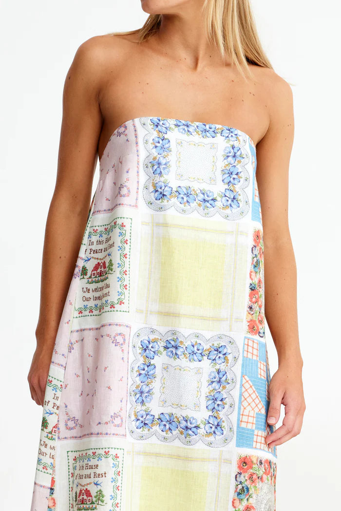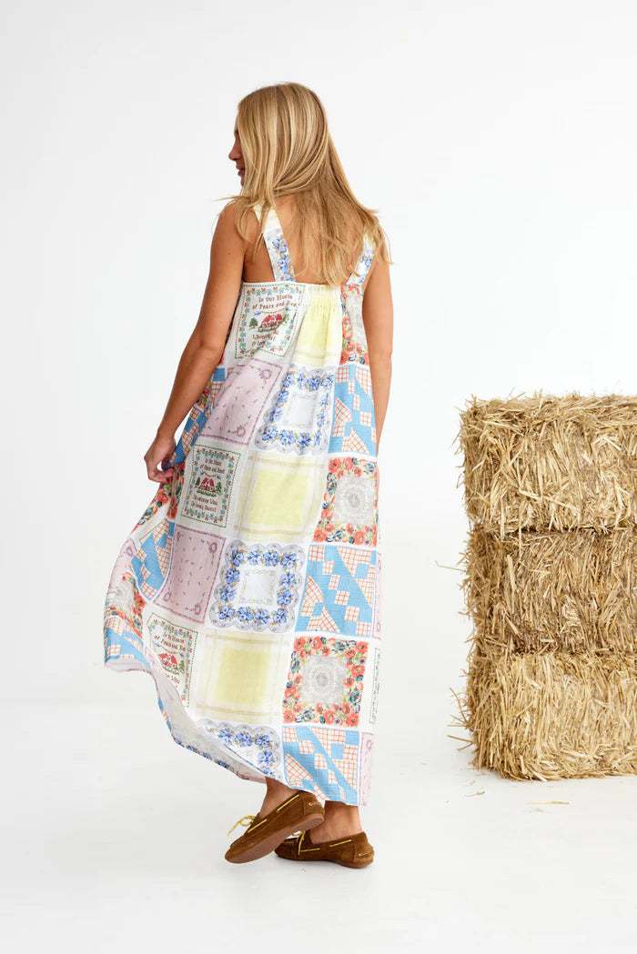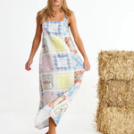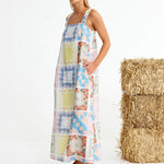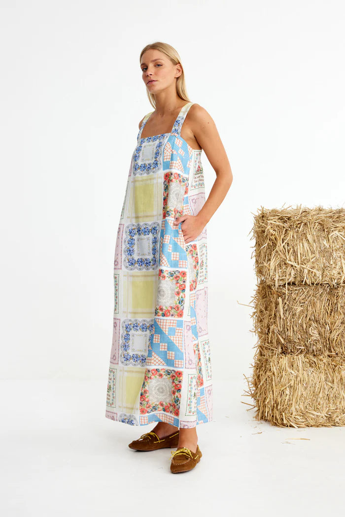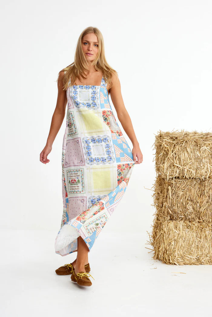 Binny Bending Poles Dress. Bending Poles. For those not famil, its racing your ponies through a series of poles. Excellent. And just as cute simple good fun a sundress stitched with stories. Cut from 100% linen & patterned with a patchwork of daintiest vintage handkerchief designs. Cute as a cucumber. Scallop florals, sweet checks, cross stitched homespun charm. Removable shoulder straps, an elasticated back, deep side pockets keep it easy & unfussy, whether you’re leaning on the fence rail or festivals, footloose & fancy free. The kind of dress that says you’ve inherited both style & a trunkful of tales.