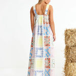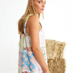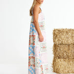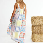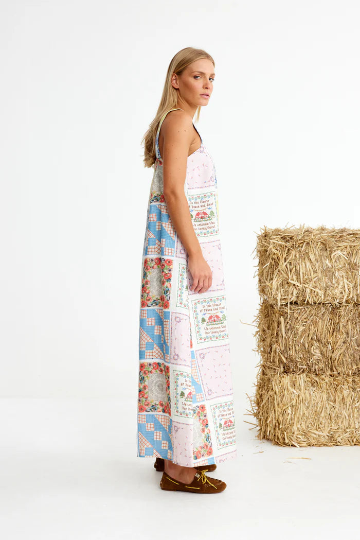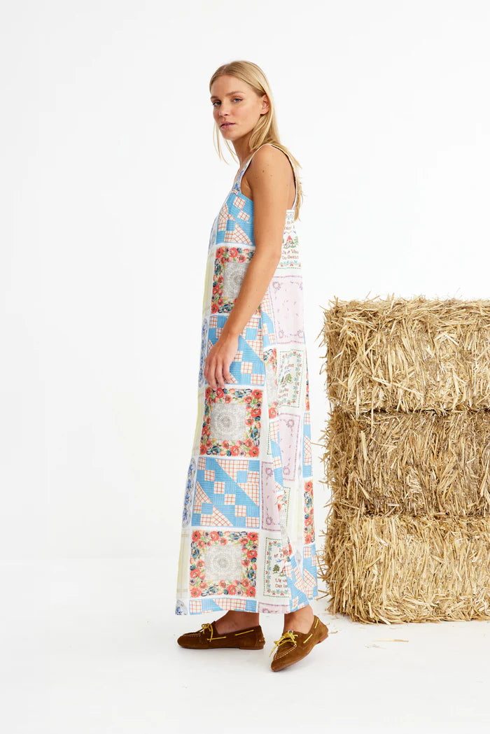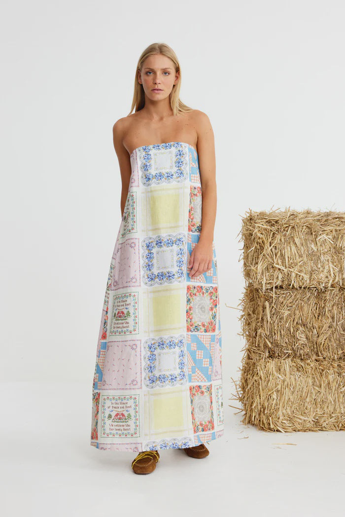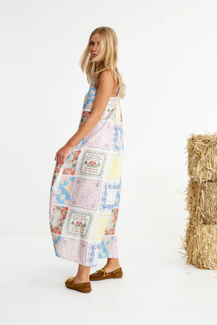 Binny Bending Poles Dress. Bending Poles. For those not famil, its racing your ponies through a series of poles. Excellent. And just as cute simple good fun a sundress stitched with stories. Cut from 100% linen & patterned with a patchwork of daintiest vintage handkerchief designs. Cute as a cucumber. Scallop florals, sweet checks, cross stitched homespun charm. Removable shoulder straps, an elasticated back, deep side pockets keep it easy & unfussy, whether you’re leaning on the fence rail or festivals, footloose & fancy free. The kind of dress that says you’ve inherited both style & a trunkful of tales.