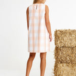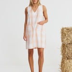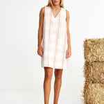 Binny Galloping Shift Dress. Galloping is all about freedom of movement - in dress form. Imagine you are in a typical Aussie peak summer day hitting forty degrees for weeks on end. In airy 100% cotton with a soft peach plaid, it feels as light as a summer breeze. V-neck keeps things sharp, straight, mini shift cut is easy to slip on and even easier to style—barefoot (hopefully not pregnant in this weather but would work brilliant also for that sitch) loafers in town, or espadrilles for an afternoon drink. No reins required.