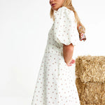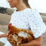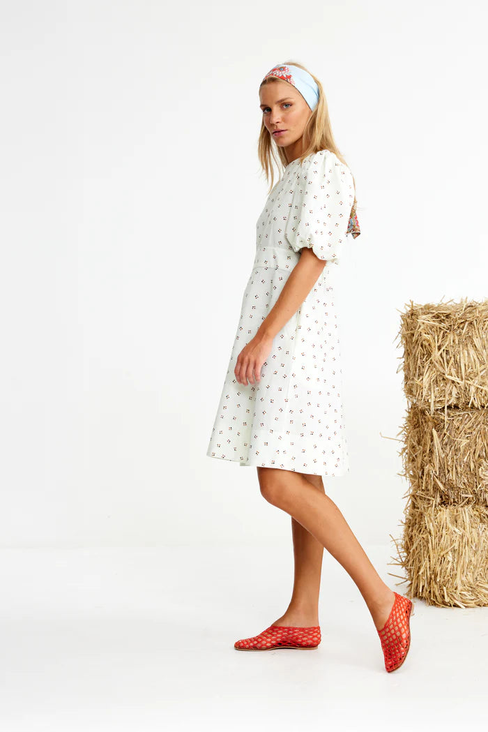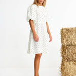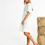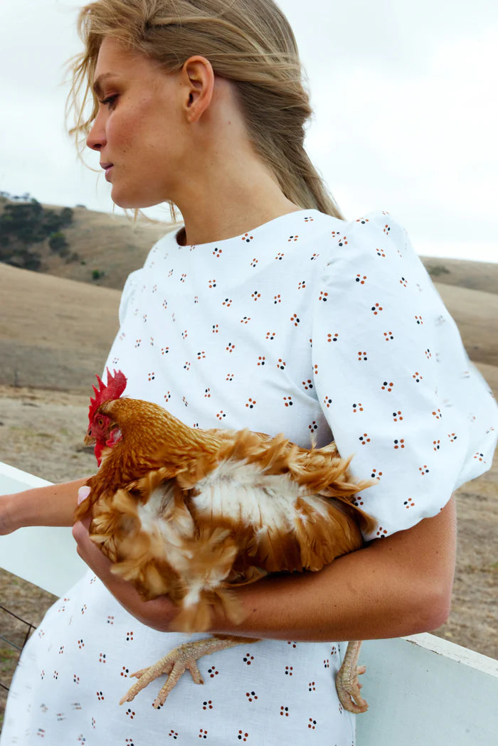 Binny Galloway Dress. The GALLOWAY is a size and also an extinct horse breed, once native to England. It was said to have "good looks, a wide, deep chest and a tendency to pace rather than trot." Sounds like pretty much most of our friends. Here in, we bring the namesake sweetest little cotton linen summer dress. Fully lined, ditsy scattered spots, puff sleeves & knee length. Pockets, elaccy in the backy.