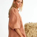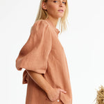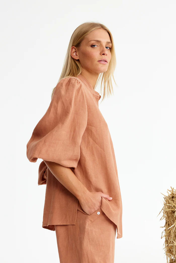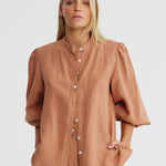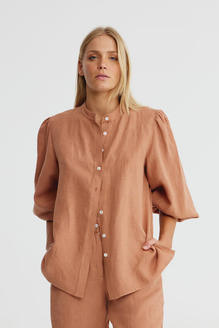 Binny Leather Shirt in Choc Mousse. Whether you’re saddling up for serious business or just trotting into your day, LEATHER is your trusty all-rounder. Cut in airy European linen with a flattering curved hem, it’s finished with gathered sleeves you can push up for nonchalance. Available in classic white (think show-pony polish) or rich choc mocha brown (pure paddock chic). Wear loose for a casual canter or half french or full tuck in for a dressage-level finish - either way, you’ll be the mane attraction.