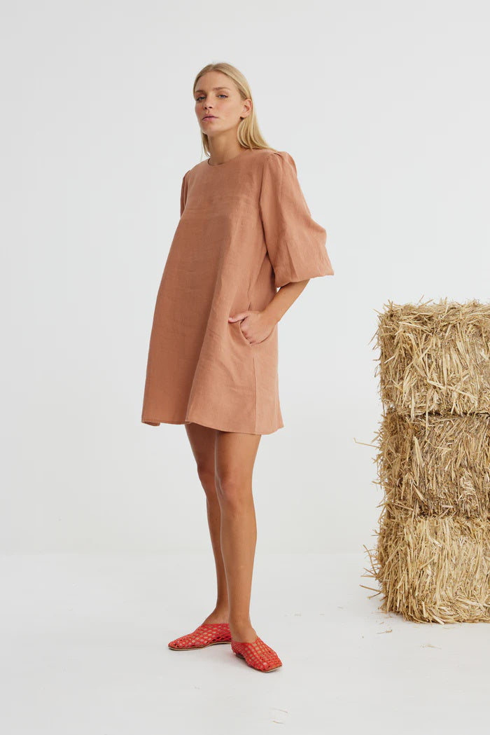 Binny Rupert Campbell-Black Dress in Choc Mousse. The kind of dress you’d wear for champagne brunch, a gallop across the estate with Rupert. In 100% European linen, this knee-length shift features ruched, elasticated sleeves for a touch of puffy sleeve, side pockets & a self-tie belt to pull yourself together. Available in mocha mouse and crisp white - because a Campbell-Black never shows up underdressed, no matter the occasion. Just add excellent footwear & cool earrings. Keep calm & carry on.