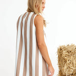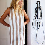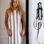 Binny Sugarlumps Shift Dress. There is something very lovely about a extremely large whiskery nose very gently (or not) nibbling sugar lumps out of your palm. As equally if not alot more special as high tea at a very traditional fabulous hotel in the tropics complete with white tablecloths, sugar cube tongs, linen tablecloths and your tea poured. We love both but know what we prefer. As much as we love a simple shift dress in mocha & cream stripes this summer. Classic, timeless & perfect for hot weather. Add a blazer if you need to smarten up.