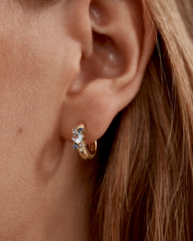 Huggie style hoops featuring a cluster of blue-green hued gemstones in a claw setting.